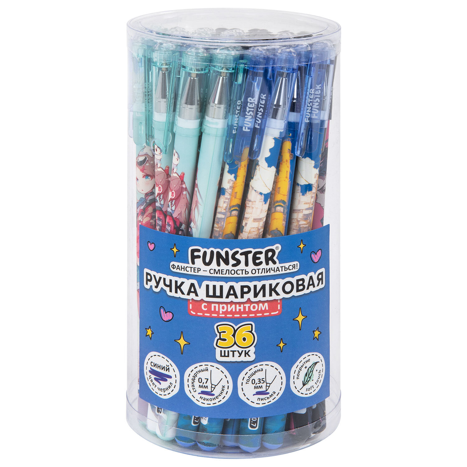Ручка шариковая с принтом FUNSTER (ФАНСТЕР) STICK "ANIME", СИНЯЯ, SOFT TOUCH покрытие, узел 0,7 мм, линия 0,35 мм Код товара: 144392 49,1 ₽ Купить Производитель:FUNSTER Шариковая ручка FUNSTER STICK "ANIME" – это универсальный инструмент для ведения записей и источник вдохновения на каждый день. Дизайн в стиле аниме – как будто из Токио! Шариковая ручка в круглом корпусе с покрытием soft-touch мягко ложится в руке, за счет чего процесс письма становится более комфортным. Аккуратная линия письма 0,35 мм достигается за счет стандартного наконечника диаметром 0,7 мм. Конструкция колпачка дополнена клипом, который позволяет закрепить ручку на тетради или папке без опасений забыть или потерять. За счет синих чернил ручка подходит как для школьников и студентов, так и для офисных сотрудников.Производство: КитайЦвет чернил: синийКоличество в комплекте: 1 шт.Толщина линии письма: 0.35 ммДиаметр пишущего узла: 0.7 ммФорма наконечника: стандартныйДлина сменного стержня: 140 ммСерия: STICK С ПРИНТОМСтиль: с рисункомЦвет корпуса: ассортиДлина письма: 1000 мДизайн: AnimeФорма корпуса: круглаяПокрытие корпуса: Soft-touchУпаковка: пластиковая тубаСрок годности: 60 месВес: 8 грРазмер упаковки: 1 × 15 × 1.3 смПромежуточная упаковка: 36 штТранспортная упаковка: 288 штШтрих-код: 4606224469126 Файлы Сертификат-1.jpg Сертификат-2.jpg Сертификат-3.jpg Сертификат-4.jpg