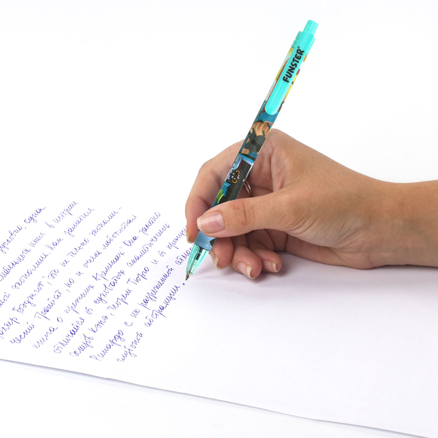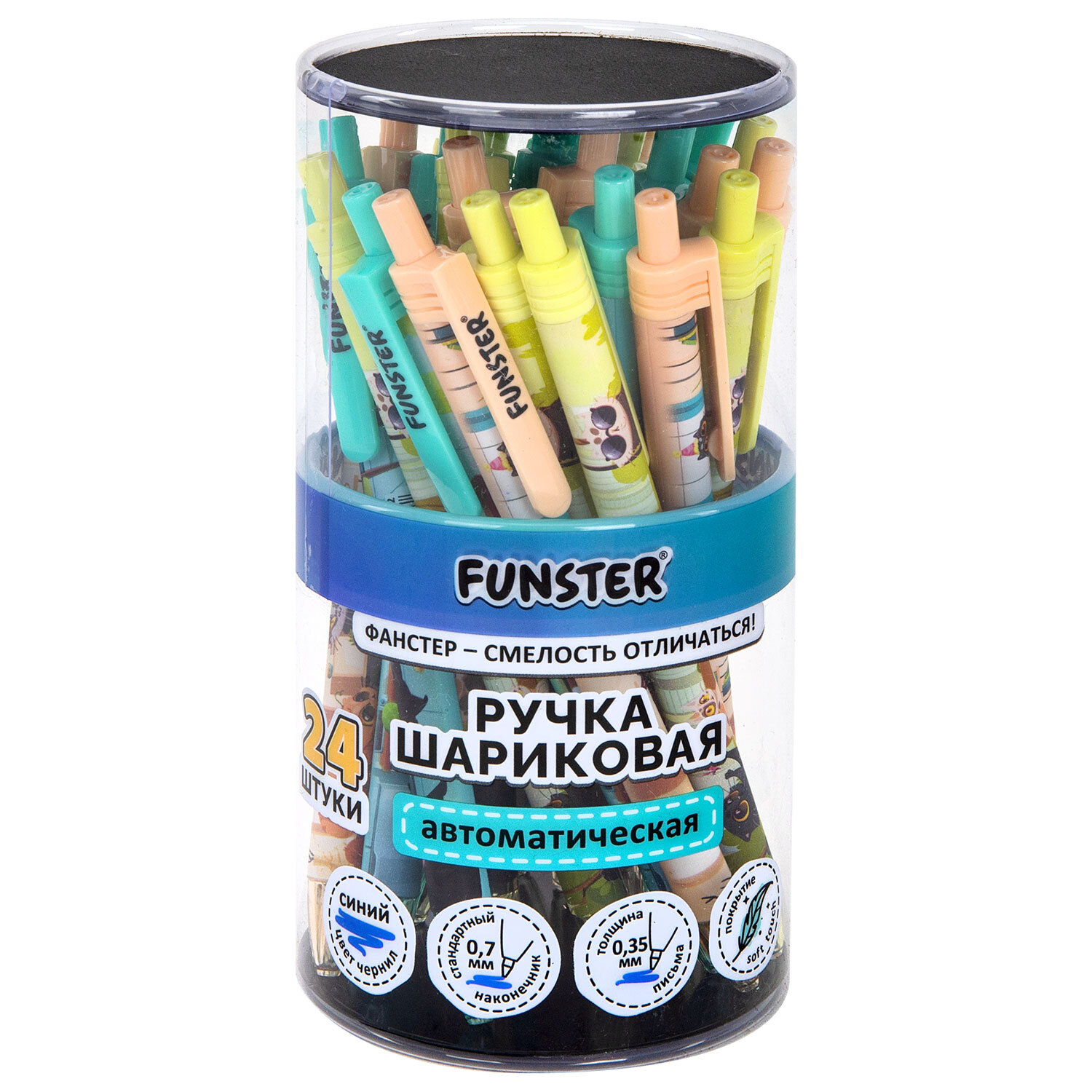 Ручка шариковая автоматическая с принтом FUNSTER (ФАНСТЕР) "CUTE ANIMALS", корпус soft-touch, СИНЯЯ, узел 0,7 мм, линия 0,35 мм Код товара: 144402 46,78 ₽ Купить Производитель:FUNSTER Ручка шариковая автоматическая FUNSTER "CUTE ANIMALS" – яркий и надежный пишущий инструмент для ежедневного использования. Ручка перенесет важные заметки на бумагу, а красочный дизайн с милыми животными вдохновит на новые идеи. Ручка представлена в круглом корпусе, дополненном покрытием soft-touch, которое делает процесс письма комфортным и удобным и позволяет писать на протяжении долго времени без усталости. Стандартный наконечник диаметром 0,7 создает аккуратную линию письма толщиной 0,35 мм. Синий цвет чернил универсален для деловой и учебной деятельности.Производство: КитайЦвет чернил: синийТолщина линии письма: 0.35 ммДиаметр пишущего узла: 0.7 ммФорма наконечника: стандартныйДлина сменного стержня: 107 ммКоличество в комплекте: 1 шт.Цвет корпуса: Cute animalsДлина письма: 1000 мСерия: PRINT RTДизайн: Cute animalsФорма корпуса: круглаяПокрытие корпуса: Soft-TouchУпаковка: пластиковая тубаСрок годности: 60 месВес: 10 грРазмер упаковки: 1 × 14.4 × 1.4 смОбъём: 0.0001 м3Промежуточная упаковка: 24 штТранспортная упаковка: 864 штШтрих-код: 4606224468990 Файлы Сертификат-1.jpg Сертификат-2.jpg