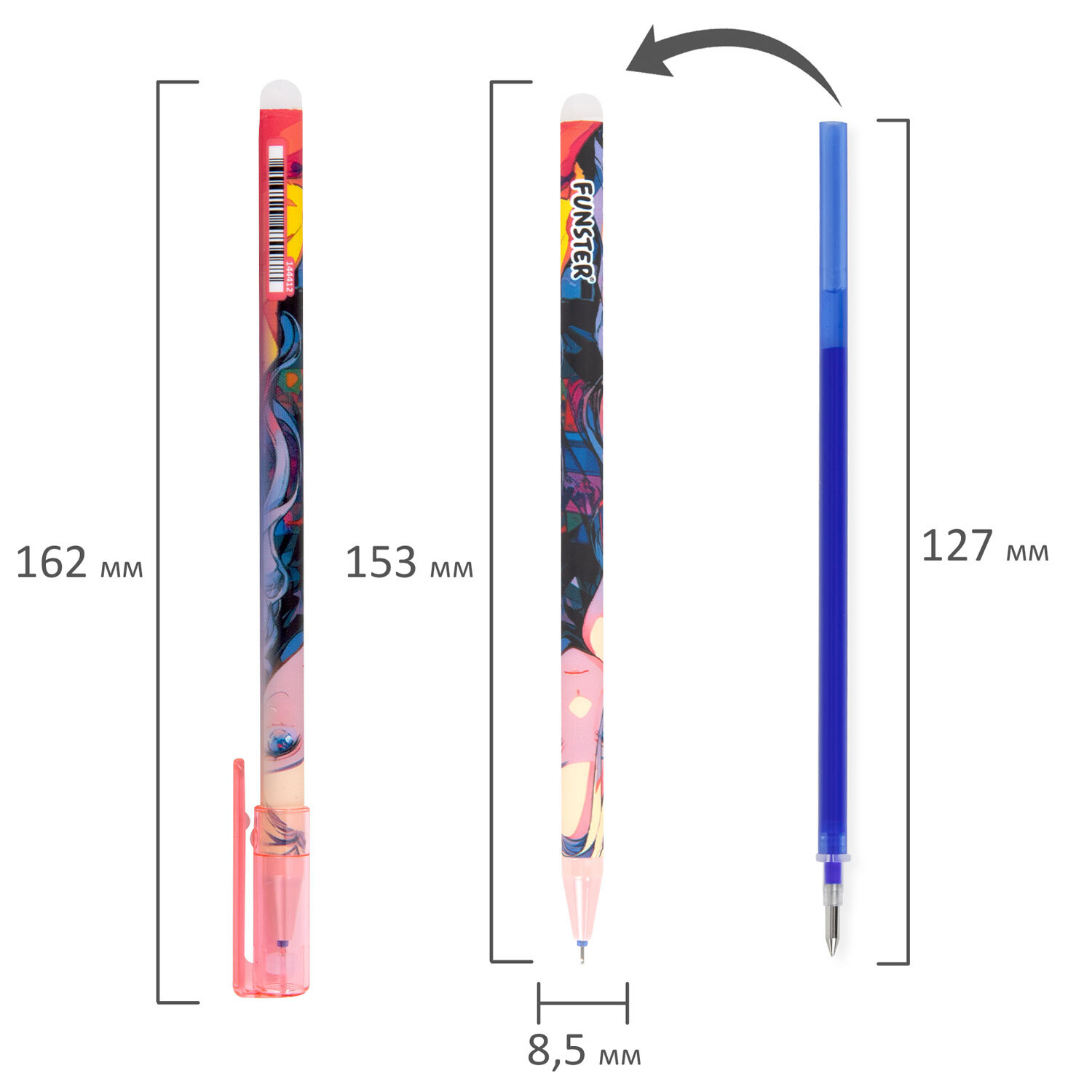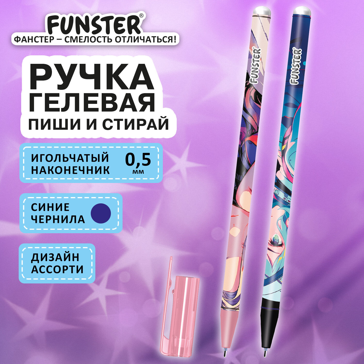 Ручка стираемая гелевая с принтом FUNSTER (ФАНСТЕР) "ANIME", СИНЯЯ, корпус ассорти, игольчатый наконечник 0,5 мм, линия 0,35 мм Код товара: 144412 43,36 ₽ Купить Производитель:FUNSTER Стираемая гелевая ручка FUNSTER "ANIME" – универсальный помощник для ведения аккуратных записей за счет обесцвечивающихся термочернил и специального ластика, позволяющего вносить корректировки в текст сразу после написания. Ручка представлена в ярких ассорти дизайнах с персонажами аниме, которые привлекают внимание яркими деталями. Специальные гелевые чернила синего цвета мягко и плавно ложатся на бумагу, а при нагревании становятся невидимыми. Нагрев достигается ластиком, встроенным в корпус ручки. При трении бумага не повреждается, поэтому исправления выглядят незаметными. Пишущий узел 0,5 мм обеспечивает тонкую линию письма 0,35 мм.Производство: КитайЦвет чернил: синийКоличество в комплекте: 1 шт.Толщина линии письма: 0.35 ммФорма наконечника: игольчатыйСерия: STICK С ПРИНТОМТип ручки: гелеваяСтираемые чернила: даДиаметр пишущего узла: 0.5 ммСтирание чернил: стирательной резинкойДлина сменного стержня: 127 ммКомплектация: без запасных стержнейЦвет корпуса: неоновый ассортиФорма корпуса: круглаяПокрытие корпуса: -Упаковка: пластиковая тубаСрок годности: 60 месВес: 9 грРазмер упаковки: 1 × 15.7 × 1.4 смПромежуточная упаковка: 36 штТранспортная упаковка: 1728 штШтрих-код: 4606224470078 Сертификат-1.jpg Сертификат-2.jpg