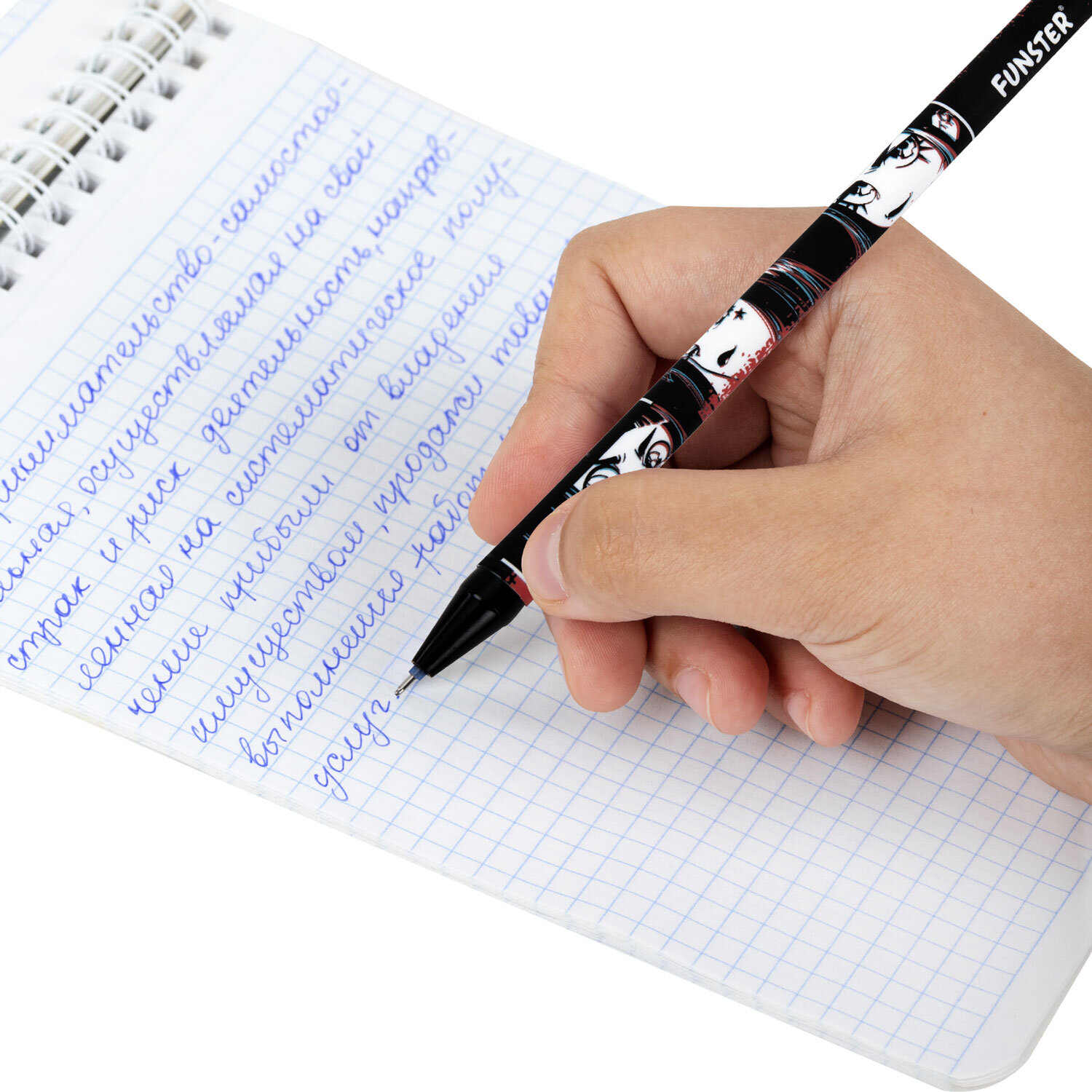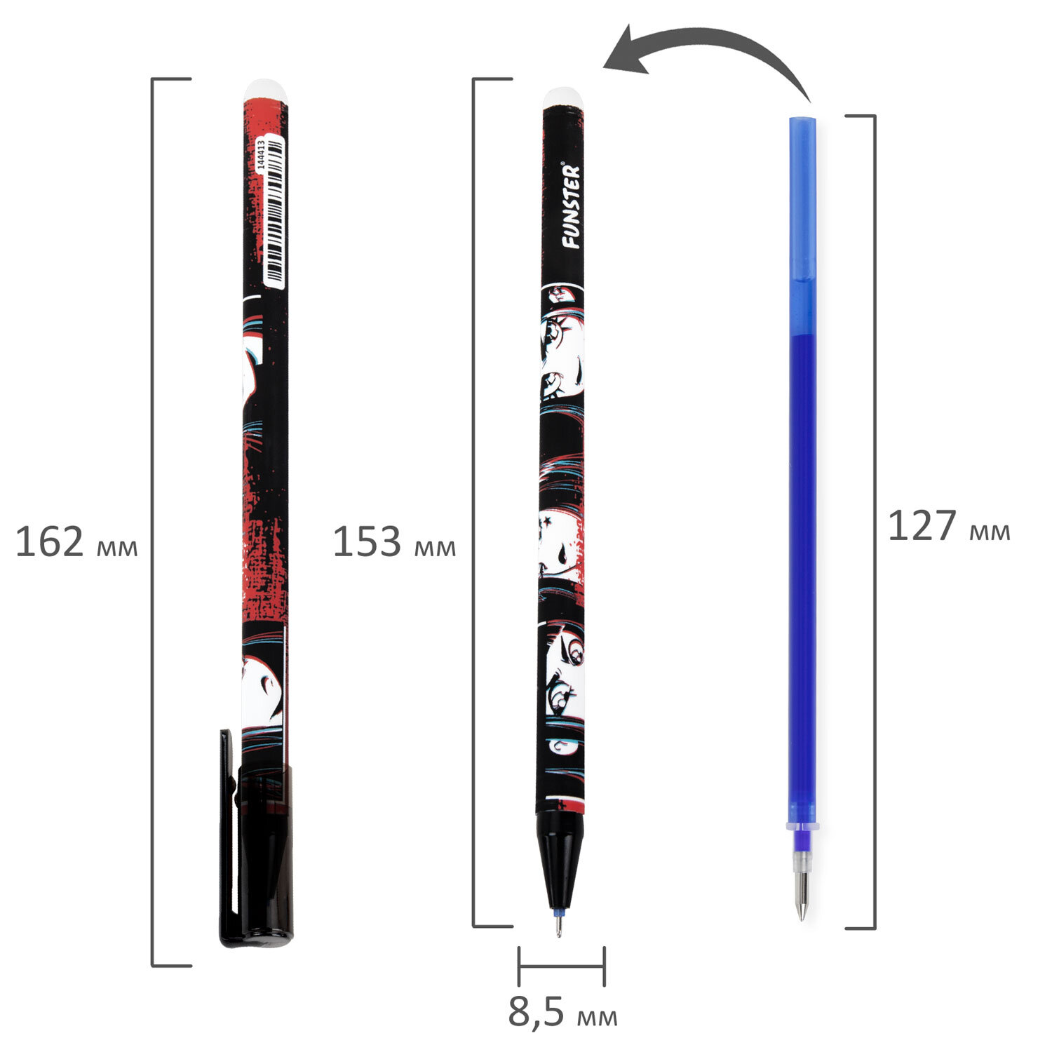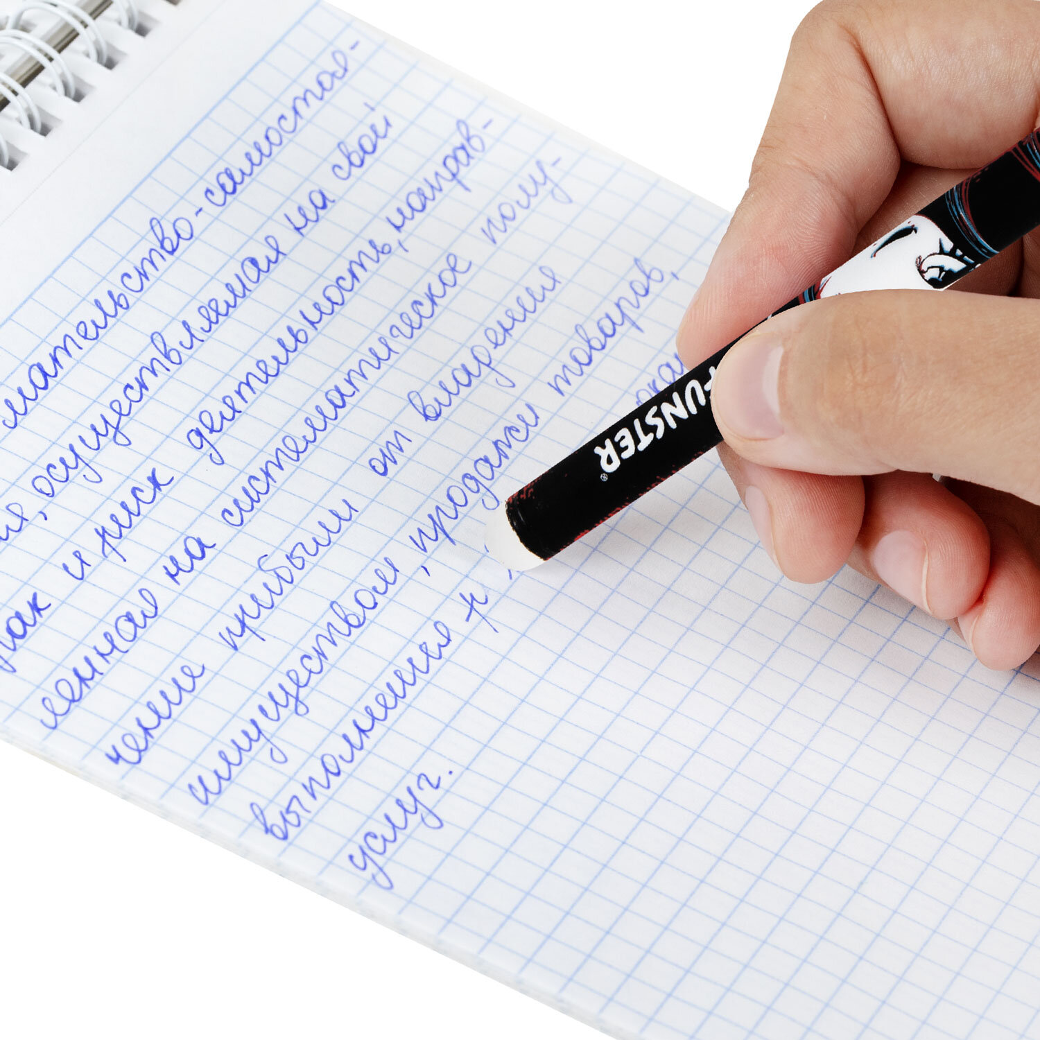 Ручка стираемая гелевая с принтом FUNSTER (ФАНСТЕР) "MANGA ANIME", СИНЯЯ, корпус ассорти, игольчатый наконечник 0,5 мм, линия 0,35 мм Код товара: 144413 43,36 ₽ Купить Производитель:FUNSTER Стираемая гелевая ручка FUNSTER "MANGA ANIME" – универсальный помощник для ведения аккуратных записей за счет обесцвечивающихся термочернил и специального ластика, позволяющего вносить корректировки в текст сразу после написания. Ручка представлена в ассорти дизайнах с персонажами аниме, которые привлекают внимание проработанными деталями. Специальные гелевые чернила синего цвета мягко и плавно ложатся на бумагу, а при нагревании становятся невидимыми. Нагрев достигается ластиком, встроенным в корпус ручки. При трении бумага не повреждается, поэтому исправления выглядят незаметными. Пишущий узел 0,5 мм обеспечивает тонкую линию письма 0,35 мм.Производство: КитайЦвет чернил: синийКоличество в комплекте: 1 шт.Толщина линии письма: 0.35 ммФорма наконечника: игольчатыйСерия: STICK С ПРИНТОМТип ручки: гелеваяСтираемые чернила: даДиаметр пишущего узла: 0.5 ммСтирание чернил: стирательной резинкойДлина сменного стержня: 127 ммКомплектация: без запасных стержнейЦвет корпуса: ассортиФорма корпуса: круглаяПокрытие корпуса: -Упаковка: пластиковая тубаСрок годности: 60 месВес: 9 грРазмер упаковки: 1 × 15.7 × 1.4 смПромежуточная упаковка: 36 штТранспортная упаковка: 1728 штШтрих-код: 4606224470085 Сертификат-1.jpg Сертификат-2.jpg