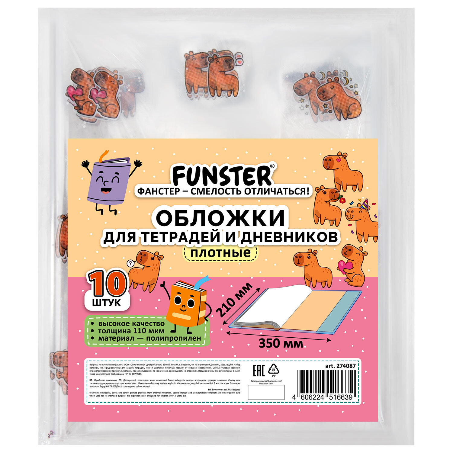 Обложки "CAPYBARAS" для тетрадей и дневников, КОМПЛЕКТ 10 шт., ПЛОТНЫЕ, 210х350 мм, 110 мкм, FUNSTER (ФАНСТЕР) Код товара: 274087 329,67 ₽ Купить Производитель:FUNSTER Яркие и красочные обложки FUNSTER отлично предохраняют тетради и учебники от внешних воздействий, тем самым увеличивая срок их службы и сохраняя прекрасный внешний вид. Предназначены для тетрадей и дневников. Изготовлены из высококачественного полипропилена (ПП) толщиной 110 мкм. Предназначены для тетрадей и дневников. Размер – 210х350 мм. Набор обложек с дизайном из 10 штук. Не содержат вещества, вредные для здоровья детей.Производство: РоссияПредназначены для: дневников, тетрадейРазмер: 210х350 ммКоличество в комплекте: 10 шт.Материал: полипропилен с дизайномТолщина: 110 мкмТип обложки: с дизайномЦвет: прозрачныйДизайн: CAPYBARASНаличие штрихкода на ед. товара: даВес: 82 грРазмер упаковки: 0.4 × 21.7 × 19.7 смОбъём: 0.0002 м3Промежуточная упаковка: 100 штТранспортная упаковка: 100 штШтрих-код: 4606224516639 Сертификат-1.jpg Сертификат-2.jpg Сертификат-3.jpg