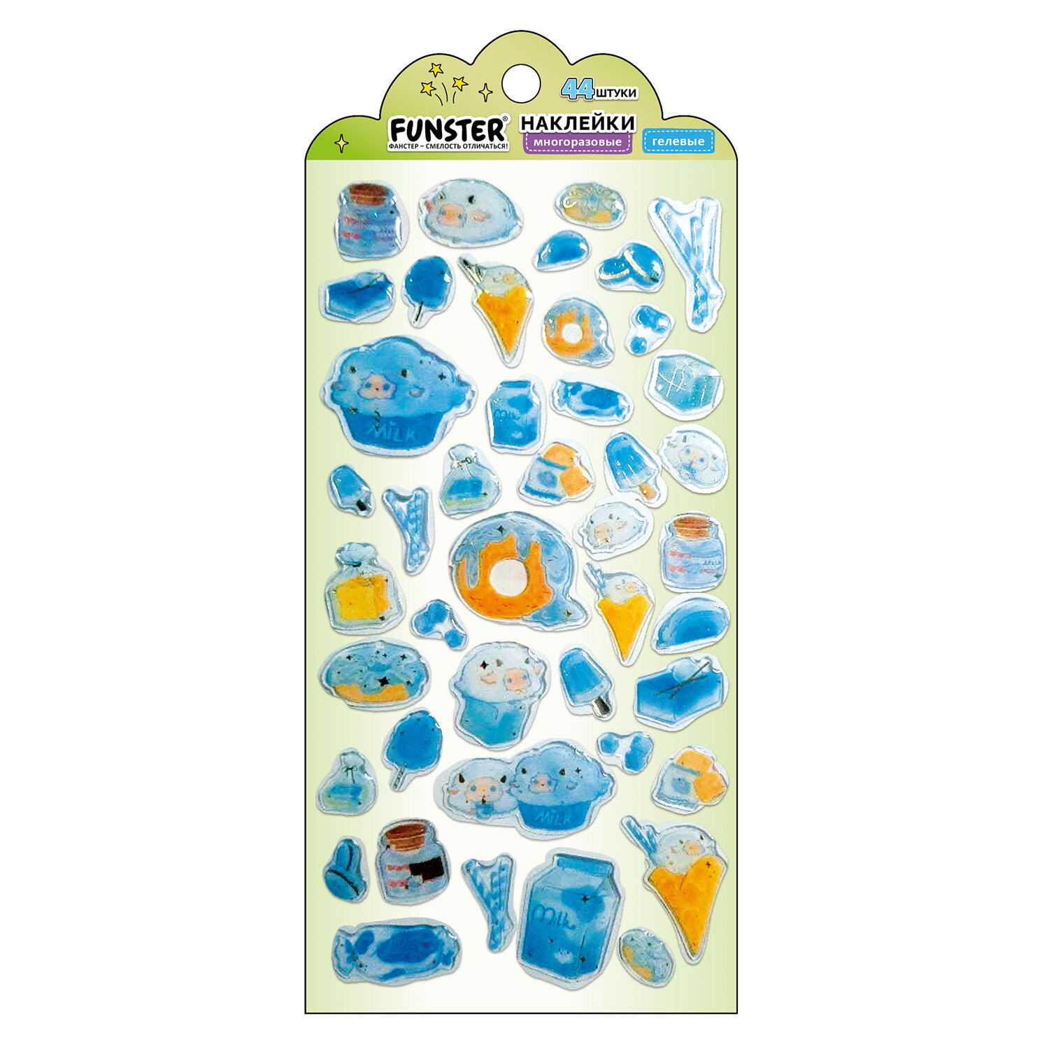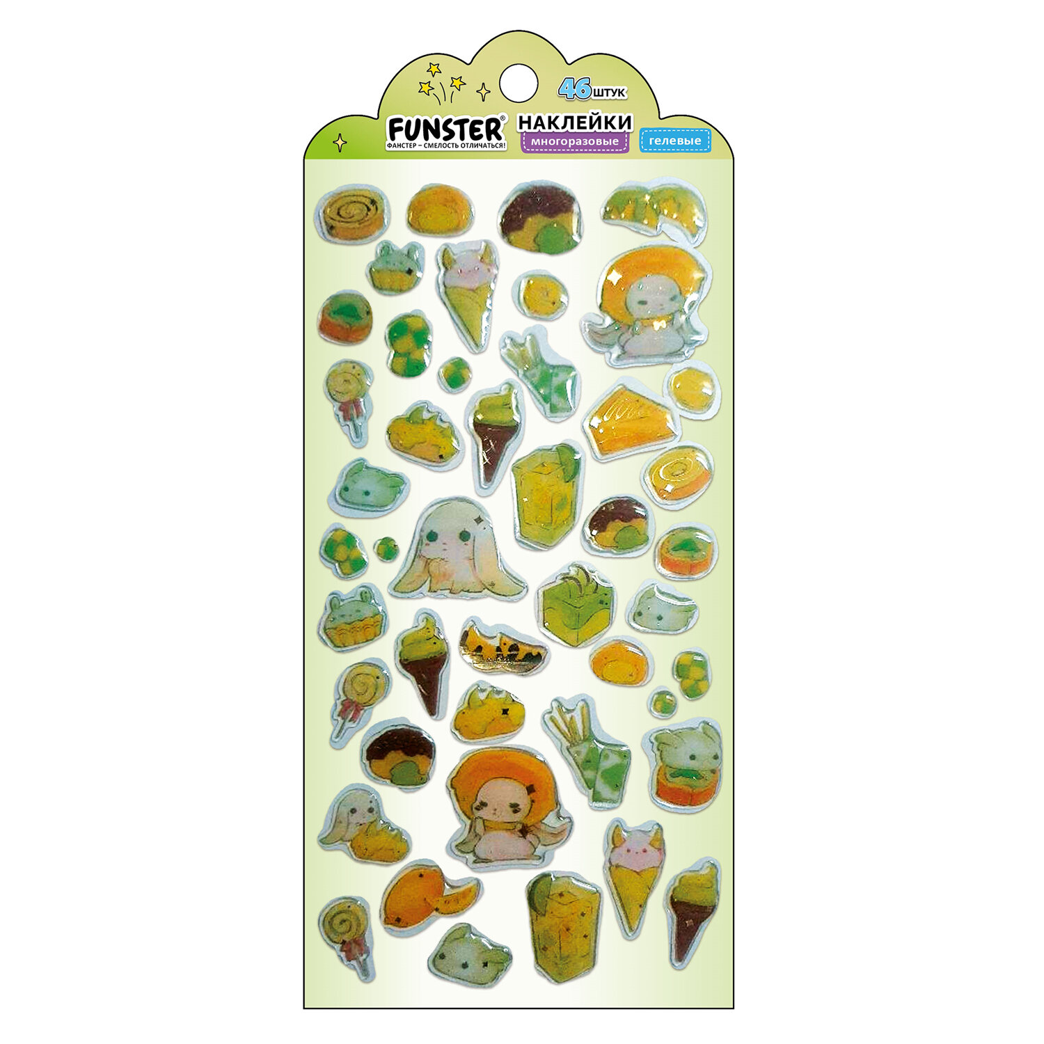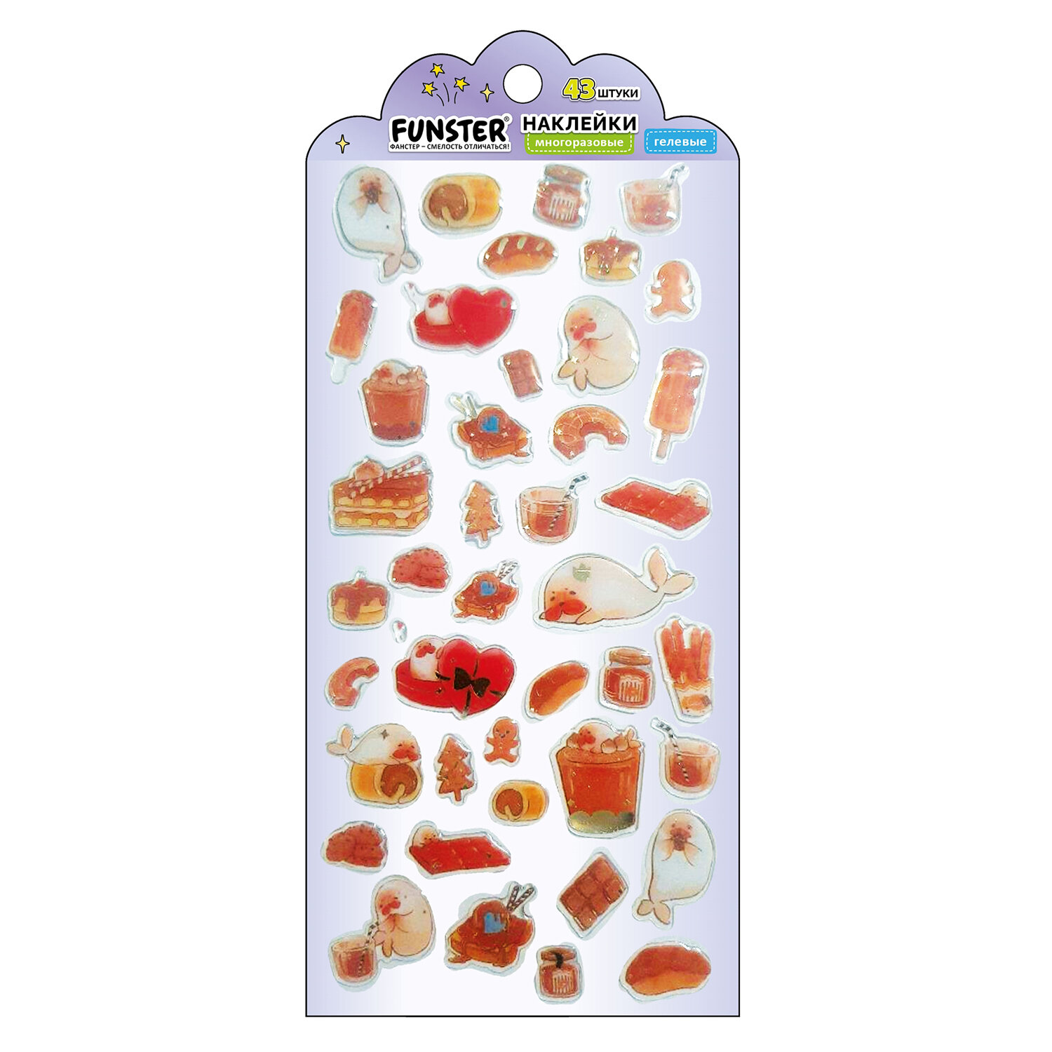 Наклейки гелевые "Аппетитное ассорти", 17,5х9 см, ассорти 6 видов, FUNSTER (ФАНСТЕР) Код товара: 666083 99 ₽ Купить Производитель:FUNSTER Гелевые наклейки FUNSTER - идеальный выбор для творчества! Эти очаровательные наклейки в ярких дизайнах ассорти поднимут настроение и добавят красок в повседневность. Превратите обычные вещи в яркие и милые аксессуары с многоразовыми наклейками! Они легко клеятся на бумагу, картон, пластик, стекло, дерево и другие поверхности, а благодаря качественному клеевому слою их можно переклеивать без следов. В наборе от 41 до 56 наклеек с очаровательными дизайнами аппетитных пирожных, которые особенно понравятся сладкоежкам! Высокое качество печати гарантирует, что наклейки долго остаются яркими и радуют глаз. А гладкая поверхность добавляет тактильного удовольствия!Производство: КитайТип наклеек: гелевыеСерия: ГелевыеТематика: Аппетитное ассортиКоличество наклеек: 46 шт.Тип поверхности наклеивания: любаяОбъемные: даМногократное переклеивание без потери качества: даДлина листа: 175 ммШирина листа: 90 ммМатериал: полимерыВозрастная группа: от 3 летПол ребенка: универсальныеУпаковка: пакет с подвесомСрок годности: 60 месВес: 13 грРазмер упаковки: 0.1 × 20.5 × 9.2 смПромежуточная упаковка: 24 штТранспортная упаковка: 1200 штШтрих-код: 4606224488127 Сертификат-1.jpg Сертификат-2.jpg