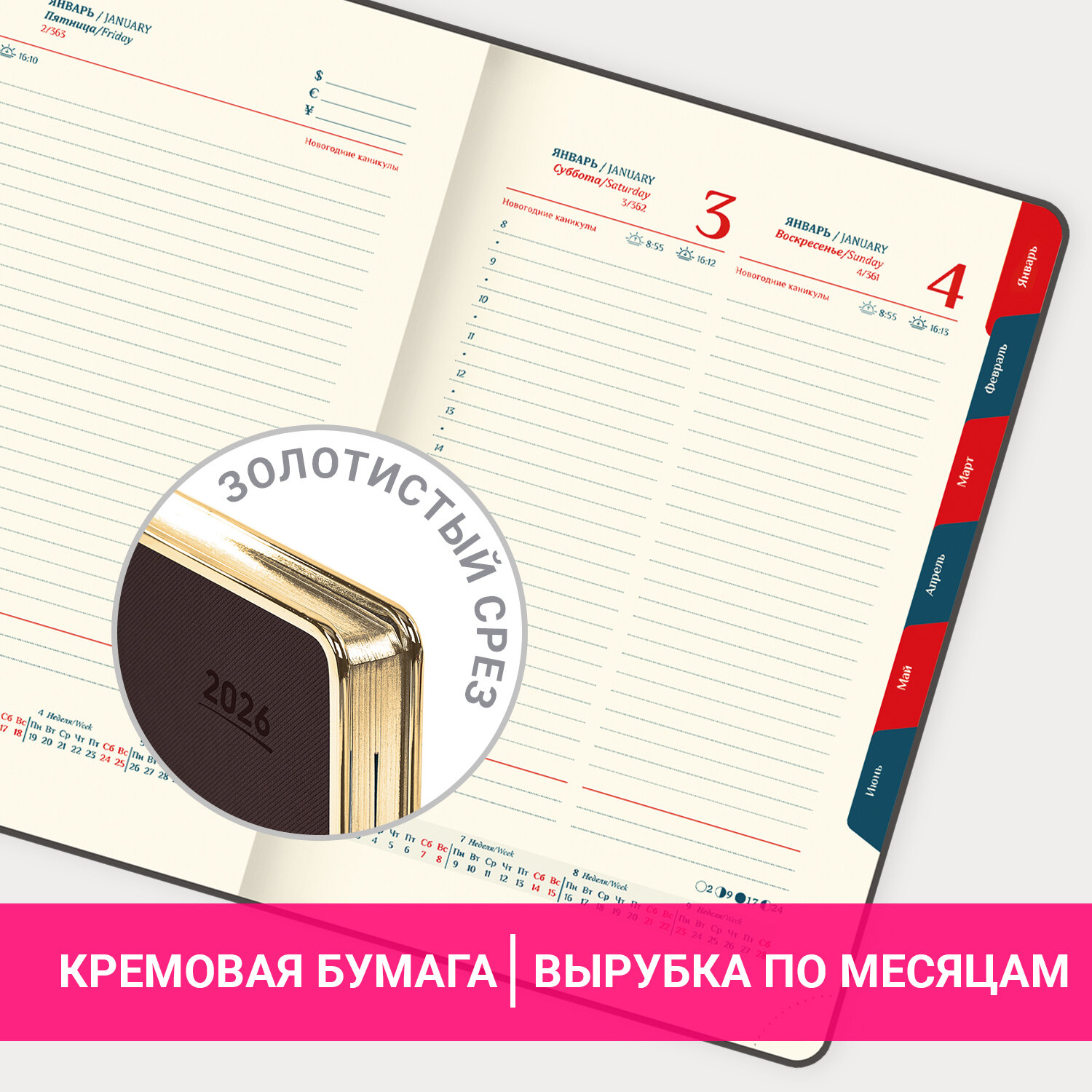 Ежедневник датированный 2026 А5 148х218 мм, GALANT "Infinity Gold", под кожу, темно-коричневый Код товара: 117501 1 259,45 ₽ Купить Производитель:GALANT Датированный ежедневник серии "Infinity Gold" от GALANT – надежный спутник делового человека. Внутренний блок включает 168 листов тонированной бумаги цвета "слоновая кость" плотностью 70 г/м2. Каждая страничка имеет перфорированный угол. Благодаря стандартному формату А5 (148х218 мм) ежедневник удобно использовать как в офисе, так и на выездных деловых встречах. Твердая обложка темно-коричневого цвета выполнена под кожу с отделкой из металлических накладок, что увеличивает ее износоустойчивость. Срез ежедневника покрыт золотой фольгой в цвет металлических накладок, и это придает ему особый шарм. Материал обложки подходит для горячего тиснения. Дополнением является закладка-ляссе, с помощью которой при необходимости можно быстро открыть ежедневник на нужной странице, а также вырубка по месяцам. Ежедневник снабжен обширным справочным материалом. В конце есть 6 страниц для записей и заметок.Производство: КитайТип ежедневника: датированныйФормат: А5Обложка: под кожуВид обложки: твердаяКоличество листов: 168 шт.Особенности: вырубка блока, закладка-ляссе, металлические углы, перфорация уголков, поролоновая прослойка, скругленные углы, справочная информацияСерия: Infinity GoldГод: 2026Тип застежки: нетОсновной цвет обложки: темно-коричневыйДополнительный цвет обложки: нетЦвет среза: золотойЦвет внутреннего блока: кремовыйПлотность внутреннего блока: 70 г/м2Высота строки для записи: 4 ммТип крепления: сшивкаПечать блока: 2 краскиПодходит для блинтового тиснения: даПодходит для тиснения фольгой: даПодходит для заливки полимерной смолой: даДлина: 218 ммШирина: 148 ммТолщина: 20 ммВес: 507 грРазмер упаковки: 2.2 × 21.6 × 15 смОбъём: 0.001 м3Промежуточная упаковка: 15 штТранспортная упаковка: 15 штШтрих-код: 4606224489285 Файлы Сертификат-1.jpg Сертификат-2.jpg Сертификат-3.jpg Сертификат-4.jpg Сертификат-5.jpg Сертификат-6.jpg Сертификат-7.jpg Сертификат-8.jpg Сертификат-9.jpg Сертификат-10.jpg Сертификат-11.jpg Сертификат-12.jpg Сертификат-13.jpg Сертификат-14.jpg Сертификат-15.jpg Сертификат-16.jpg Сертификат-17.jpg Сертификат-18.jpg Сертификат-19.jpg Сертификат-20.jpg Сертификат-21.jpg Сертификат-22.jpg Сертификат-23.jpg Сертификат-24.jpg Сертификат-25.jpg Сертификат-26.jpg