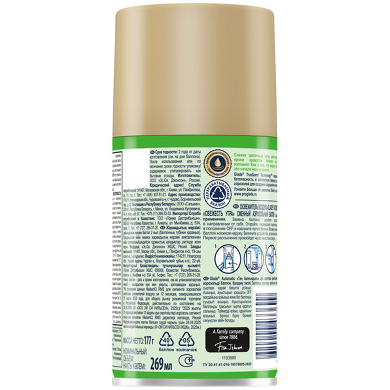 Сменный баллон 269 мл, GLADE "Свежесть утра", для автоматических освежителей, универсальный Код товара: 602185 465,54 ₽ Купить Производитель:GLADE Аромат сменного баллона GLADE "Свежесть утра" с нотами зеленого яблока, весенних цветов и утренней росы подарит заряд бодрости и хорошее настроение на весь день. Универсальный сменный аэрозольный баллон GLADE для автоматического освежителя воздуха. Быстро и эффективно устраняет неприятные запахи. Создан на основе натуральных компонентов. Способ применения: при замене баллона держите устройство в направлении «от себя». Откройте, переведите переключатель в положение OFF и извлеките пустой баллон. Вставьте сменный баллон носиком наружу. Включите устройство, установив таймер. Первое распыление произойдет через несколько секунд. Условия хранения: хранить в сухом, недоступном для детей и домашних животных месте при температуре от -5 С до +35 C, отдельно от пищевых продуктов. Беречь от солнечных лучей, избегать нагревания более 50 С. Срок годности: 2 года от даты изготовления (см. на на дне баллона). После использования или по окончании срока годности упаковку/содержимое аэрозольного баллона утилизировать как бытовые отходы. Состав: более 30%: пропеллент (бутан, пропан, изобутан), денатурат; отдушка (линалоол, бензилбензоат, гексилциннамаль, бутилфенилметилпропиональ, цитронеллол, гераниол)*. *Потенциальные аллергены. Не содержит озоноразрушающих хладонов.Производство: РоссияДиспенсерная система: AIRWICK, GLADE, KSITEXОбъем картриджа: 269 млСерия: REFILLОтдушка: свежестьСрок годности: 24 месВес: 259 грРазмер упаковки: 14.8 × 6.5 × 6.5 смОбъём: 0.0006 м3Промежуточная упаковка: 6 штТранспортная упаковка: 6 штШтрих-код: 4620000433699 Сертификат-1.jpg Сертификат-2.jpg