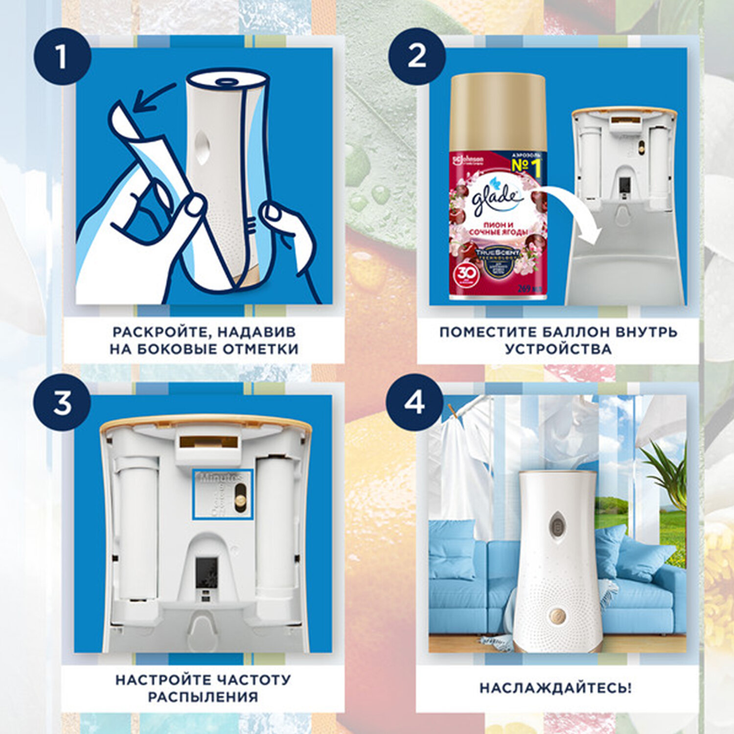 Способ применения: откройте переднюю панель прибора, нажимая на ребристые выступы по бокам. Убедитесь, что переключатель находится в положении OFF. Активируйте батарейки, удалив защитную красную пломбу (только при первом использовании). Снимите крышку со сменного баллона и вставьте его в автоматический распылитель носиком наружу. Выберите желаемый временной интервал распыления с помощью переключателя. Закройте устройство.