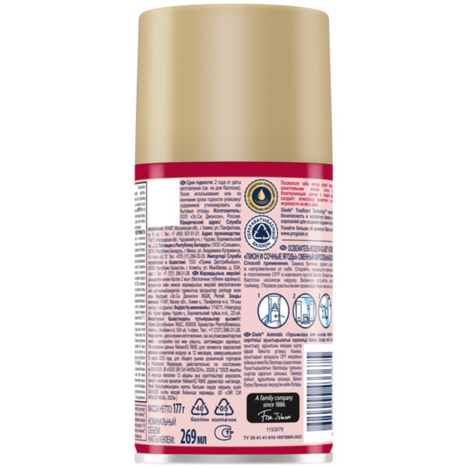 Сменный баллон 269 мл, GLADE "Пион и сочные ягоды" для автоматических освежителей Код товара: 701781 465,54 ₽ Купить Производитель:GLADE Аромат с кокетливыми нотами сочных ягод, благоухающих цветов и сладкой ванили. GLADE гарантирует безопасность и экспертную формулу своих аэрозолей. Способ применения: при замене баллона держите устройство в направлении от себя. Откройте, переведите переключатель в положение OFF и извлеките пустой баллон. Вставьте сменный баллон носиком наружу. Включите устройство, установив таймер. Первое распыление произойдет через несколько секунд. Меры предосторожности: использовать только по назначению согласно инструкции. Не разбирать и не давать детям! Беречь от источников тепла, искр, открытого огня и других источников воспламенения. Не курить. Не распылять вблизи открытого огня или других источников воспламенения. Не нарушать целостности упаковки и не сжигать, даже после использования. Использовать только в хорошо проветриваемых помещениях. Не допускать попадания в глаза. Лицам с повышенной чувствительностью к ароматам применять средство с осторожностью. Использование освежителя воздуха не заменяет надлежащую гигиену. ПРИ ПОПАДАНИИ В ГЛАЗА: осторожно промыть глаза водой в течение нескольких минут. Снять контактные линзы, если вы ими пользуетесь и если это легко сделать. Продолжить промывание глаз. Если раздражение глаз не проходит, обратиться за медицинской помощью. ОПАСНО! Чрезвычайно легковоспламеняющийся аэрозоль. Баллон под давлением. При нагревании возможен взрыв. При попадании в глаза вызывает раздражение. Условия хранения: хранить в сухом, недоступном для детей и домашних животных месте при температуре от -5 до +35 °C, отдельно от пищевых продуктов. Беречь от солнечных лучей, избегать нагревания более 50 °С. Срок действия аэрозоля: 2 года от даты изготовления (см. на на дне баллона). После использования или по окончании срока годности упаковку/содержимое аэрозольного баллона утилизировать как бытовые отходы. Состав: не менее 30%: пропеллент (бутан, пропан, изобутан), денатурат; не более 5%: отдушка (гексилциннамаль, линалоол, цитронеллол, d-лимонен)*. *Потенциальные аллергены. Не содержит озоноразрушающих хладонов. ТУ 20.41.41-016-18578805-2023.Производство: РоссияДиспенсерная система: AIRWICK, GLADE, KSITEXОбъем картриджа: 269 млСерия: REFILLОтдушка: пион и ягодыСрок годности: 24 месВес: 258 грРазмер упаковки: 6.6 × 14.5 × 6.6 смОбъём: 0.0006 м3Промежуточная упаковка: 6 штТранспортная упаковка: 6 штШтрих-код: 4620000433675 Сертификат-1.jpg Сертификат-2.jpg
