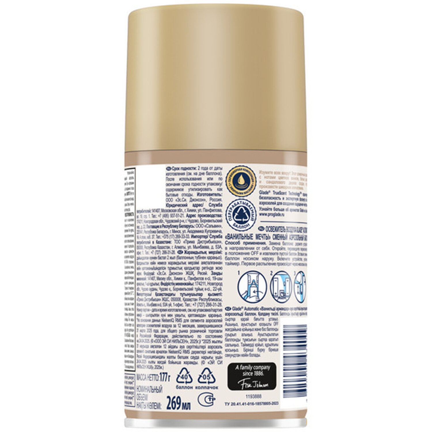 Сменный баллон 269 мл, GLADE "Ванильные мечты" для автоматических освежителей Код товара: 701783 471,06 ₽ Купить Производитель:GLADE Аромат с нотами цветков ванили, белых цветов и сандалового дерева. GLADE гарантирует безопасность и экспертную формулу своих аэрозолей. Способ применения: при замене баллона держите устройство в направлении от себя. Откройте, переведите переключатель в положение OFF и извлеките пустой баллон. Вставьте сменный баллон носиком наружу. Включите устройство, установив таймер. Первое распыление произойдет через несколько секунд. Меры предосторожности: использовать только по назначению согласно инструкции. Не разбирать и не давать детям! Беречь от источников тепла, искр, открытого огня и других источников воспламенения. Не курить. Не распылять вблизи открытого огня или других источников воспламенения. Не нарушать целостности упаковки и не сжигать, даже после использования. Использовать только в хорошо проветриваемых помещениях. Не допускать попадания в глаза. Лицам с повышенной чувствительностью к ароматам применять средство с осторожностью. Использование освежителя воздуха не заменяет надлежащую гигиену. ПРИ ПОПАДАНИИ В ГЛАЗА: осторожно промыть глаза водой в течение нескольких минут. Снять контактные линзы, если вы ими пользуетесь и если это легко сделать. Продолжить промывание глаз. Если раздражение глаз не проходит, обратиться за медицинской помощью. ОПАСНО! Чрезвычайно легковоспламеняющийся аэрозоль. Баллон под давлением. При нагревании возможен взрыв. При попадании в глаза вызывает раздражение. Условия хранения: хранить в сухом, недоступном для детей и домашних животных месте при температуре от -5 до +35 °C, отдельно от пищевых продуктов. Беречь от солнечных лучей, избегать нагревания более 50 °С. Срок действия аэрозоля: 2 года от даты изготовления (см. на на дне баллона). После использования или по окончании срока годности упаковку/содержимое аэрозольного баллона утилизировать как бытовые отходы. Состав: не менее 30%: пропеллент (бутан, пропан, изобутан), денатурат; не более 5%: отдушка (бензилсалицилат, бензиловый спирт, кумарин)*. *Потенциальные аллергены. Не содержит озоноразрушающих хладонов. ТУ 20.41.41-016-18578805-2023.Производство: РоссияДиспенсерная система: AIRWICK, GLADE, KSITEXОбъем картриджа: 269 млСерия: REFILLОтдушка: ваниль и цветыСрок годности: 24 месВес: 261 грРазмер упаковки: 6.6 × 14.4 × 6.6 смОбъём: 0.0006 м3Промежуточная упаковка: 6 штТранспортная упаковка: 6 штШтрих-код: 4620000434009 Сертификат-1.jpg Сертификат-2.jpg