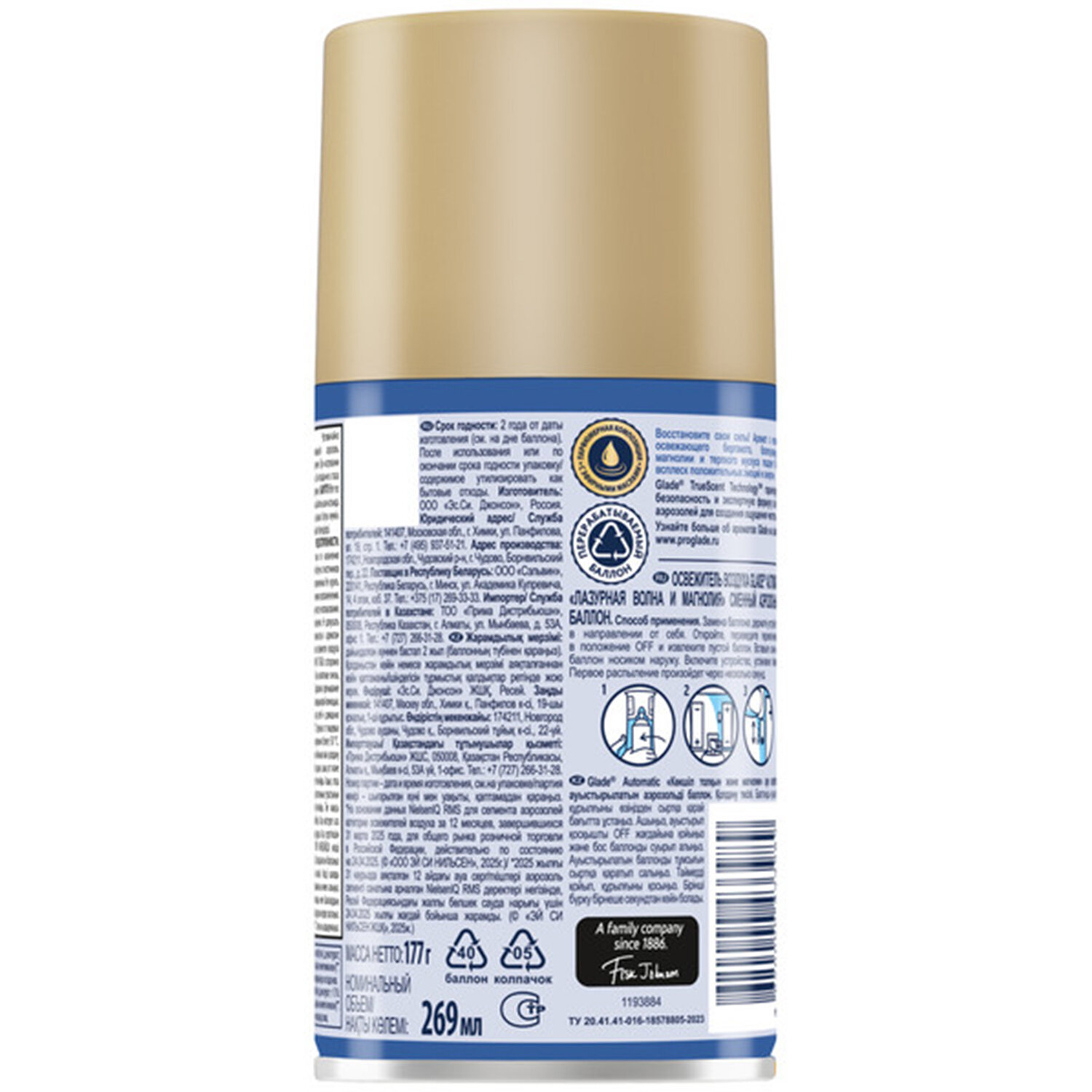 Сменный баллон 269 мл, GLADE "Лазурная волна и магнолия" для автоматических освежителей Код товара: 701789 482,04 ₽ Купить Производитель:GLADE Аромат с нотами освежающего бергамота, благоухающей магнолии и терпкого мускуса. GLADE гарантирует безопасность и экспертную формулу своих аэрозолей. Способ применения: при замене баллона держите устройство в направлении от себя. Откройте, переведите переключатель в положение OFF и извлеките пустой баллон. Вставьте сменный баллон носиком наружу. Включите устройство, установив таймер. Первое распыление произойдет через несколько секунд. Меры предосторожности: использовать только по назначению согласно инструкции. Не разбирать и не давать детям! Беречь от источников тепла, искр, открытого огня и других источников воспламенения. Не курить. Не распылять вблизи открытого огня или других источников воспламенения. Не нарушать целостности упаковки и не сжигать, даже после использования. Использовать только в хорошо проветриваемых помещениях. Не допускать попадания в глаза. Лицам с повышенной чувствительностью к ароматам применять средство с осторожностью. Использование освежителя воздуха не заменяет надлежащую гигиену. ПРИ ПОПАДАНИИ В ГЛАЗА: осторожно промыть глаза водой в течение нескольких минут. Снять контактные линзы, если вы ими пользуетесь и если это легко сделать. Продолжить промывание глаз. Если раздражение глаз не проходит, обратиться за медицинской помощью. ОПАСНО! Чрезвычайно легковоспламеняющийся аэрозоль. Баллон под давлением. При нагревании возможен взрыв. При попадании в глаза вызывает раздражение. Условия хранения: хранить в сухом, недоступном для детей и домашних животных месте при температуре от -5 до +35 °C, отдельно от пищевых продуктов. Беречь от солнечных лучей, избегать нагревания более 50 °С. Срок действия аэрозоля: 2 года от даты изготовления (см. на на дне баллона). После использования или по окончании срока годности упаковку/содержимое аэрозольного баллона утилизировать как бытовые отходы. Состав: не менее 30%: пропеллент (бутан, пропан, изобутан), денатурат; отдушка (линалоол, цитронеллол, гераниол, альфа-изометилионон)*. *Потенциальные аллергены. Не содержит озоноразрушающих хладонов. ТУ 20.41.41-016-18578805-2023.Производство: РоссияДиспенсерная система: AIRWICK, GLADE, KSITEXОбъем картриджа: 269 млСерия: REFILLОтдушка: бергамот, магнолия и мускусСрок годности: 24 месВес: 260 грРазмер упаковки: 6.6 × 14.7 × 6.6 смОбъём: 0.0006 м3Промежуточная упаковка: 6 штТранспортная упаковка: 6 штШтрих-код: 4620000433989 Сертификат-1.jpg Сертификат-2.jpg