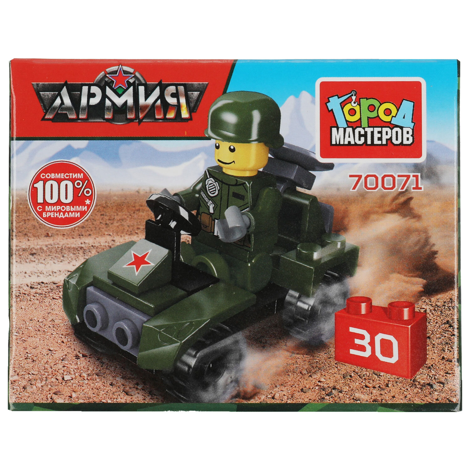 Конструктор пластиковый "АРМИЯ РОССИИ", 20-29 деталей, ассорти, ГОРОД МАСТЕРОВ Код товара: 667465 167,5 ₽ Купить Производитель:ГОРОД МАСТЕРОВ Торговая марка ГОРОД МАСТЕРОВ представляет развивающие конструкторы европейского качества, совместимые c конструкторами ведущих мировых производителей. Пластиковый конструктор серии "АРМИЯ РОССИИ" – это идеальная детская игрушка для мальчиков, стремящихся к приключениям. Она является замечательным вариантом развивающих игр и отлично подходит для всех любителей сборных моделей. Эта игрушка совместима с моделями конструкторов мировых брендов, все детали легко и плотно соединяются между собой. Пластмассовый материал конструкции гарантирует долговечность и безопасность в использовании.Производство: КитайТип товара: конструктор пластиковыйСерия: Город МастеровМатериал: пластикУровень сложности сборки: начальныйРекомендуемый возраст: 4+Тип деталей: разные формыДетали совместимы с "LEGO": даСюжет: Военная техникаКоличество элементов: 20 шт.Количество моделей для сборки: 1Комплектация: инструкция по сборкеЦвет: ассортиУпаковка: картонная коробкаВес: 48 грРазмер упаковки: 4.8 × 9.2 × 6.8 смОбъём: 0.0009 м3Промежуточная упаковка: 10 штТранспортная упаковка: 10 штШтрих-код: 4650250570158 Файлы Сертификат-1.jpg Сертификат-2.jpg