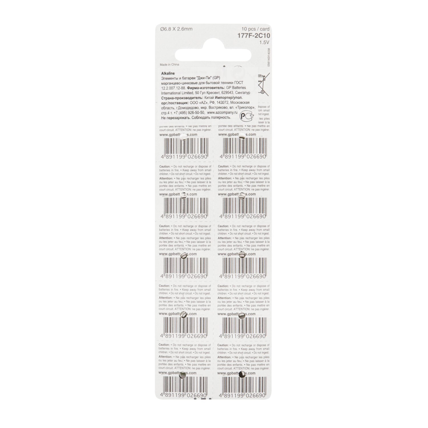 Батарейка GP Alkaline 177 (G4, LR626), алкалиновая, 1 шт., в блистере (отрывной блок), 177-2CY Код товара: 452223 23,9 ₽ Купить Производитель:GP Алкалиновая батарейка для электронных устройств GP размера 177 является источником энергии для множества маленьких электронных устройств и приборов: от калькуляторов, игрушек и систем входа без ключа до электронных книг. Батарейки GP – это надежные элементы питания, которые обеспечивают стабильную работу устройств. В процессе изготовления использовались качественные материалы и тщательно соблюдались стандарты безопасности, поэтому комплект оптимально подходит для бытового применения. Особенности конструкции позволяют устанавливать алкалиновые батарейки в устройства с повышенным энергопотреблением. Изделие отличается долгим сроком службы и стабильным электрическим напряжением. Модель минимально подвержена саморазряду и потере других физических качеств. Поставляется в блистере в количестве 1 батарейки.Производство: КитайФорма батарейки: дисковые «таблетки»Серия: AlkalineТипоразмер: A177 (G4, LR626, LR66)Технология: алкалиноваяНапряжение: 1.5 ВКоличество в упаковке: 1 шт.Упаковка: блистерСрок годности: 36 месВес: 1 грРазмер упаковки: 0.7 × 2.6 × 2.6 смПромежуточная упаковка: 10 штТранспортная упаковка: 5000 штШтрих-код: 4891199026690 Файлы Сертификат-1.jpg Сертификат-2.jpg Сертификат-3.jpg Сертификат-4.jpg