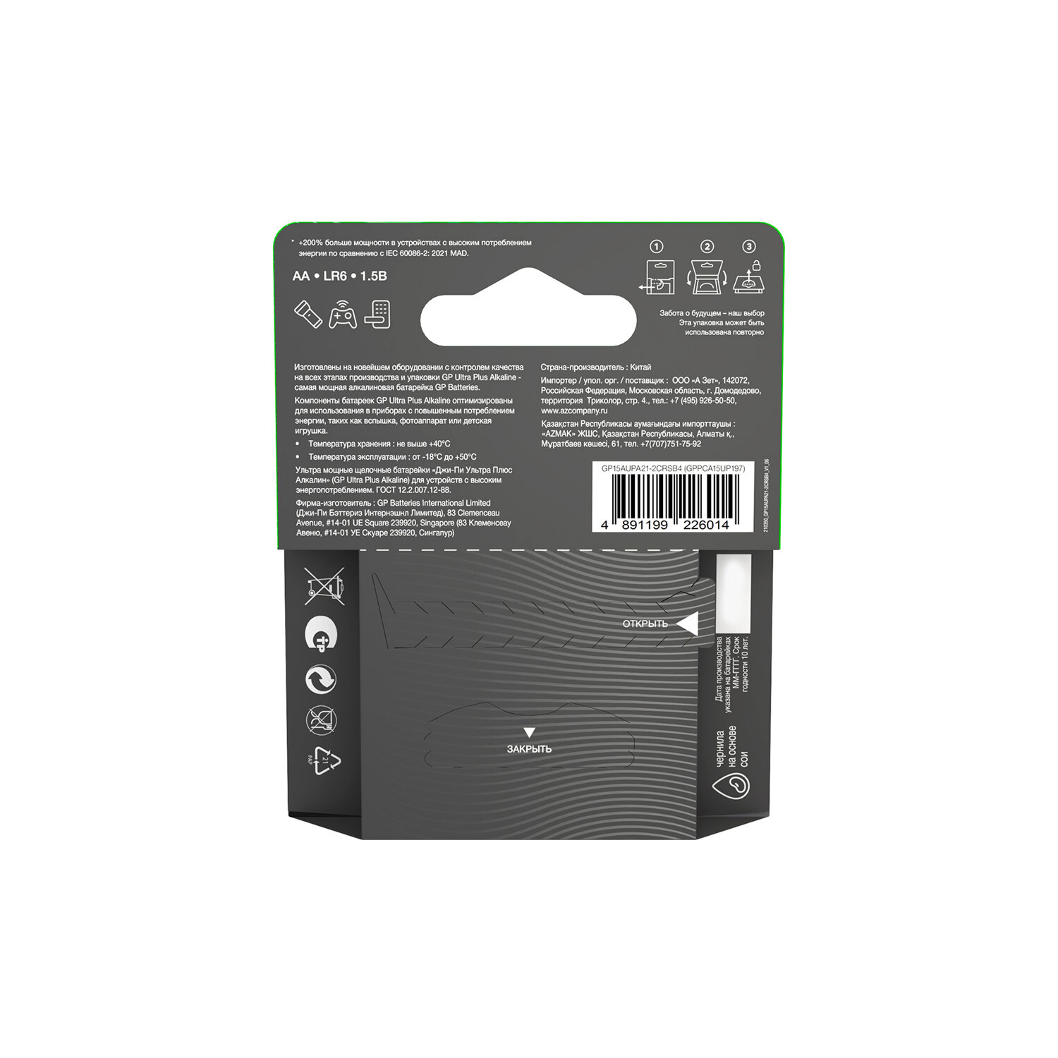 Батарейки КОМПЛЕКТ 4 шт., GP Ultra Plus G-Tech, AA (LR6), алкалиновые, пальчиковые Код товара: 454095 438,99 ₽ Купить Производитель:GP В семействе GP Batteries – обновление! Линейка бытовых элементов питания GP Ultra Plus G-Tech! Это самые мощные щелочные батарейки GP для использования в энергоемких приборах (цифровые камеры, фотовспышки, электронные игры и радиоуправляемые игрушки). Батарейки GP Ultra Plus G-Tech работают на 30% дольше обычных алкалиновых батареек. Благодаря более тщательной очистке от примесей, таких как медь и железо, батарейки имеют высокую токоотдачу и низкий уровень саморазряда. По сравнению с более ранним поколением батареек GP Super, GP Ultra Plus G-Tech обеспечивают в разных типах устройств до 100% более высокую продолжительность работы. Батарейки GP Ultra Plus G-Tech также отличаются от предшественников долговечностью. Инновационная технология производства стального стаканчика обеспечивает более равномерное нанесение никель-кадмиевого покрытия, повышая стойкость к коррозии. А современные полимеры в составе предохранительного клапана обеспечивают полную защиту от протечек. Срок годности батареек GP Ultra Plus G-Tech составляет 10 лет. Изготовленные на новейшем оборудовании, с тщательным контролем качества на всех этапах производства и упаковки, батарейки GP Ultra Plus G-Tech представляют собой мощное и долговечное решение по разумной цене. Вся информация о товарах на сайте носит справочный характер и не является публичной офертой в соответствии с пунктом 2 статьи 437 ГК РФ. Производитель оставляет за собой право изменять характеристики товара, его внешний вид и комплектность без предварительного уведомления продавца.Производство: КитайФорма батарейки: AA (пальчиковые)Серия: Ultra PlusТипоразмер: AA (пальчиковая, R6, LR6, 316, 15A, 15D)Технология: алкалиноваяНапряжение: 1.5 ВКоличество в упаковке: 4 шт.Упаковка: блистерСрок годности: 120 месВес: 111 грРазмер упаковки: 1.6 × 10.5 × 8.4 смОбъём: 0.0001 м3Промежуточная упаковка: 10 штТранспортная упаковка: 80 штШтрих-код: 4891199226014 Файлы Сертификат-1.jpg Сертификат-2.jpg Сертификат-3.jpg Сертификат-4.jpg