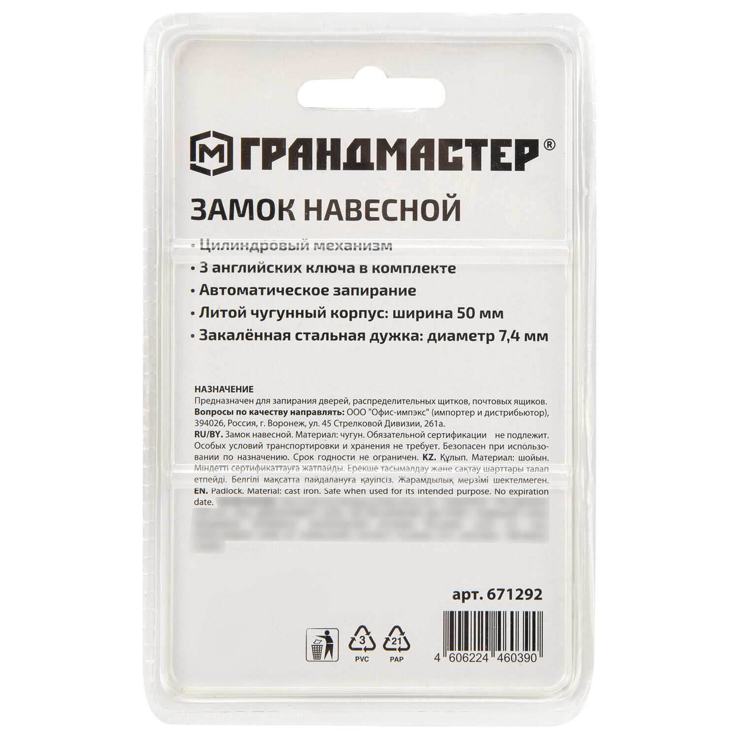 Замок навесной чугунный "Стандарт", ширина 50 мм, английский, 3 ключа, ГРАНДМАСТЕР Код товара: 671292 264,25 ₽ Купить Производитель:ГРАНДМАСТЕР Замок навесной ГРАНДМАСТЕР с цилиндровым механизмом секретности предназначен для запирания дверей, гаражных ворот, складов и других помещений. Достаточно прост по конструкции и надёжен в повседневной эксплуатации. Замок навесной имеет литой чугунный корпус и оснащен полукруглой дужкой из закаленной стали, что делает его прочным и увеличивает сопротивляемость к взлому. Тип механизма секретности – цилиндровый. Три английских ключа в комплекте. Замок запирается автоматически (без использования ключа) при нажатии на дужку сверху, что облегчает его эксплуатацию. Средние размеры замка и толщина дужки позволяют использовать его в качестве замка для запирания дверей, гаражных ворот, складов и других помещений. Размеры замка: ширина 50 мм, высота 75 мм, толщина 18 мм. Диаметр дужки: 7,4 мм. Внутреннее расстояние между дужками: 25 мм. Внутренняя высота дужки (в закрытом виде): 27 мм. Количество ключей: 3. Размер ключей: 46x21x1,5 мм. Упаковка: двойной блистер с европодвесом.Производство: КитайТип ключа: английскийКоличество ключей в комплекте: 3 шт.Материал корпуса: чугунОсобенности: автоматическая система запиранияДиаметр дужки: 7.4 ммШирина замка: 50 ммСерия: СтандартТип замка: навеснойВысота замка: 75 ммГлубина замка: 18 ммВес: 200 гТип упаковки: блистерРазмер упаковки: 2.8 × 14.9 × 9.7 смОбъём: 0.0004 м3Промежуточная упаковка: 12 штТранспортная упаковка: 72 штШтрих-код: 4606224460390 Файлы Сертификат-1.jpg Сертификат-2.jpg Сертификат-3.jpg Сертификат-4.jpg Сертификат-5.jpg Сертификат-6.jpg Сертификат-7.jpg Сертификат-8.jpg Сертификат-9.jpg Сертификат-10.jpg Сертификат-11.jpg Сертификат-12.jpg Сертификат-13.jpg Сертификат-14.jpg Сертификат-15.jpg Сертификат-16.jpg Сертификат-17.jpg Сертификат-18.jpg Сертификат-19.jpg Сертификат-20.jpg Сертификат-21.jpg Сертификат-22.jpg Сертификат-23.jpg Сертификат-24.jpg Сертификат-25.jpg Сертификат-26.jpg