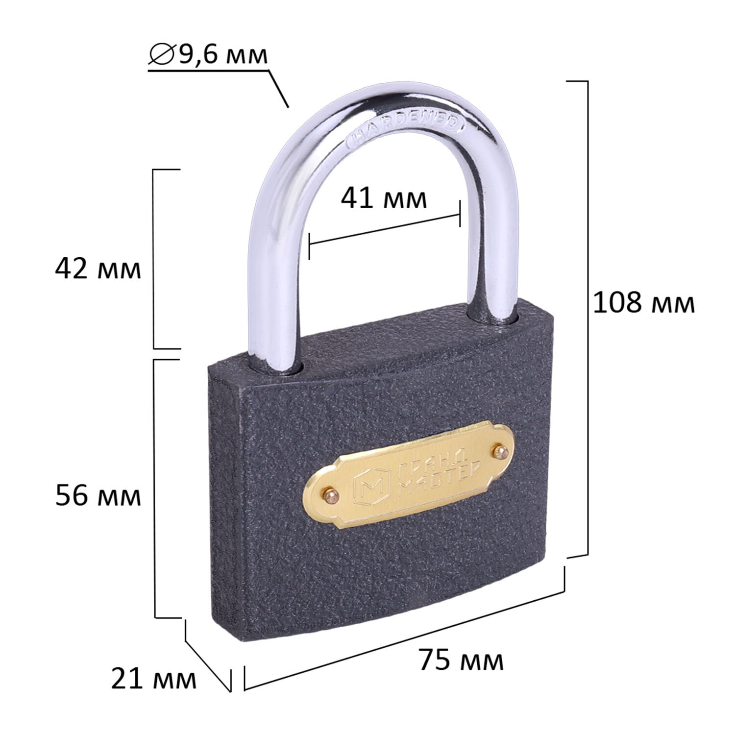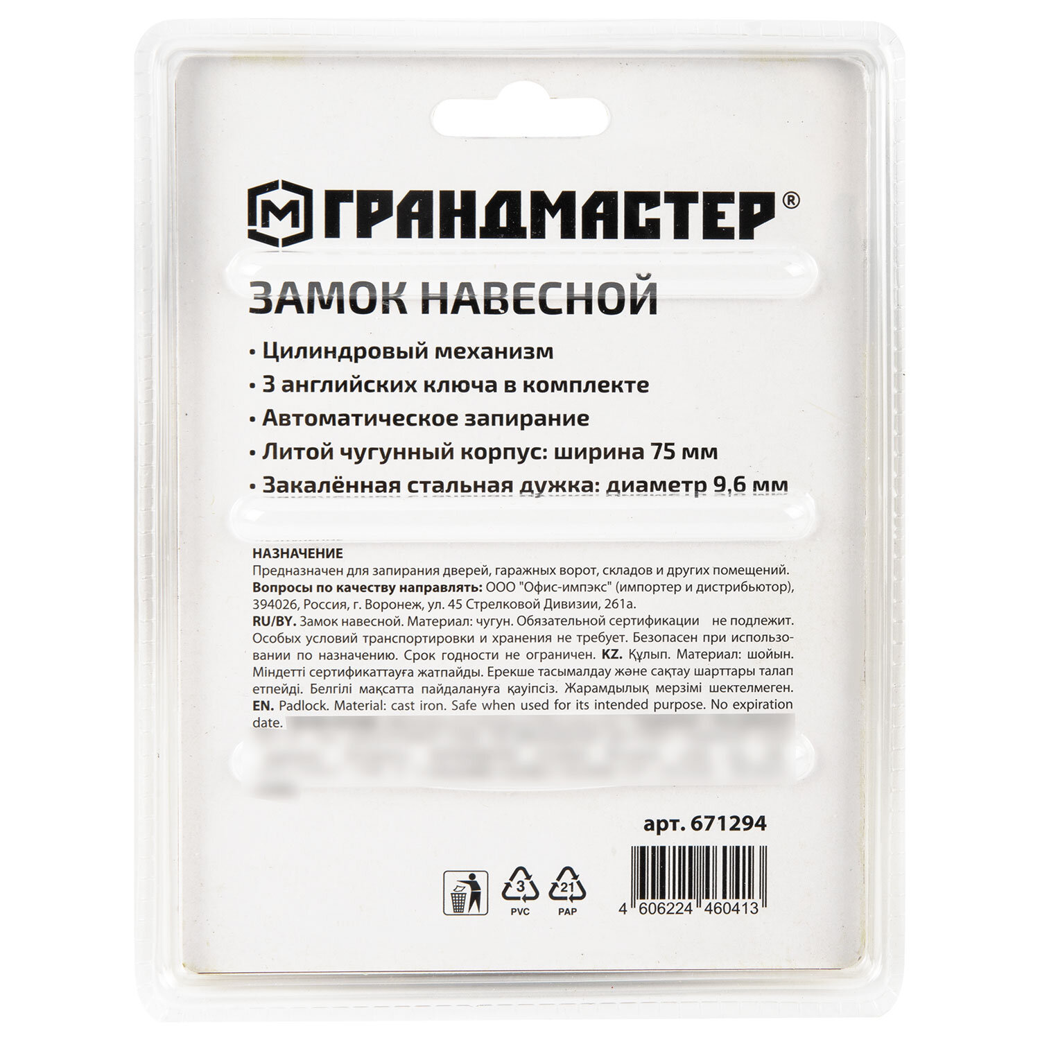 Замок навесной чугунный "Стандарт", ширина 75 мм, английский, 3 ключа, ГРАНДМАСТЕР Код товара: 671294 347,04 ₽ Купить Производитель:ГРАНДМАСТЕР Замок навесной ГРАНДМАСТЕР с цилиндровым механизмом секретности предназначен для запирания дверей, гаражных ворот, складов и других помещений. Достаточно прост по конструкции и надёжен в повседневной эксплуатации. Замок навесной имеет литой чугунный корпус и оснащен полукруглой дужкой из закаленной стали, что делает его прочным и увеличивает сопротивляемость к взлому. Тип механизма секретности – цилиндровый. Три английских ключа в комплекте. Замок запирается автоматически (без использования ключа) при нажатии на дужку сверху, что облегчает его эксплуатацию. Большие размеры замка и толщина дужки позволяют использовать его в качестве замка для запирания дверей, гаражных ворот, складов и других помещений. Размеры замка: ширина 75 мм, высота 108 мм, толщина 21 мм. Диаметр дужки: 9,6 мм. Внутреннее расстояние между дужками: 41 мм. Внутренняя высота дужки (в закрытом виде): 42 мм. Количество ключей: 3. Размер ключей: 51x23x1,7 мм. Упаковка: двойной блистер с европодвесом.Производство: КитайТип ключа: английскийКоличество ключей в комплекте: 3 шт.Материал корпуса: чугунОсобенности: автоматическая система запиранияДиаметр дужки: 9.6 ммШирина замка: 75 ммСерия: СтандартТип замка: навеснойВысота замка: 108 ммГлубина замка: 21 ммВес: 530 гТип упаковки: блистерРазмер упаковки: 3.1 × 17.1 × 13.1 смОбъём: 0.0007 м3Промежуточная упаковка: 6 штТранспортная упаковка: 36 штШтрих-код: 4606224460413 Файлы Сертификат-1.jpg Сертификат-2.jpg Сертификат-3.jpg Сертификат-4.jpg Сертификат-5.jpg Сертификат-6.jpg Сертификат-7.jpg Сертификат-8.jpg Сертификат-9.jpg Сертификат-10.jpg Сертификат-11.jpg Сертификат-12.jpg Сертификат-13.jpg Сертификат-14.jpg Сертификат-15.jpg Сертификат-16.jpg Сертификат-17.jpg Сертификат-18.jpg Сертификат-19.jpg Сертификат-20.jpg Сертификат-21.jpg Сертификат-22.jpg Сертификат-23.jpg Сертификат-24.jpg Сертификат-25.jpg Сертификат-26.jpg