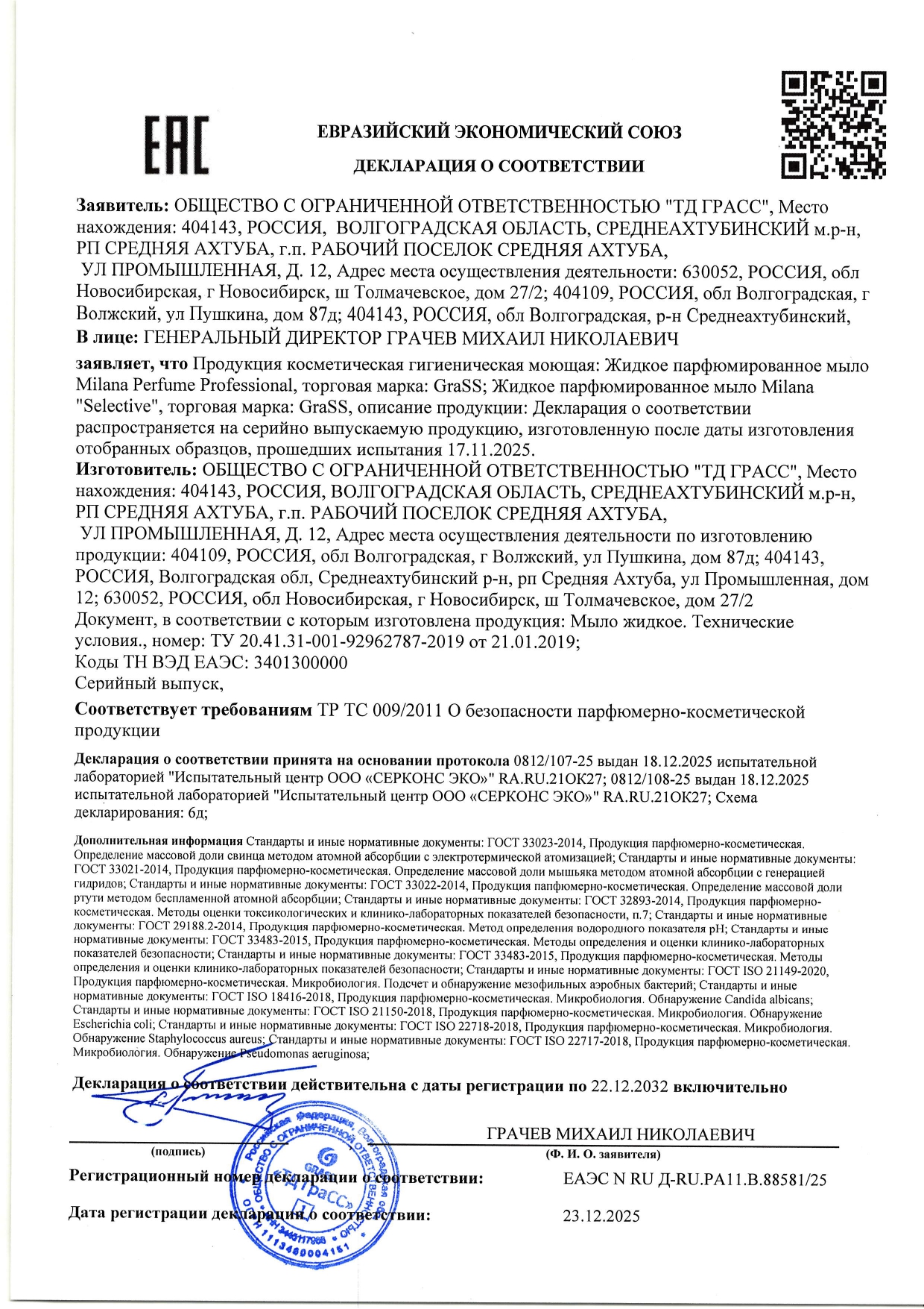 Мыло жидкое парфюмированное 1 л, GRASS MILANA "Черный перец амбра и нероли", дозатор Код товара: 609870 207,44 ₽ Купить Производитель:GRASS Нежное жидкое парфюмированное мыло GRASS MILANA "Черный перец амбра и нероли" обеспечивает деликатный уход за кожей благодаря входящим в состав высококачественным экологичным компонентам природного происхождения. Обладает отличными очищающими и обезжиривающими свойствами, устраняет резкие запахи, имеет приятный парфюмированный аромат. Масло макадамии, входящее в состав, способствуют мягкому очищению и увлажнению кожи, сохраняя защитные функции и поддерживая естественный водный баланс. Нейтральный РН 5.5 обеспечивает нежный уход за кожей, не вызывая ее сухости и раздражения. Состав: Aqua, Sodium Laureth Sulfate, Cocamidopropyl Betaine, Cocamide DEA, Glyceryl Cocoate, Sodium Chloridel, Fragrance, Macadamia Integrifolia Seed Oi, Salt EDTA, Citric Acid, Methylchloroisothiazolinone, Methylisothiazolinone.Производство: РоссияОбъем / Вес: 1000 мл/гПодходящий тип кожи: для всех типовЭффект от использования: очищение, смягчениеСерия: SOAPОтдушка: черный перец, амбра и неролиСбалансированный уровень рН: даТип дозирования: дозаторВид упаковки: флаконЦвет: прозрачныйСрок годности: 24 месРазмер упаковки: 8.8 × 24.3 × 8.5 смОбъём: 0.0023 м3Промежуточная упаковка: 6 штТранспортная упаковка: 6 штШтрих-код: 4670113604165 Файлы Приложение-1.pdf Сертификат-1.jpg Сертификат-2.jpg Сертификат-3.jpg
