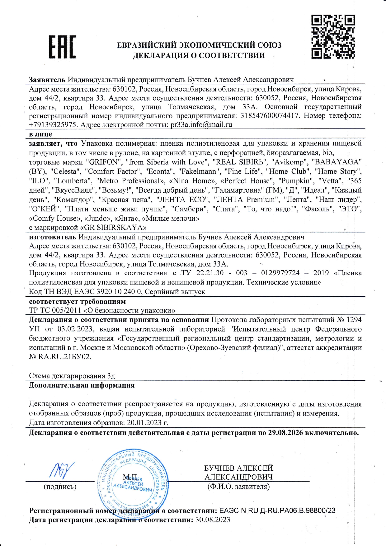 Пленка пищевая ПЭ в упаковке, 29 см х 135 м, 6 мкм, GRIFON Код товара: 701357 155,81 ₽ Купить Производитель:GRIFON Пищевая пленка длиной 135 метров – выгодное решение для профессиональной кухни и большой семьи. Идеально для длительного хранения в холодильнике, заморозки, упаковки блюд и транспортировки. Длина пленки 135 м, ширина 29 см подходит для упаковки крупных блюд и противней. Толщина 6 мкм обеспечивает плотное облегание продуктов без излишков материала. Подходит для упаковки крупных блюд и противней. Как использовать: - отмотайте от рулона нужную длину; - отрежьте пленку с помощью встроенного зубчатого ножа на коробке (если есть) или ножницами; - плотно оберните продукт или емкость, пленка хорошо прилипает к себе и к гладким поверхностям.Производство: РоссияШирина: 29 смДлина: 135 мТолщина: 6 мкмСырье: первичное пищевоеМатериал: полиэтиленЦвет: прозрачныйВес: 0.276 кгРазмер упаковки: 5 × 31 × 5 смОбъём: 0.0006 м3Промежуточная упаковка: 24 штТранспортная упаковка: 24 штШтрих-код: 4607692000118 Сертификат-1.jpg Сертификат-2.jpg Сертификат-3.jpg