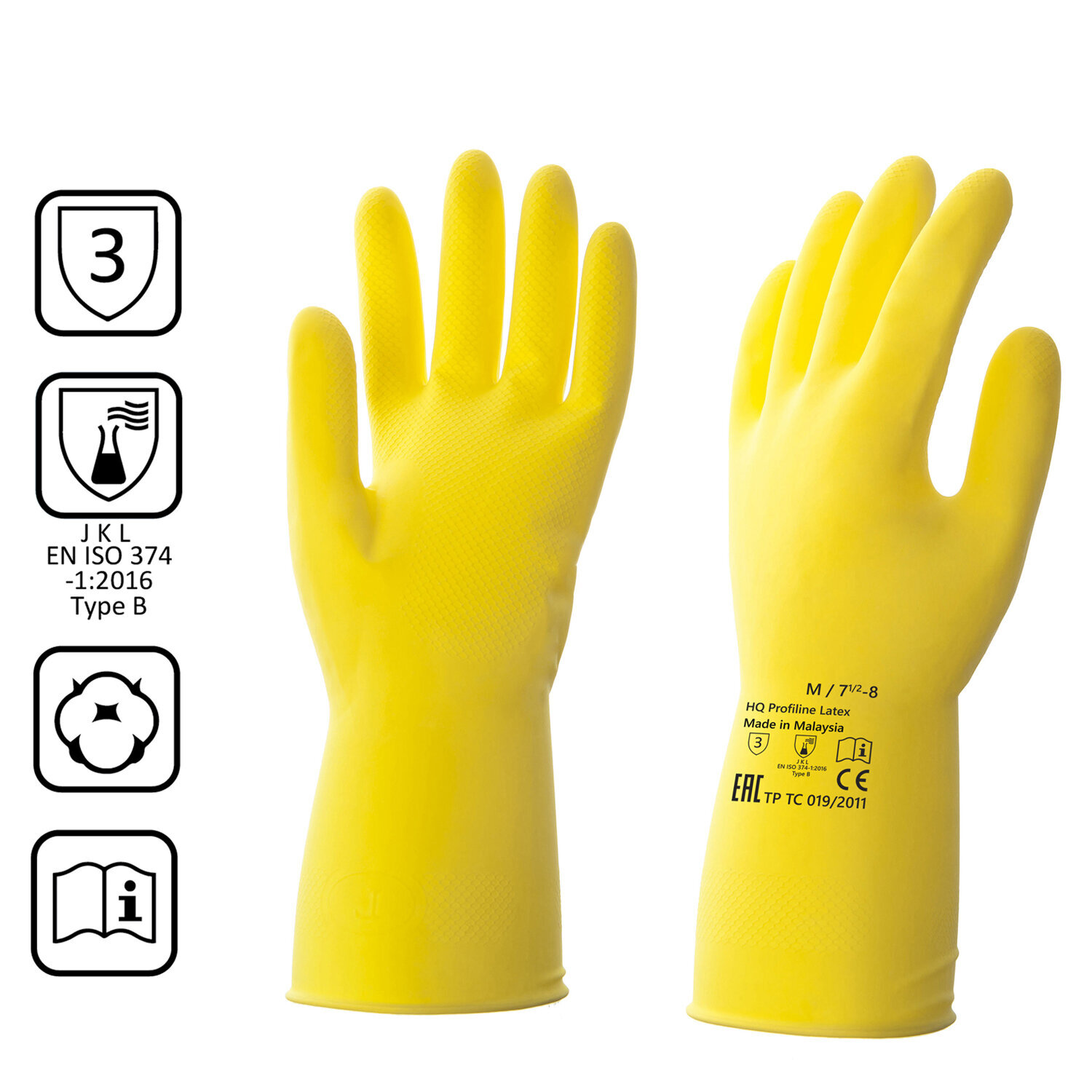 Перчатки латексные КЩС, сверхпрочные, плотные, хлопковое напыление, размер 7,5-8, M (средний), желтые, HQ Profiline Код товара: 608750 207,6 ₽ Купить Производитель:HQ Profiline Универсальные латексные перчатки КЩС с хлопковым напылением, прочные на растяжение и прокол. Подходят для ежедневной уборки, в том числе с использованием химии и дезинфектантов (согласно инструкции по применению). Рельефная поверхность в области захвата. Химически стойкие. Предназначены для защиты от химических воздействий и общих производственных загрязнений. Внутреннее покрытие из хлопка обеспечивает комфорт во время работы. Перчатки защищают руки от загрязнений, воздействия растворов моющих средств на основе щелочей и кислот и прочих раздражителей. Степень защиты от кислот – 80%, степень защиты от щелочей – 40%.Производство: МалайзияЗащита от: химических воздействийРазмер: M (средний)Размер производителя: 7,5-8 (M)Вид: КЩСМатериал основы: латексПокрытие внешнее: нетПодкладка: хлопковое напылениеСерия: КЩССтепень защиты от кислот: 80%Степень защиты от щелочей: 20%Поверхность области захвата: рельефнаяКоличество в комплекте: 1 парДлина: 310 ммТолщина: 0.35 ммЦвет: желтыйВес: 61 грРазмер упаковки: 1.1 × 20.8 × 13.5 смОбъём: 0.0002 м3Промежуточная упаковка: 50 штТранспортная упаковка: 50 штШтрих-код: 4606066235842 Файлы Сертификат-1.jpg Сертификат-2.jpg Сертификат-3.jpg Сертификат-4.jpg