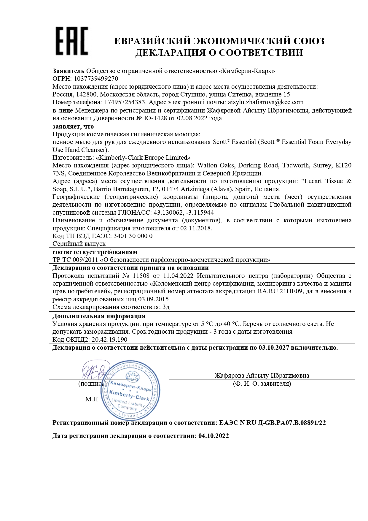 Пенное мыло розового цвета класса люкс с нежным ароматом, поставляется в упаковке из 6 картриджей, каждый из которых в прочной, гигиенически запечатанной емкости объёмом 1 литр для быстрой и легкой установки, один картридж обеспечивает до 2500 порций мыла, что не требует частой смены картриджа. Картридж обладает свойством термоусадки после опустошения для экономии места при вторичной переработке (после удаления дозатора). Продукция сертифицирована и имеет стандарты качества ISO9001 и ISO14001.