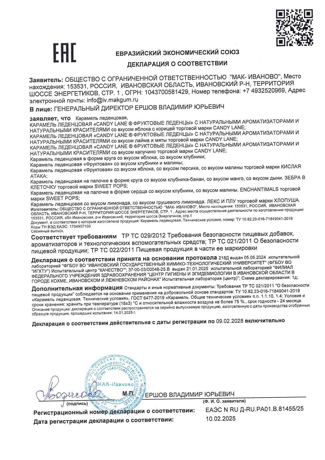 Карамель леденцовая КИСЛАЯ АТАКА, ассорти вкусов (яблоко, персик, малина), 40 г Код товара: 624571 96,4 ₽ Купить Производитель:КИСЛАЯ АТАКА Карамель леденцовая КИСЛАЯ АТАКА – это ассорти трёх вкусов: яблоко, персик и малина. Сладко-кислый вкус и яркий дизайн делают карамель отличным угощением для детей и взрослых. Состав: • вкус "Яблоко": патока, сахар, регулятор кислотности: лимонная кислота, краситель: хлорофиллы, обсыпка (регуляторы кислотности: яблочная, винная кислоты, загуститель: гуммиарабик), натуральный ароматизатор: яблоко; • вкус "Персик": патока, сахар, регулятор кислотности: лимонная кислота, краситель: куркумин; экстракты чёрной моркови и виноградной кожицы; обсыпка (регуляторы кислотности: яблочная, винная кислоты, загуститель: гуммиарабик), натуральный ароматизатор: персик; • вкус "Малина": патока, сахар, регулятор кислотности: лимонная кислота, экстракты чёрной моркови и виноградной кожицы; обсыпка (регуляторы кислотности: яблочная, винная кислоты, загуститель: гуммиарабик), натуральный ароматизатор: малина.Производство: РоссияТип товара: карамель леденцоваяВес нетто: 40 гВкус: яблоко, персик, малинаУпаковка: пакетСоответствует требованиям ГОСТа: нетСрок годности: 24 мес.Фирма-производитель: ГК "Сладкая Сказка"Срок годности: 24 месВес: 49 грРазмер упаковки: 1.8 × 13.3 × 9.9 смОбъём: 0.0003 м3Промежуточная упаковка: 20 штТранспортная упаковка: 120 штШтрих-код: 4600416024261 Сертификат-1.jpg Сертификат-2.jpg Сертификат-3.jpg