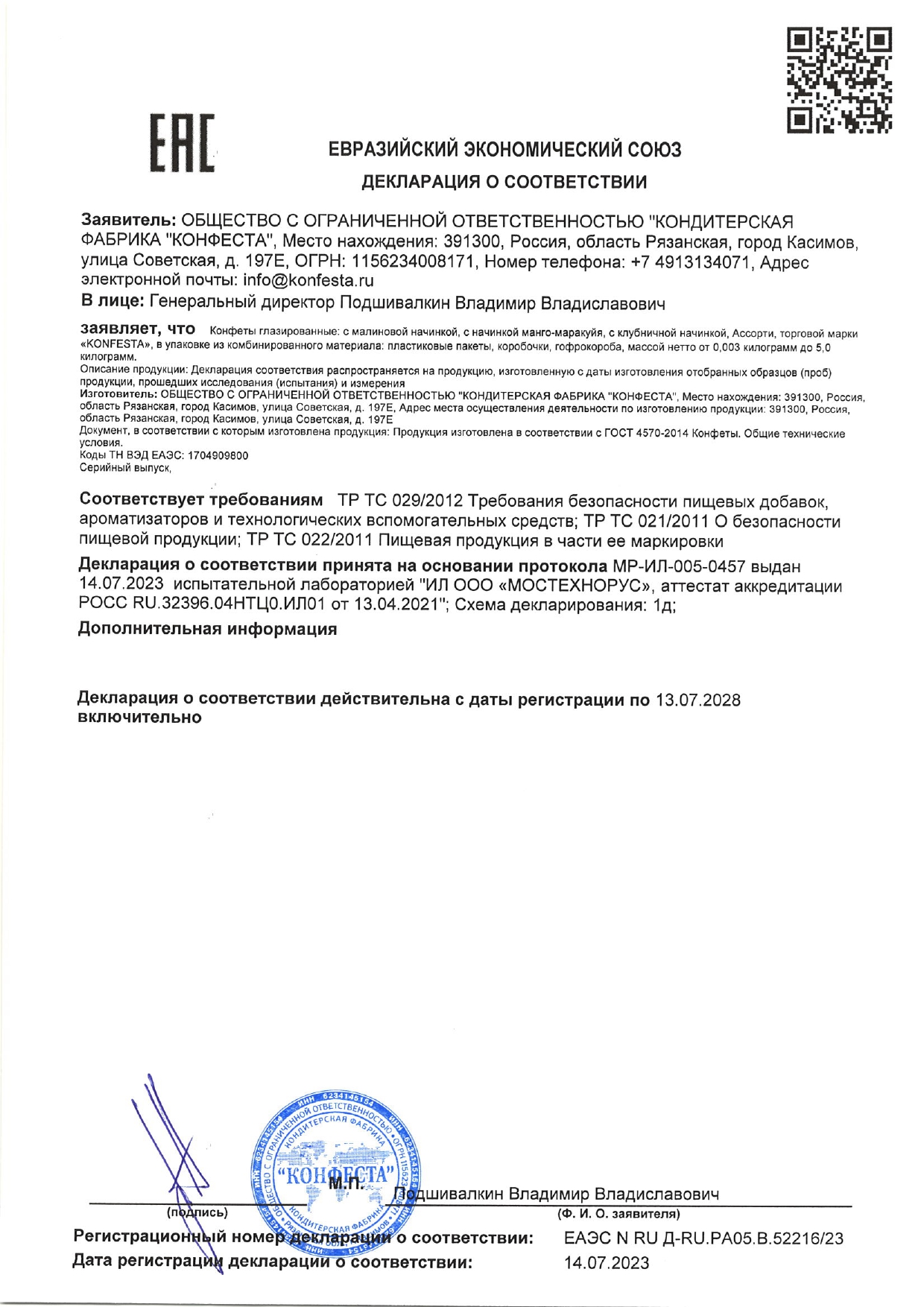 Конфеты глазированные KONFESTA ассорти (кокос, малина, манго-маракуйя), 1100 г Код товара: 624525 765,79 ₽ Купить Производитель:KONFESTA Ассорти: сливочно-кокосовый крем – восхитительный аромат кокосов, нежный сливочный крем; малиновый крем – вкус спелой малины, в обсыпке из кокосовой стружки; крем манго-маракуйя – идеальное сочетание вкуса манго и маракуйи в обсыпке из кокосовой стружки. Состав: масла растительные (подсолнечное, пальмовое, пальмоядровое), сыворотка сухая молочная, сахар, стружка кокосовая, мука пшеничная, крахмал тапиоковый, лактоза, ягоды сухие (малина, манго, маракуйя), эмульгатор – соевый лецитин, ароматизаторы, регулятор кислотности – лимонная кислота, натуральные красители: кармин, паприка. Условия хранения: температура воздуха от +5 до +22 °С, относительная влажность воздуха не более 75%.Производство: РоссияВес нетто: 1100 гСерия: KONFESTAУпаковка: гофрокоробВесовые: даВид начинки: кремВкус: кокос, малина, манго-маракуйяСрок годности: 12 мес.Фирма-производитель: КФ "Конфеста"Срок годности: 12 месВес: 1,2 кгРазмер упаковки: 15.2 × 20.5 × 17.7 смОбъём: 0.0055 м3Промежуточная упаковка: 1 штТранспортная упаковка: 1 штШтрих-код: 2468002557483 Сертификат-1.jpg Сертификат-2.jpg Сертификат-3.jpg