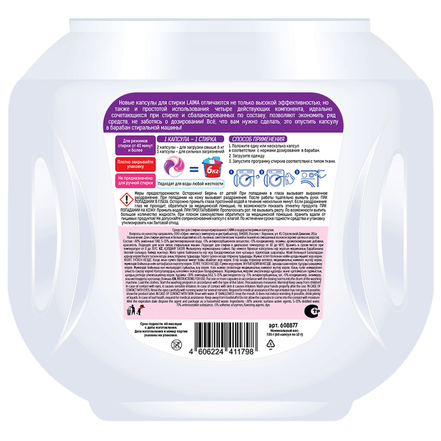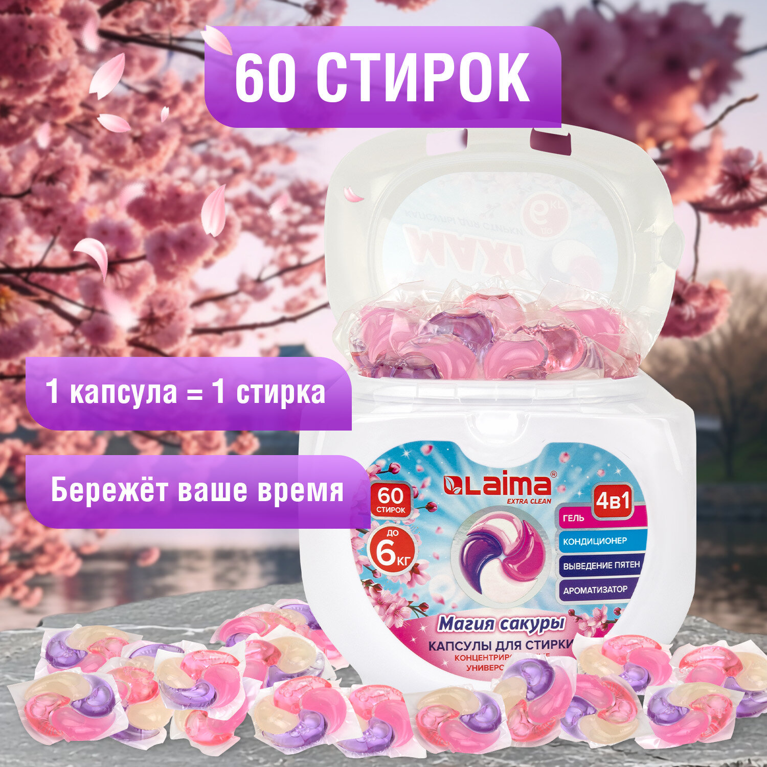 Капсулы для стирки большие концентрат 4 в 1, с кондиционером, "Магия сакуры", 60 шт., LAIMA, 608877 Код товара: 608877 714,76 ₽ Купить Производитель:LAIMA Новые капсулы для стирки LAIMA "Магия сакуры" отличаются не только высокой эффективностью, но также и простотой использования! Действующие компоненты: 1) концентрированный гель; 2) кондиционер; 3) ароматизатор; 4) выведение пятен. Действующие компоненты сбалансированы по составу и сочетаемости между собой. Они позволяют использовать минимум средств для стирки даже при максимальной загрузке стиральной машины Компактный формат позволяет дозировать количество капсул на стирку при полной и частичной загрузке барабана. Уникальная формула, содержащая смягчающие масла, позаботится о ткани даже без использования дополнительного кондиционера! Состав: более 30% анионные ПАВ, 5-15% дистиллированная вода, менее 5% антиресорбционное вещество, менее 5% кондиционер, энзимы, ароматизирующие добавки, краситель. Капсулы подходят для стирки цветных изделий из хлопчатобумажных, льняных, синтетических тканей и тканей из смешанных волокон (кроме шелка и шерсти). Подходят для режимов стирки от 40 минут и для воды любой жесткости. Не предназначены для ручной стирки. Внимание! Плотно закрывайте упаковку после использования!Производство: КитайТип: автоматВес/Объем: 720 г/млВид средства: капсулыНазначение : для всех видов тканей, кроме шерсти и шелкаОтдушка: Магия сакурыКоличество капсул/стиков: 60 шт.Количество бункеров: 4 шт.Серия: CAPSВид упаковки: пластиковая коробкаСрок годности: 48 месВес: 933 грРазмер упаковки: 11.3 × 14.5 × 16.1 смОбъём: 0.0036 м3Промежуточная упаковка: 20 штТранспортная упаковка: 20 штШтрих-код: 4606224411798 Сертификат-1.jpg