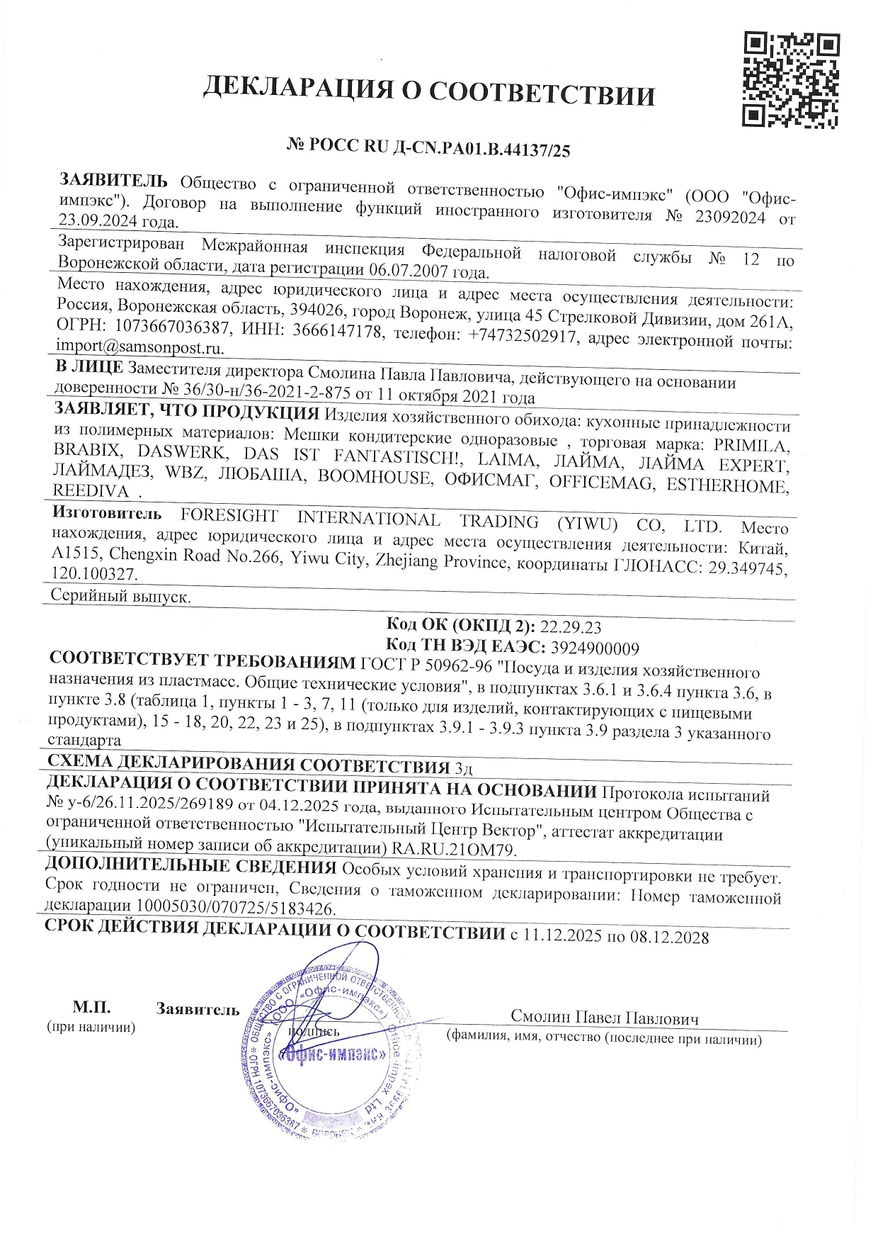 Мешок кондитерский одноразовый 23х35 см, размер L, КОМПЛЕКТ 100 штук, 35 мкм, LAIMA Home Код товара: 700703 219,19 ₽ Купить Производитель:LAIMA Кондитерские мешки LAIMA Home – ваш ключ к идеальному декору: украшайте торты, капкейки и другие десерты, как настоящий профессионал. Кондитерские мешки удобны в использовании, прочны и идеально подходят как для кремов, так и для глазури. Кондитерские мешки LAIMA Home сделают вид вашего десерта безупречным. Имеют прочную и гибкую структуру (не рвутся и не деформируются при нажатии), эргономичную форму, оптимальный размер и противоскользящую структуру для комфортного захвата. Подходят для насадок любого типа, а также могут быть использованы без них. Размер мешка: L (23х35х41,9 см). Объем: 580 мл. Количество в комплекте: 100 штук.Производство: КитайТип товара: мешок кондитерскийМатериал: полиэтиленТолщина: 35 мкмКоличество в комплекте: 100 шт.Одноразовый: даРазмер: 23х35 смЦвет: прозрачныйВес: 248 грРазмер упаковки: 1.7 × 37 × 24.3 смОбъём: 0.0005 м3Промежуточная упаковка: 200 штТранспортная упаковка: 200 штШтрих-код: 4606224499444 Сертификат-1.jpg Сертификат-2.jpg Сертификат-3.jpg