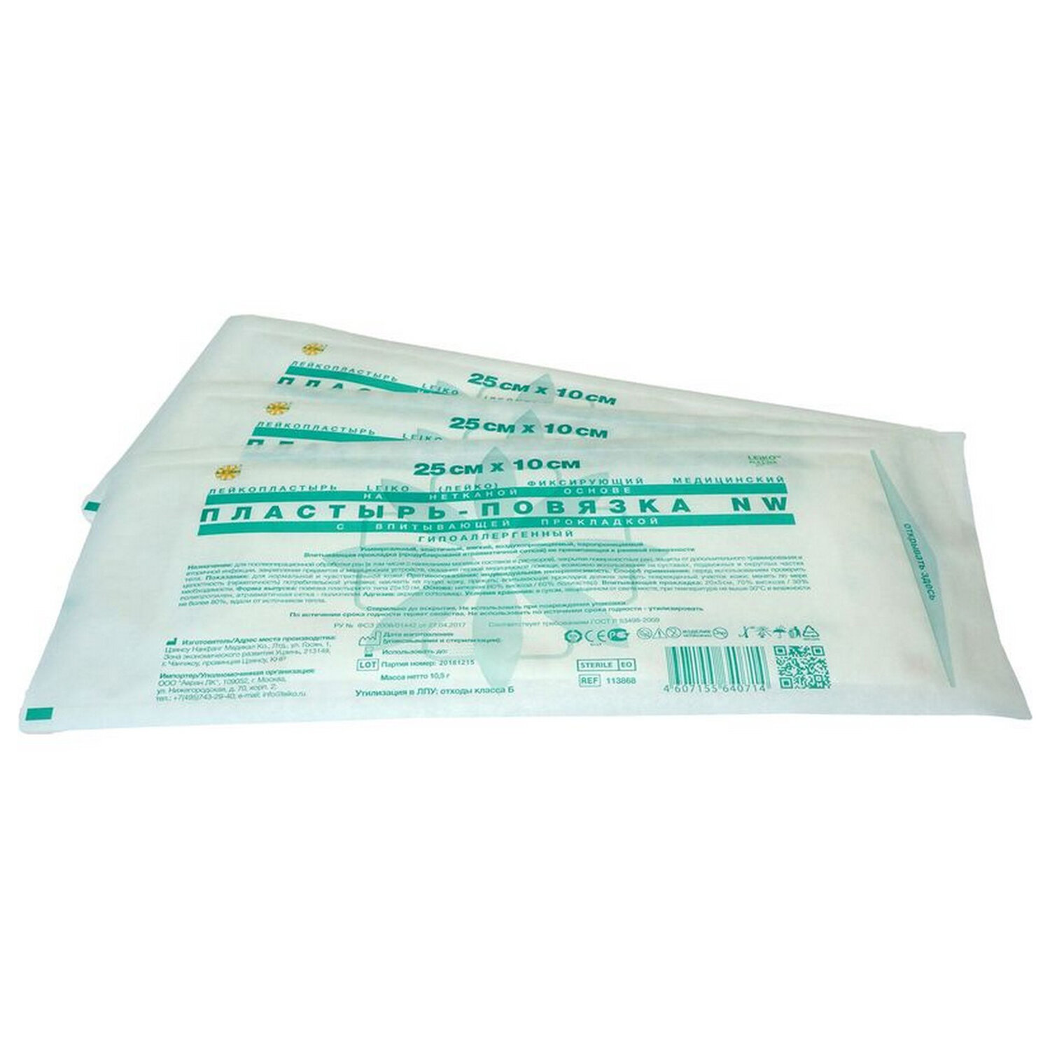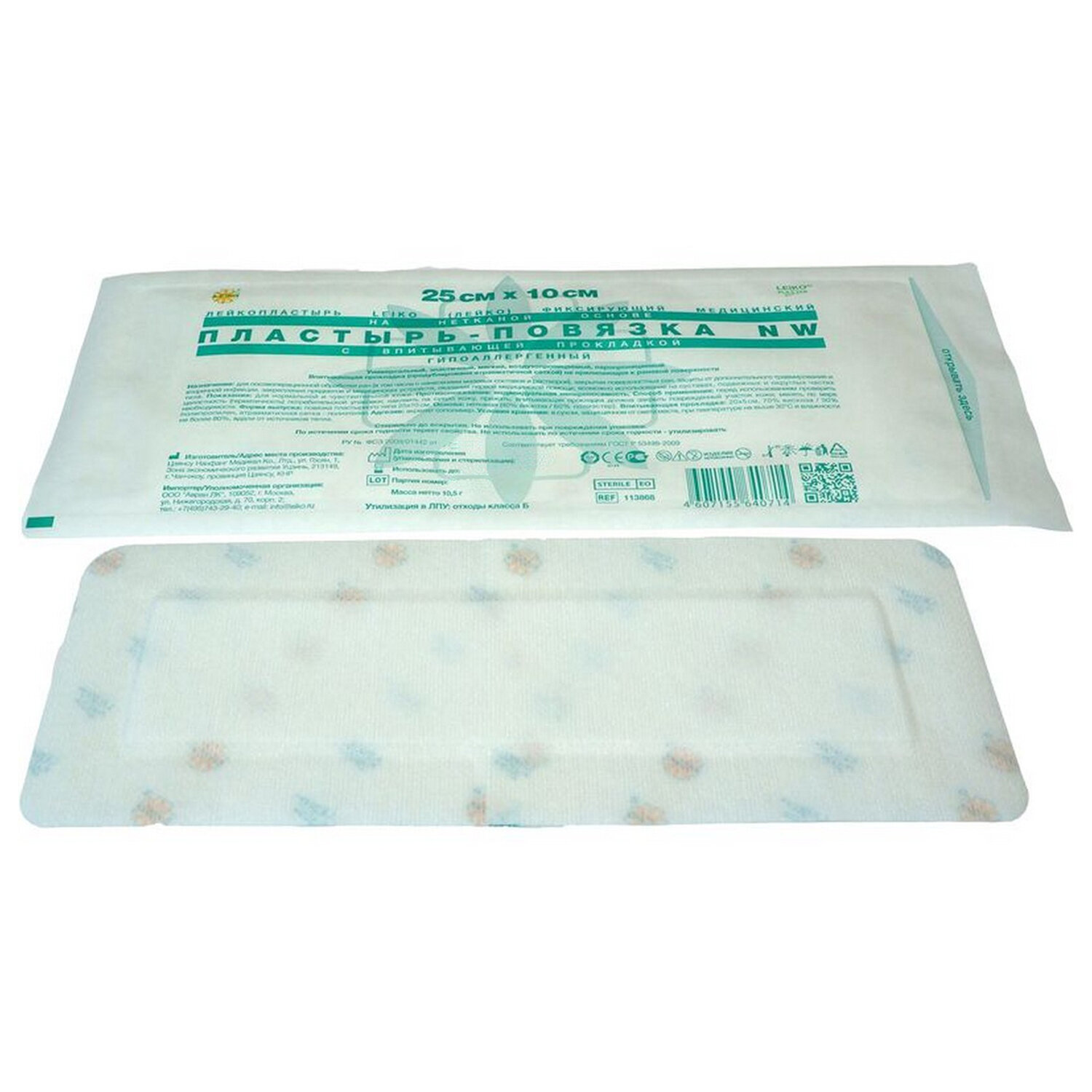 Пластырь-повязка 10х25 см, LEIKO КОМПЛЕКТ 50 шт., нетканая основа c подушечкой Код товара: 631676 1 949,31 ₽ Купить Производитель:LEIKO Стерильная пластырь-повязка на нетканой основе размером 10х25 см со впитывающей прокладкой и атравматичной сеткой. Универсальная, эластичная, мягкая, воздухо- и паропроницаемая. Применяется при первичной, вторичной, послеоперационной обработке ран (в том числе с нанесением мазевых составов и растворов), защиты от дополнительного травмирования, оказания первой медицинской помощи при незначительных повреждениях; для безопасной фиксации медицинских устройств. Гипоаллергенный пластырь-повязка подходит для применения у пациентов как с нормальной, так и с чувствительной кожей. Основа повязки имеет оптимальные характеристики прочности, эластичности и мягкости, что обеспечивает комфортное использование. Перфорированная структура основы характеризуется высокой воздухо- и паропроницаемостью, обеспечивает эффективный влагообмен, позволяя коже "дышать", уменьшая риск возникновения инфекции под повязкой. Утолщенная атравматическая абсорбирующая подушечка в центре пластыря обладает высокой впитывающей способностью. Толщина подушечки подобрана таким образом, чтобы впитать все выделения из раны и защитить ее от дополнительного травмирования. Сторона подушечки, соприкасающаяся с раной, покрыта микросеткой, которая быстро пропускает и распределяет выделения, само покрытие остается сухим, исключая прилипание подушечки к ране, обеспечивая безболезненную атравматичную смену повязки. Не содержит латекса. РУ № ФСЗ 2008/01442 от 27.04.2017 г.Производство: КитайТип товара: пластырь-повязкаОсобенности: с впитывающей прокладкойКоличество в комплекте: 50 шт.Цвет: белыйМатериал основы: нетканыйРазмер: 10х25 смТип упаковки: индивидуальнаяСерия: пластырь-повязкаСрок годности: 60 месВес: 664 грРазмер упаковки: 10 × 31.6 × 13.7 смОбъём: 0.0051 м3Промежуточная упаковка: 15 штТранспортная упаковка: 15 штШтрих-код: 4607155640721 Файлы Сертификат-1.jpg Сертификат-2.jpg Сертификат-3.jpg Сертификат-4.jpg Сертификат-5.jpg Сертификат-6.jpg Сертификат-7.jpg Сертификат-8.jpg Сертификат-9.jpg Сертификат-10.jpg Сертификат-11.jpg Сертификат-12.jpg Сертификат-13.jpg Сертификат-14.jpg Сертификат-15.jpg Сертификат-16.jpg Сертификат-17.jpg Сертификат-18.jpg Сертификат-19.jpg Сертификат-20.jpg Сертификат-21.jpg Сертификат-22.jpg Сертификат-23.jpg Сертификат-24.jpg Сертификат-25.jpg Сертификат-26.jpg Сертификат-27.jpg Сертификат-28.jpg Сертификат-29.jpg
