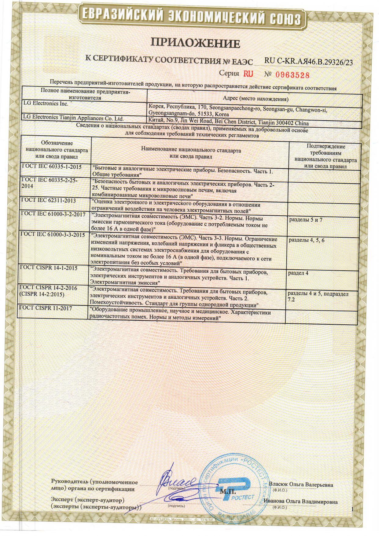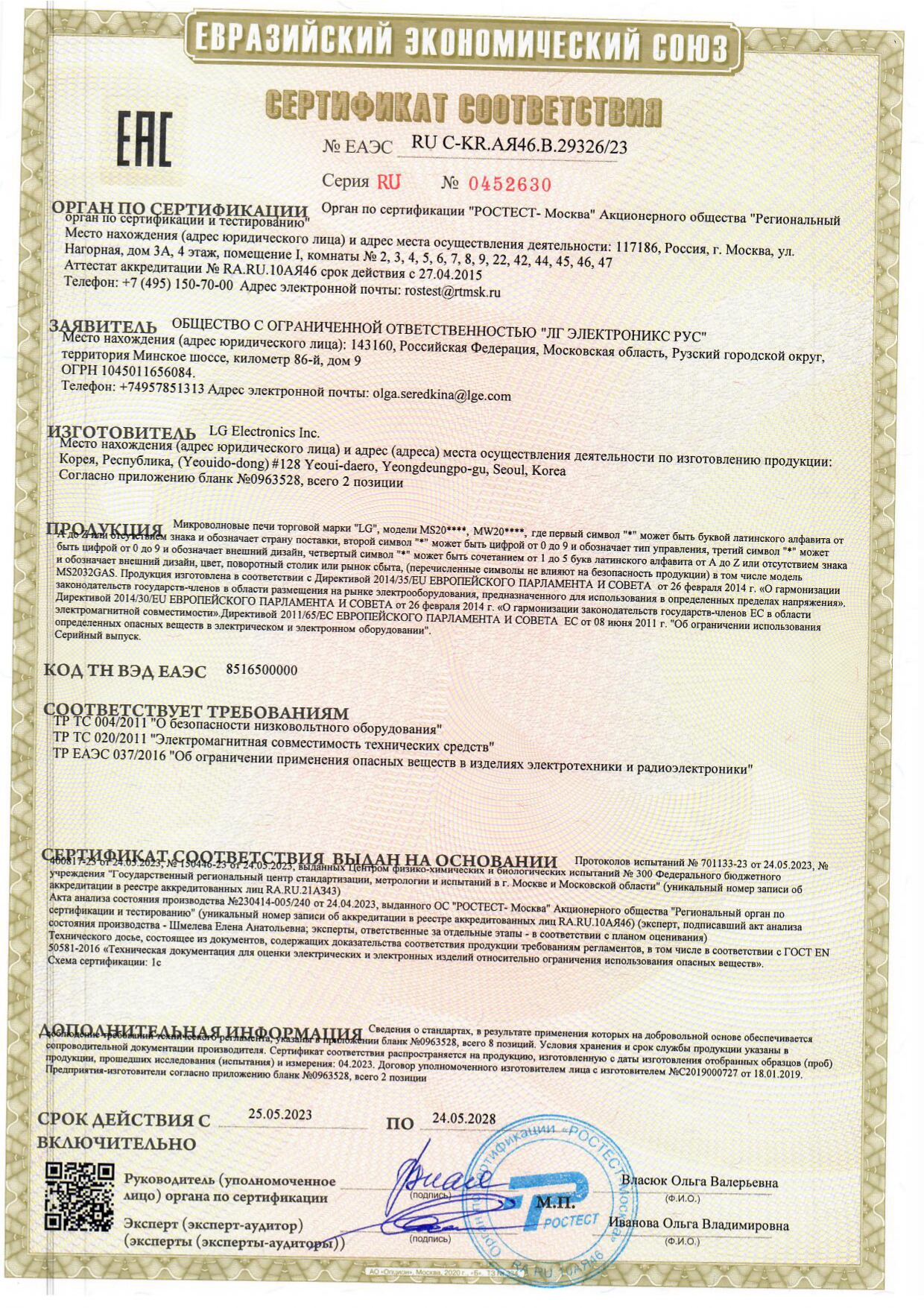 Микроволновая печь LG MS20R42D, объем 20 л, мощность 700 Вт, электронное управление Код товара: 457182 10 225,91 ₽ Купить Производитель:LG Многофункциональная микроволновая печь LG MS20R42D со множеством полезных функций. Данная модель с электронным управлением станет незаменимым помощником на кухне. Специальное легкоочищаемое внутреннее покрытие LG EasyClean препятствует распространению бактерий на 99,99%. Покрытие устойчиво к механическим повреждениям и впитыванию жира, благодаря чему частички пищи не прилипают к стенкам печи и легко очищаются. Благодаря технологии i-Wave, микроволны в печи распространяются равномерно, обеспечивая глубокое проникновение тепла как по центру, так и по краям блюд. Особая конструкция внутренней стенки помогает волнам распространяться по всему объему камеры, что обеспечивает более равномерное приготовление. Автопрограммы приготовления "Кухни мира". 32 уникальные программы, позволяющие без усилий приготовить блюда по традиционным рецептам французской, итальянской, восточной и русской кухни. Достаточно лишь заложить необходимые продукты в камеру и выбрать подходящее меню, а печь сама установит оптимальный режим приготовления блюда. Экономия электроэнергии ECO ON. По окончании работы нажмите специальную кнопку ECO ON, чтобы перевести печь в режим энергосбережения. Эта функция позволит вам контролировать уровень интенсивности подсветки дисплея и освещения. Система регулирования мощности микроволн обеспечивает более равномерное и быстрое размораживание продуктов, сохраняя их вкус и структуру. Таймер рассчитан на 99 минут. Звуковой сигнал оповестит о завершении действия. Производитель оставляет за собой право без предварительного уведомления вносить изменения в технические характеристики, комплектацию и конструкцию, не ухудшающие эксплуатационные характеристики изделия.Производство: КитайОбъем: 20 лМощность микроволн: 700 ВтУправление: сенсорноеВнутреннее покрытие: полимерноеФункционал: автоматический разогрев, автоприготовление, режим размораживанияДисплей: даТаймер: 99 мин.Блокировка от детей: даВнутреннее освещение: даВстроенные часы: даНаличие звукового сигнала: даНаличие поворотного стола: даКоличество автоматических программ: 32 шт.Диаметр поддона: 24.5 смОткрывание дверцы: кнопкаСерия: MS20R42DДизайн: MS20R42DЦвет корпуса: белыйШирина: 45.5 смВысота: 25.2 смГлубина: 32 смВес: 9 кгРазмер упаковки: 29.2 × 53.4 × 38.2 смОбъём: 0.0596 м3Промежуточная упаковка: 1 штТранспортная упаковка: 1 штШтрих-код: 8806084433886 Файлы Приложение-1.pdf Сертификат-1.jpg Сертификат-2.jpg Сертификат-3.jpg Сертификат-4.jpg