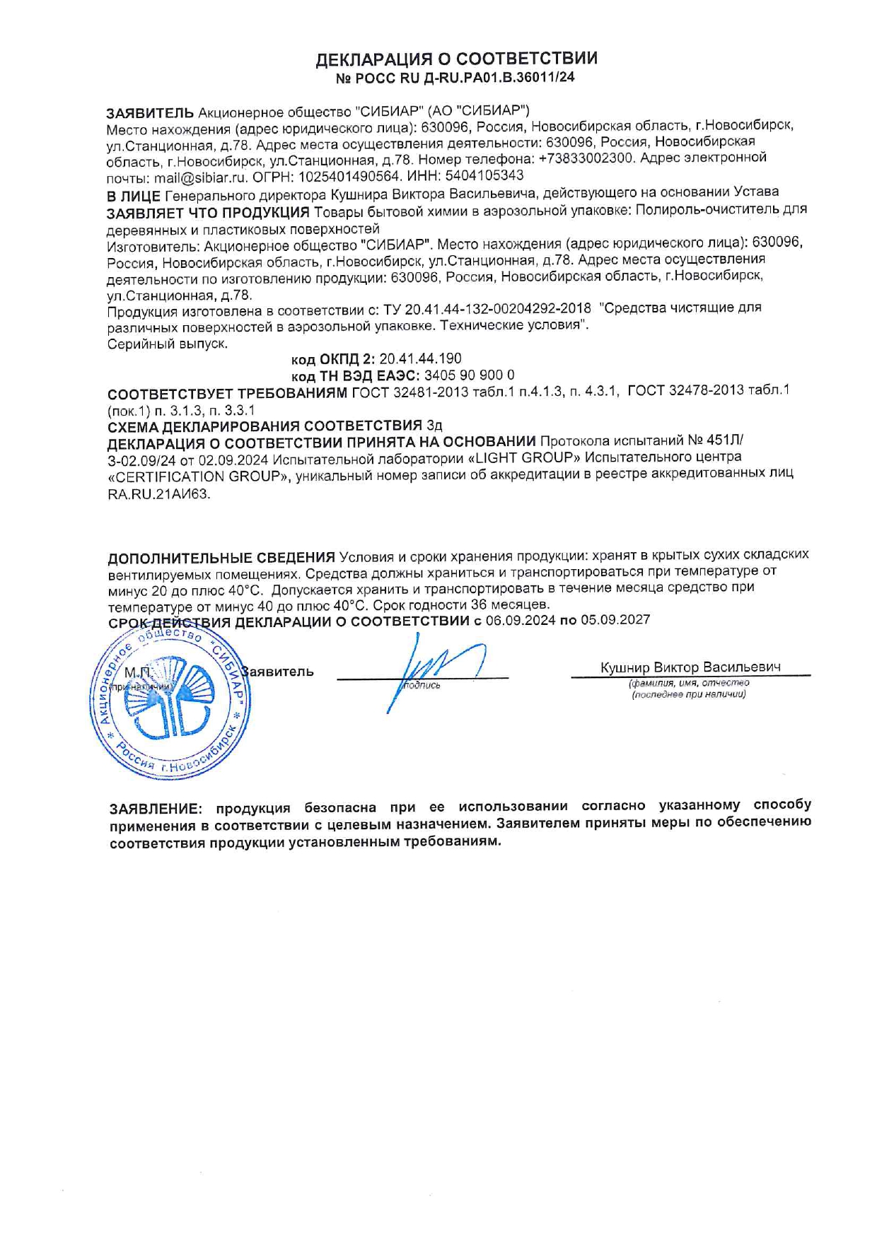 Полироль-очиститель для мебели 300 мл, LIMPIA "Чистота и свежесть", СИБИАР Код товара: 701298 158,56 ₽ Купить Производитель:LIMPIA С легкостью удаляет следы пальцев и грязные пятна с поверхности. Возвращает естественную красоту мебели благодаря содержащемуся в составе натуральному карнаубскому воску. Регулярное применение продлевает срок службы мебели. LIMPIA "Чистота и свежесть" предназначен для ухода за домашней и офисной мебелью, деревянными, лаковыми и пластмассовыми покрытиями, также оргтехникой. Средство придаёт блеск и антистатические свойства внешним и внутренним деревянным, пластиковым и резиновым поверхностям, эффективно очищает их от пыли, жира, масла и других загрязнений, предотвращает процесс старения. Способ применения: хорошо встряхнуть баллон и равномерно распылить полироль на обрабатываемую поверхность с расстояния 15-20 см, после чего протереть до блеска сухой мягкой тканью. Применять при температуре не ниже +10 °С. Состав: вода, растворитель 15-30%, пропеллент углеводородный 15-30%, полиметилсилоксановая жидкость не более 5%, функциональные добавки не более 5%, антистатик не более 5%, воск не более 5%, отдушка не более 5%. ТУ 20.41.44-132-00204292-2018Производство: РоссияТип товара: полирольОбъем: 300 млЭффект от использования: антистатическое действие, придает блеск, удаляет грязь, удаляет жирные пятнаНаличие воска в составе: даВид распыления: аэрозольСерия: LIMPIAКонсистенция: жидкаяУпаковка: баллонОтдушка: Чистота и свежестьСрок годности: 36 месВес: 339 грРазмер упаковки: 5.2 × 23 × 5 смОбъём: 0.0008 м3Промежуточная упаковка: 12 штТранспортная упаковка: 12 штШтрих-код: 4600171533909 Сертификат-1.jpg