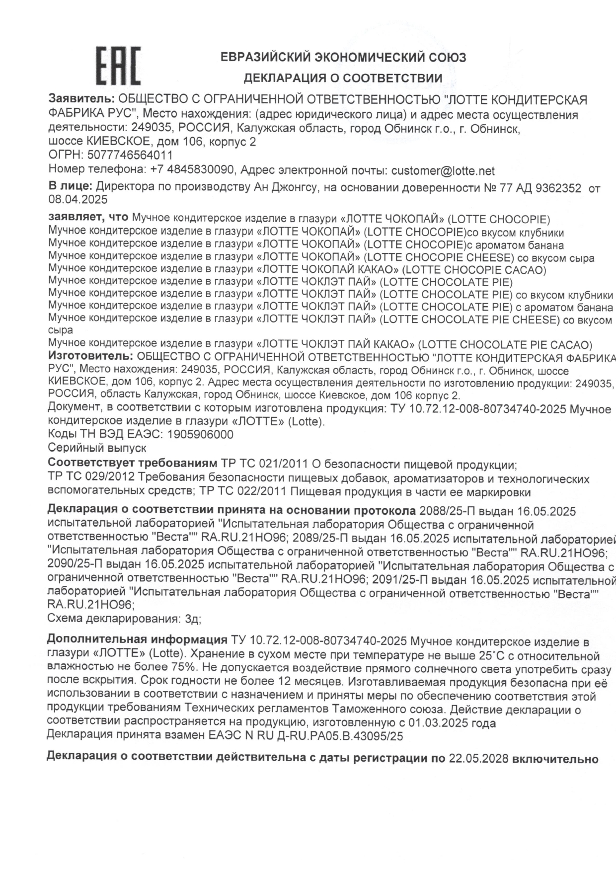 Печенье LOTTE "Choco Pie" ("Чоко Пай"), прослоенное, глазированное, в картонной упаковке, 336 г (12 штук х 28 г) Код товара: 620201 221,1 ₽ Купить Производитель:LOTTE Бисквитное печенье, состоящее из двух слоев мягкого бисквита с молочным суфле между ними и покрытого шоколадной глазурью. Обладает изысканным нежным вкусом. Индивидуальная упаковка каждого печенья в коробке предохраняет продукт от высыхания. Производство: РоссияТип товара: печеньеВес нетто: 336 гВид: бисквитноеНачинка: суфлеТип вкуса: классическийСерия: Choco PieФормат: порционное печеньеВ шоколадной глазури: даСоответствует требованиям ГОСТа: нетИндивидуальная упаковка: даТип упаковки: картонная коробкаСрок годности: 12 мес.Фирма-производитель: LotteСрок годности: 12 месВес: 430 грРазмер упаковки: 5.2 × 23.1 × 20.1 смОбъём: 0.0028 м3Промежуточная упаковка: 8 штТранспортная упаковка: 8 штШтрих-код: 4607176440256 Файлы Сертификат-1.jpg Сертификат-2.jpg Сертификат-3.jpg Сертификат-4.jpg