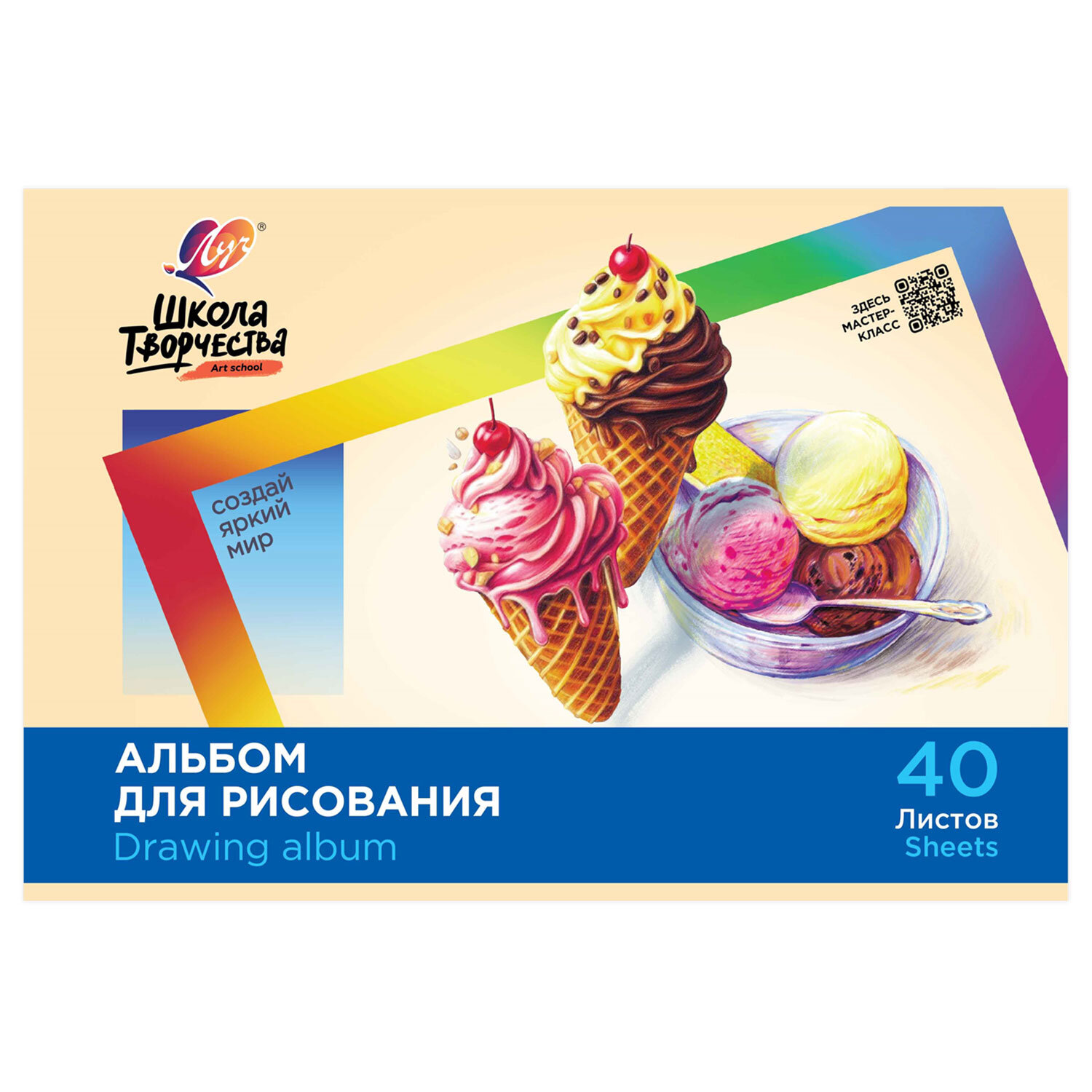 Альбом для рисования, А4, 40 листов, скоба, ЛУЧ "Школа творчества",203х288мм,"Мороженое" Код товара: 107791 124 ₽ Купить Производитель:ЛУЧ Альбом ЛУЧ "Школа творчества" для рисования предназначен как для различных красок на водной основе, так и для карандашей, фломастеров, ручек, угля, сухой и масляной пастели и для других сухих материалов. Содержит 40 листов плотностью 100 г/м2 формата А4 (288х203 мм). Красочная обложка выполнена из мелованного картона. Скрепление листов осуществляется с помощью скрепки. Подходит для смешанных техник рисования: красками, карандашами и фломастерами, ручками, углем, сухой и масляной пастелью и для других сухих материалов.Производство: РоссияКоличество листов: 40Формат: А4Обложка: мелованный картонТип спецэффектов на обложке: нетТип товара: альбом для рисованияДизайн: МороженоеТип скрепления: скобаПлотность бумаги: 100 г/м2Пол ребенка: для всехКоличество дизайнов в минимальной упаковке: 1 шт.Количество дизайнов в транспортной упаковке: 1 шт.Вес: 260 грРазмер упаковки: 0.7 × 20.3 × 28.8 смОбъём: 0.0004 м3Промежуточная упаковка: 35 штТранспортная упаковка: 35 штШтрих-код: 4601185020652