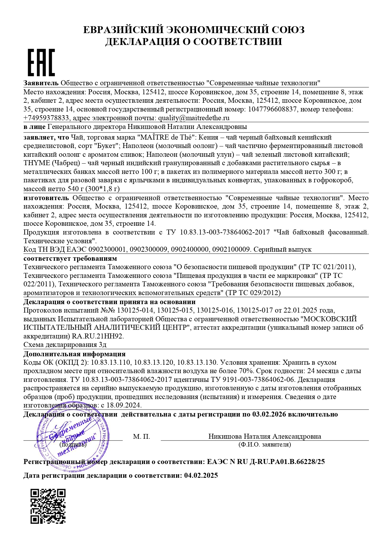 Чай листовой MAITRE "Наполеон" улун молочный 100 г, жестяная банка Код товара: 620403 803,74 ₽ Купить Производитель:MAITRE Чай MAITRE (Мэтр) "Наполеон" - чай с мягким молочным вкусом даёт яркий, прозрачный настой золотистого цвета. Обладает тонким ароматом с нежным оттенком молочной карамели. Производство: РоссияВид чая: зеленыйСерия: НаполеонАромат: классическийМасса нетто: 100 гУпаковка: жестяная банкаСрок годности: 24 мес.Фирма-производитель: Современные чайные технологииСрок годности: 24 месВес: 221 грРазмер упаковки: 9.9 × 10.7 × 9.7 смОбъём: 0.0014 м3Промежуточная упаковка: 6 штТранспортная упаковка: 6 штШтрих-код: 4607099090286 Сертификат-1.jpg Сертификат-2.jpg Сертификат-3.jpg