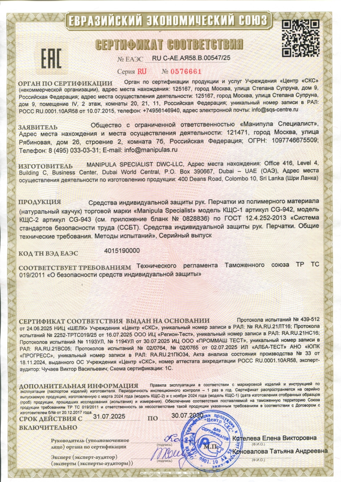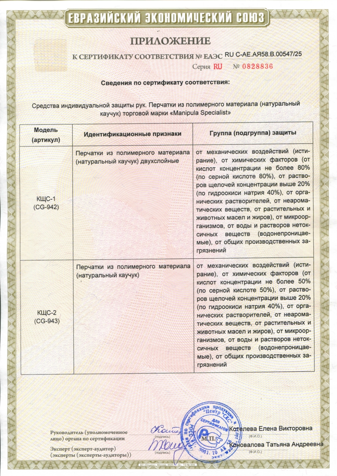 Перчатки латексные MANIPULA "КЩС-1", двухслойные, размер 10, XL (очень большой), черные Код товара: 605828 196,6 ₽ Купить Производитель:MANIPULA Двухслойные латексные герметичные перчатки без внутренней подкладки, обеспечивают высокий уровень тактильной чувствительности. Имеют высокую устойчивость к моющим средствам. Внутренняя поверхность обработана ионами серебра по технологии "Silver". Хлорирование поверхности для увеличения механической прочности и снижения аллергических реакций на латексные протеины. Текстура рабочей поверхности «ромб» обеспечивает отличный сухой и влажный захват. Безопасны для контакта с пищевыми продуктами. Перчатки "КЩС-1" рекомендованы для защиты рук от химических факторов (воды, кислот концентрацией до 80%, щелочей до 50%, органических растворителей (этанол, ацетон), растительных жиров), микроорганизмов и механических воздействий (истирание). Не использовать для грубых механических работ.Производство: МалайзияЗащита от: химических воздействийРазмер: 9-10 (XL)Размер производителя: 10 (XL)Вид: КЩСМатериал основы: латексПокрытие внешнее: нетОбработка поверхности: ионы серебра Silver, хлорированиеПодкладка: нетСерия: КЩССтепень защиты от кислот: 80%Степень защиты от щелочей: 50%Поверхность области захвата: рельефная Для применения в пищевой промышленности: даСоответствует требованиям ГОСТа : ГОСТ EN ISO 374-1:2016/Type B, ГОСТ EN ISO 374-5:2016, ГОСТ ЕN 388:2016 (1011Х), ГОСТ 12.4.252-2013Количество в комплекте: 1 парДлина: 300 ммТолщина: 0.45 ммЦвет: черныйСрок годности: 60 месВес: 92 грРазмер упаковки: 2.3 × 20.7 × 14 смОбъём: 0.0003 м3Промежуточная упаковка: 12 штТранспортная упаковка: 120 штШтрих-код: 4630038892504 Файлы Сертификат-1.jpg Сертификат-2.jpg Сертификат-3.jpg Сертификат-4.jpg