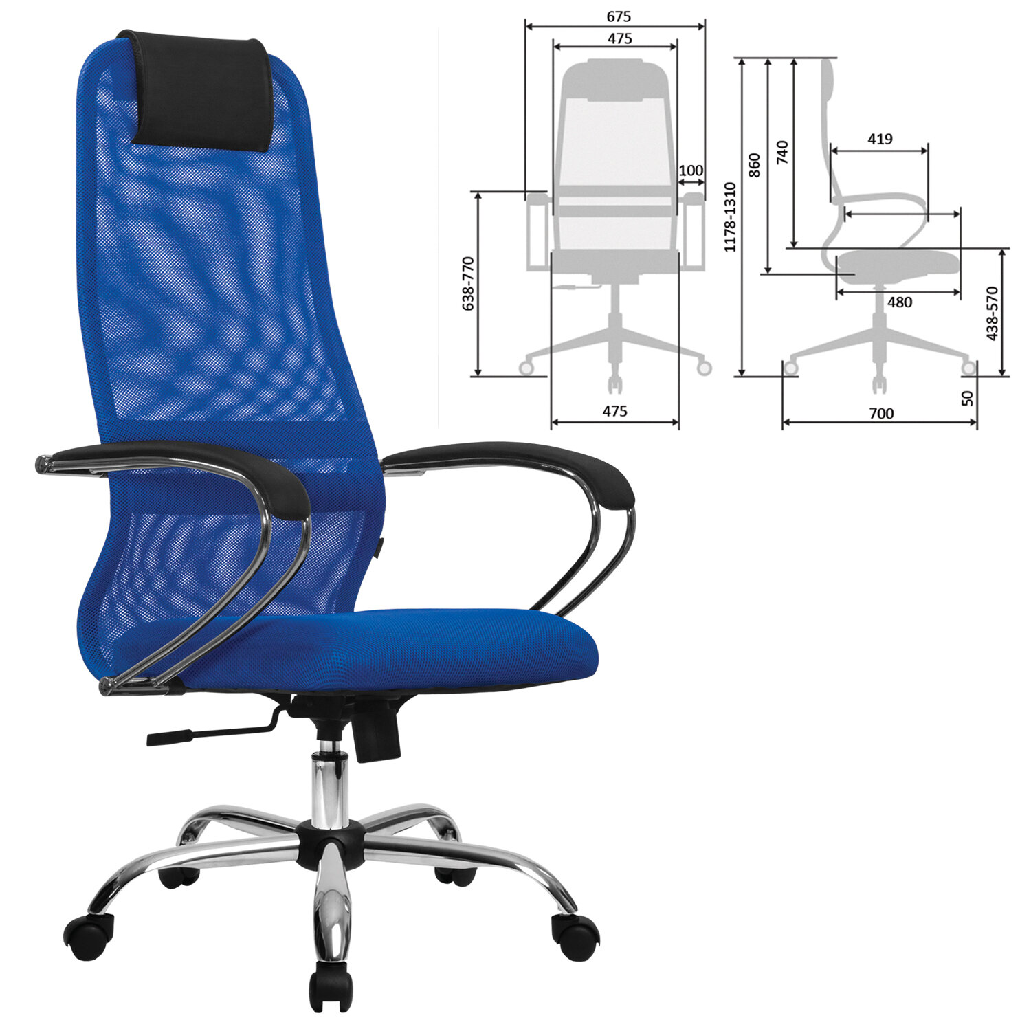 Кресло офисное МЕТТА "SU-B-8" хром, ткань-сетка, сиденье мягкое, синее Код товара: 532431 13 756,02 ₽ Купить Производитель:МЕТТА Наиболее популярная, классическая модель офисных кресел МЕТТА. Сочетает в себе высокую надежность, эргономику, соответствующую анатомической форме человека, современный дизайн и максимальный комфорт по доступной цене. Спинка высокая, эргономичной формы с ярко выраженной поясничной поддержкой. Спинка имеет сверхпрочный стальной каркас с износостойким полимерным покрытием черного цвета. Спинка снабжена мягким комфортным подголовником. Сиденье средней жесткости, объемное на столярном каркасе. Обивка из износоустойчивой "дышащей" сетчатой ткани. Подлокотники стальные классические покрытые зеркальным хромом, с мягкими накладками из экокожи. Пятилучие – металлическое хромированное. Модель оснащена механизмом качания "Top-Gun" с регулировкой под вес и возможностью фиксации в рабочем положении.Производство: РоссияМатериал обивки: ткань/сеткаМаксимальная нагрузка: до 150 кгЦвет обивки: синийТип механизма кресла: "Топ-ган" - качание с регулировкой под вес и фиксацией в 1 положенииСетчатая спинка: даКрестовина (пятилучие): металл/хромированный металлПодлокотники: хром с накладкамиМинимальная высота кресла: 1178 ммМаксимальная высота кресла: 1310 ммШирина кресла: 675 ммМинимальная высота до сиденья: 438 ммМаксимальная высота до сиденья: 570 ммСиденье ширина: 475 ммСиденье глубина: 480 ммСпинка ширина: 475 ммСпинка высота: 860 ммСерия: SU-8Соответствует требованиям ГОСТа: ГОСТ 19917-93Поставляется в разобранном виде: даВес: 16,06 кгРазмер упаковки: 91 × 68 × 25 смОбъём: 0.1547 м3Промежуточная упаковка: 1 штТранспортная упаковка: 1 штШтрих-код: 4665316737277 Файлы Приложение-1.pdf Приложение-2.pdf Приложение-3.pdf Сертификат-1.jpg Сертификат-2.jpg Сертификат-3.jpg Сертификат-4.jpg