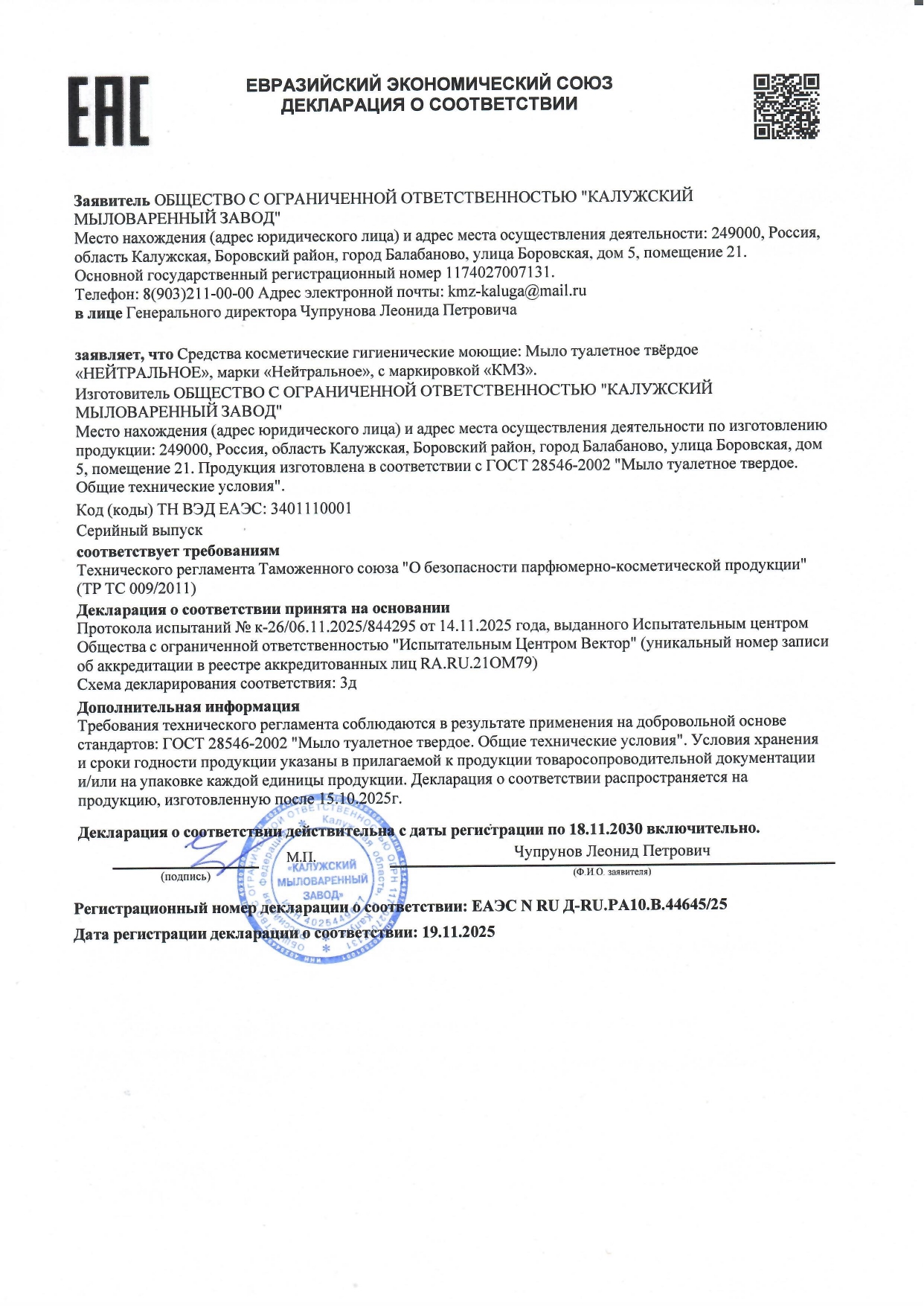 Мыло туалетное 100 г ММЗ/КМЗ НЕЙТРАЛЬНОЕ (марка Н) Код товара: 607644 32,04 ₽ Купить Производитель:ММЗ Туалетное мыло марки НЕЙТРАЛЬНОЕ не содержит содопродуктов и имеет высокий показатель пенообразования. Благодаря отдушкам премиального качества имеет насыщенный нейтральный аромат. Глицерин, входящий в состав туалетного мыла, смягчает и увлажняет кожу. Изготовлено из натуральных жиров и масел. Предназначено для мытья рук и тела. ГОСТ 28546-2002. Состав: натриевые соли жирных кислот натуральных пищевых жиров, пальмового и кокосового масел, лауриновая кислота, вода, парфюмерная композиция, глицерин, хлорид натрия, антал П-2, диоксид титана. Это товар эконом-сегмента, поэтому он отличается привлекательной ценой. Товар обладает базовым набором характеристик и простой упаковкой, при этом полностью соответствует основным требованиям потребителей.Производство: РоссияТип: туалетноеВес: 100 гОтдушка: нейтральнаяЭффект от использования: увлажнениеКоличество в упаковке: 64 шт.Марка: НейтральноеТовар относится к сегменту ЭКОНОМ: даСерия: СТАНДАРТВид упаковки: флоупакСрок годности: 36 месРазмер упаковки: 2.5 × 8.9 × 4.9 смОбъём: 0.0002 м3Промежуточная упаковка: 64 штТранспортная упаковка: 64 штШтрих-код: 4620771972472 Файлы Сертификат-1.jpg Сертификат-2.jpg Сертификат-3.jpg