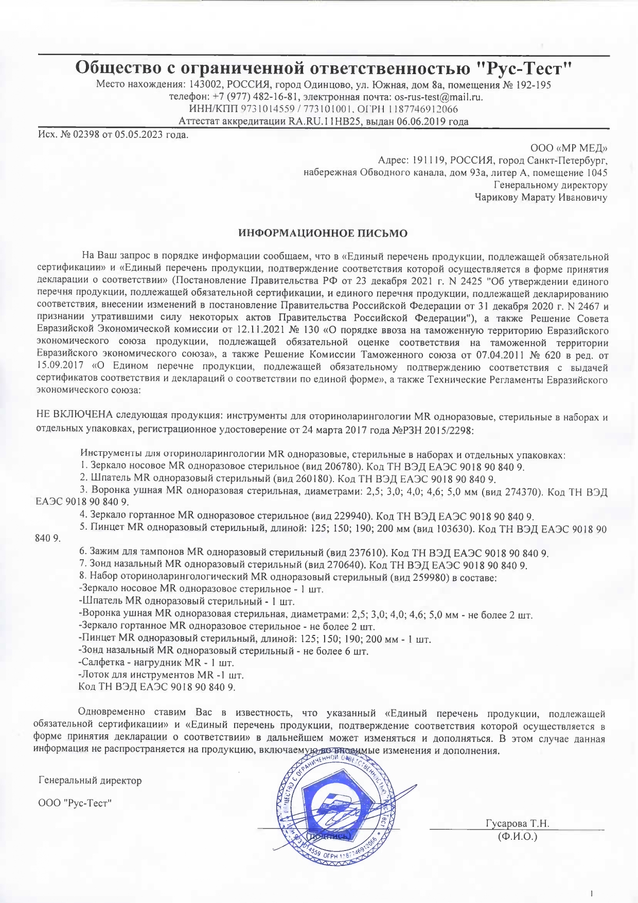 Воронка ушная одноразовая №1 (3 мм), КОМПЛЕКТ 100 шт., MR MED Код товара: 631547 861,54 ₽ Купить Производитель:MR MED Воронка ушная предназначена для проведения диагностической отоскопии. Изготовлена из теплопроводного, атравматичного, черного пластика. Атравматичный закругленный конец исключает риск повреждения тканей. Размер – 1:3 мм. Высота воронки: 35±2 мм, диаметр широкой части: 28±2 мм. Стерилизована оксидом этилена. Ушная воронка упакована в герметичный пакет, снабженный насечкой, обеспечивающей быстрое вскрытие без использования ножниц.Производство: КитайТип: воронка ушнаяКоличество в комплекте: 100 шт.Одноразовый: даСтерильный: даОсобенность: -Размер: 3 ммУпаковка: пакетСрок годности: 60 месВес: 428 грРазмер упаковки: 11.6 × 24.2 × 18.4 смОбъём: 0.0058 м3Промежуточная упаковка: 20 штТранспортная упаковка: 20 штШтрих-код: 4627093270163 Сертификат-1.jpg Сертификат-2.jpg Сертификат-3.jpg