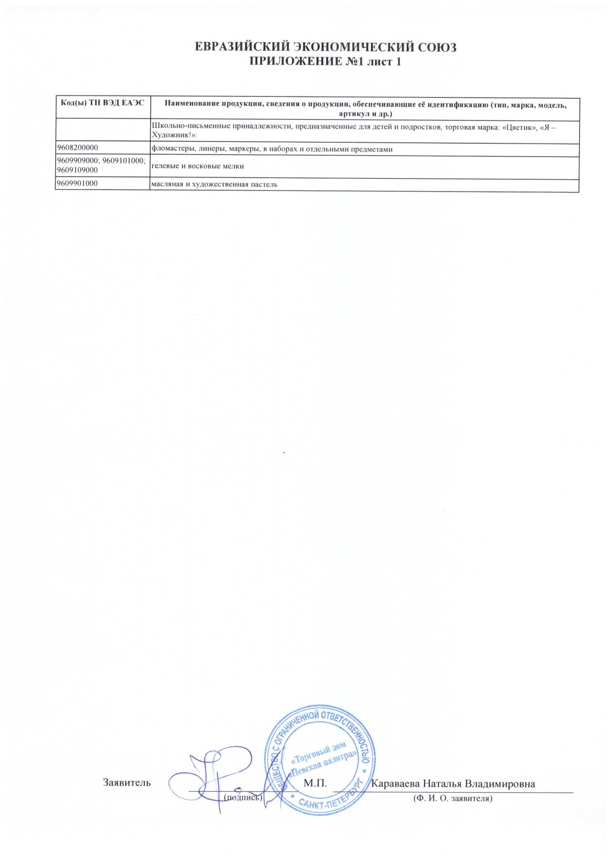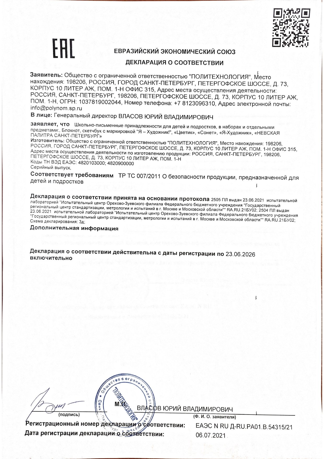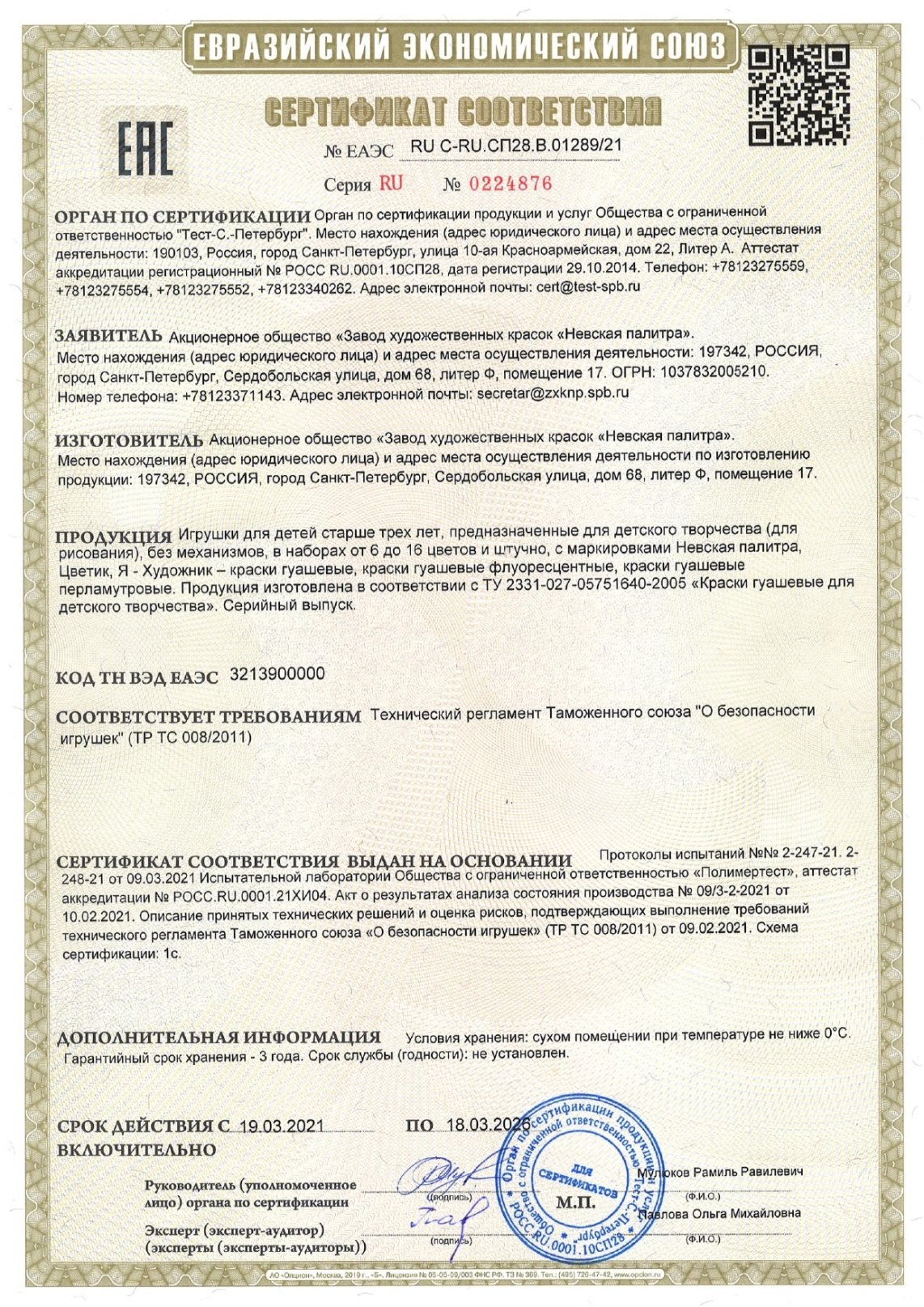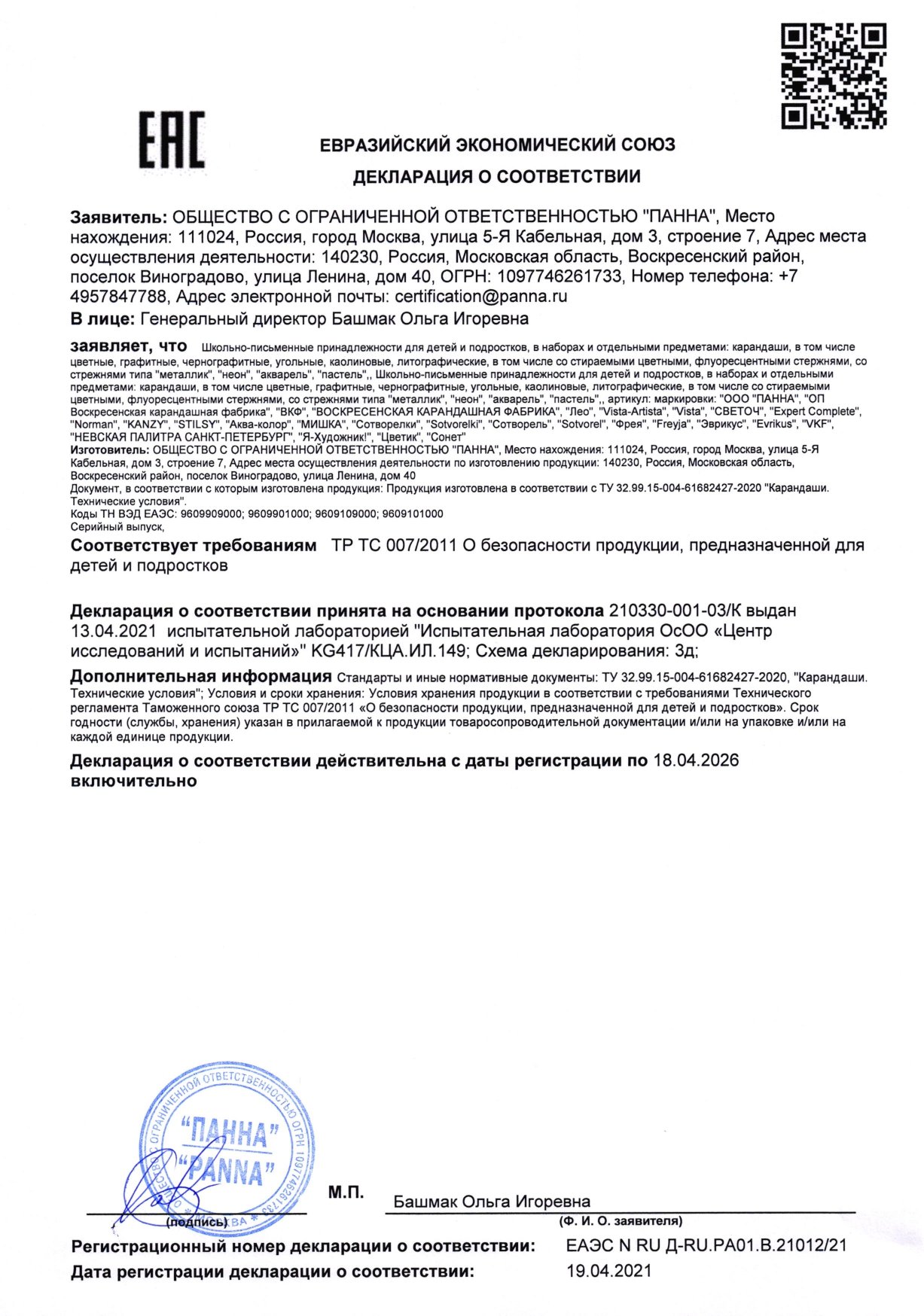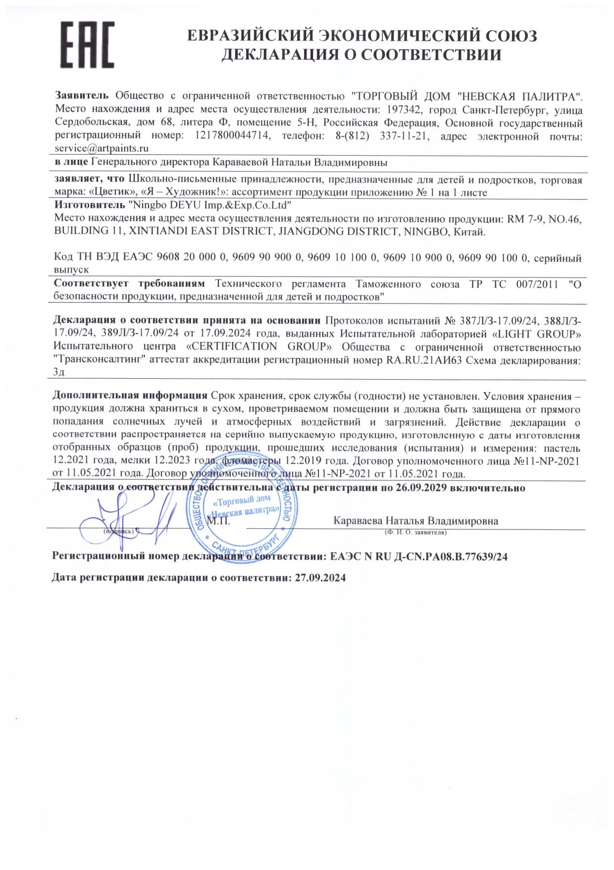 Набор для творчества "Я - художник!", 10 предметов, Невская Палитра Код товара: 666047 2 323,3 ₽ Купить Производитель:НЕВСКАЯ ПАЛИТРА Набор "Я - Художник!" Невская Палитра предназначен для детей младшего школьного возраста (7–12 лет). Включает все необходимые материалы для рисования, лепки и моделирования. Набор можно использовать как дома, так и на занятиях. Компактная коробка-бокс со складной ручкой удобна для переноски и может служить местом для хранения предметов. Состав набора: 1. Набор акварели медовой "Я - Художник!", 24 цвета. 2. Набор гуаши "Я - Художник!", 12 цветов по 20 мл. 3. Скетчбук "Я - Художник!", 50 листов. 4. Набор акварельных карандашей "Я - Художник!", 12 цветов. 5. Набор кистей "Я - Художник!", 5 штук. 6. Набор масляной пастели "Я - Художник!", 12 цветов. 7. Набор пластилина со стеком "Я - Художник!", 12 цветов. 8. Набор фломастеров "Я - Художник!", 18 цветов. 9. Стакан-непроливайка. 10. Пластиковая палитра.Производство: РоссияТип товара: набор для творчестваКоличество предметов: 10 шт.Пол ребенка: универсальныйДлина: 27 смШирина: 9 смГлубина: 31 смМатериал упаковки: плотный картонСрок годности: 24 месВес: 2,05 кгРазмер упаковки: 9.5 × 31.1 × 27.2 смОбъём: 0.0084 м3Промежуточная упаковка: 4 штТранспортная упаковка: 4 штШтрих-код: 4690699029312 Файлы Сертификат-1.jpg Сертификат-2.jpg Сертификат-3.jpg Сертификат-4.jpg Сертификат-5.jpg Сертификат-6.jpg Сертификат-7.jpg Сертификат-8.jpg Сертификат-9.jpg Сертификат-10.jpg Сертификат-11.jpg Сертификат-12.jpg Сертификат-13.jpg Сертификат-14.jpg Сертификат-15.jpg Сертификат-16.jpg