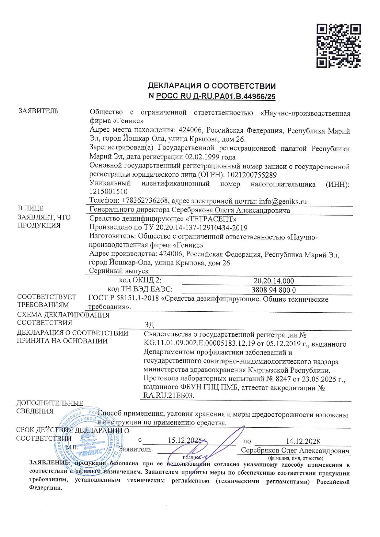 Антисептик для рук и поверхностей спиртосодержащий (15%) 5 л, НИКА-ТЕТРАСЕПТ, дезинфицирующий, жидкость Код товара: 606765 1 263,62 ₽ Купить Производитель:НИКА Средство "Тетрасепт" представляет собой готовый к применению кожный антисептик в виде прозрачной бесцветной жидкости с характерным спиртовым запахом. Антимикробная активность в отношении бактерий, вирусов, грибов, возбудителей особо опасных инфекций, споровых форм бактерий. Средство применяется в качестве кожного антисептика и для быстрой дезинфекции, в том числе поверхностей или предметов. Средство обладает пролонгированным антимикробным эффектом в течение 3 часов. Состав: изопропиловый спирт 15%, дидецилдиметиламмоний хлорид 0,25%, полигексаметиленбигуанидин гидрохлорид (ПГМБгх) 0,1%, а также функциональные добавки. Срок годности – 5 лет.Производство: РоссияФорма выпуска: жидкостьРежимы дезинфекции: дезинфекция ИМН, не совмещенная с ПСО, дезинфекция кожных покровов, дезинфекция поверхностейОбласть применения: детские учреждения (детсады, школы и т.п.), коммунальные объекты (бани, бассейны, гостиницы, общественные туалеты и т.п.), курортные, спортивные и культурно-оздоровительные комплексы, лаборатории, ЛПУ, парикмахерские, косметические салоны и т.п., предприятия общественного питания, предприятия перерабатывающей промышленности, применение в быту, учреждения культуры, отдыха (кинотеатры, музеи, театры), учреждения соцобеспеченияОбъем: 5 лТип активности: бактерии, вирусы, возбудители особо опасных инфекций, патогенные грибы, спороцидное действиеСодержит: гуанидин, спирт, ЧАССоответствует требованиям ГОСТа: ГОСТ 12.1.007-76 п.1.2, 1.3, ГОСТ Р 56990-2016, ГОСТ Р 58151.1-2018Подходит для использования в детских учреждениях: даПролонгированный антимикробный эффект: даНаличие СГР на дез. средство (кожный антисептик): даДозатор: отсутствуетУпаковка: канистраСрок годности: 60 месВес: 5,13 кгРазмер упаковки: 28.9 × 18.5 × 13.6 смОбъём: 0.0081 м3Промежуточная упаковка: 4 штТранспортная упаковка: 4 штШтрих-код: 4603231008195 Файлы Приложение-1.pdf Приложение-2.pdf Сертификат-1.jpg Сертификат-2.jpg