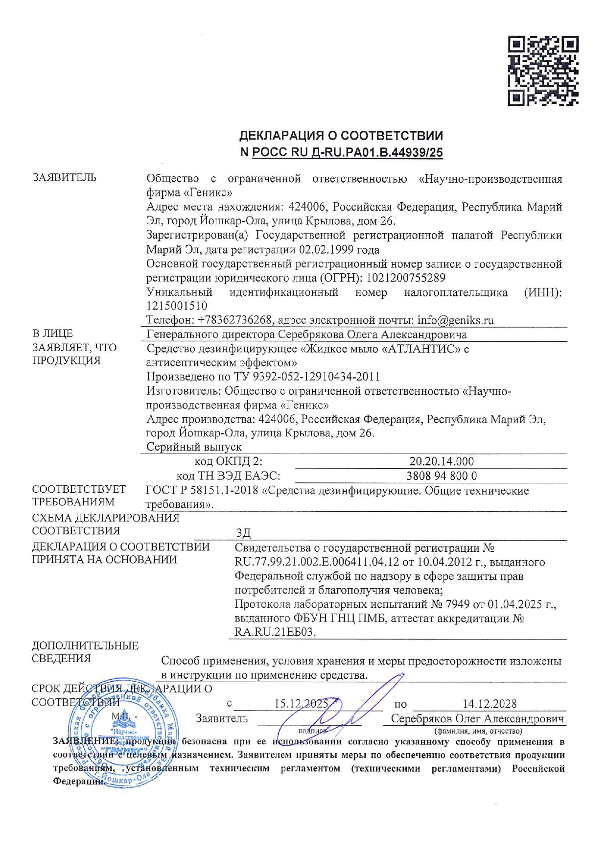 Мыло жидкое дезинфицирующее 5 л АТЛАНТИС, с антисептическим эффектом Код товара: 608976 1 432,44 ₽ Купить Производитель:НИКА Мыло жидкое дезинфицирующее НИКА "Атлантис" способно предотвратить риск заражения болезнетворными бактериями и опасными микроорганизмами. Разрешено для использования в детских учреждениях, включая отделения неонатологии, роддома, палаты новорожденных и т.д. Действующие вещества: - тетранил-У; - увлажняющие и ухаживающие за кожей добавки. Антимикробная активность: - бактерии. Гигиеническая обработка рук: 2,0 мл - 1 минута. Гигиеническая обработка рук хирургов перед антисептиком: 3,0 мл - 1 минута.Производство: РоссияОбъем: 5 лНазначение: для гигиенической обработки рукДействие: антибактериальноеБез запаха: даПодходит для использования в детских учреждениях: даСерия: АтлантисpH: 6.5Упаковка: канистраСрок годности: 36 месВес: 5,46 кгРазмер упаковки: 28.7 × 18.3 × 13.6 смОбъём: 0.0081 м3Промежуточная упаковка: 4 штТранспортная упаковка: 4 штШтрих-код: 4603231003930 Файлы Приложение-1.pdf Приложение-2.pdf Сертификат-1.jpg Сертификат-2.jpg