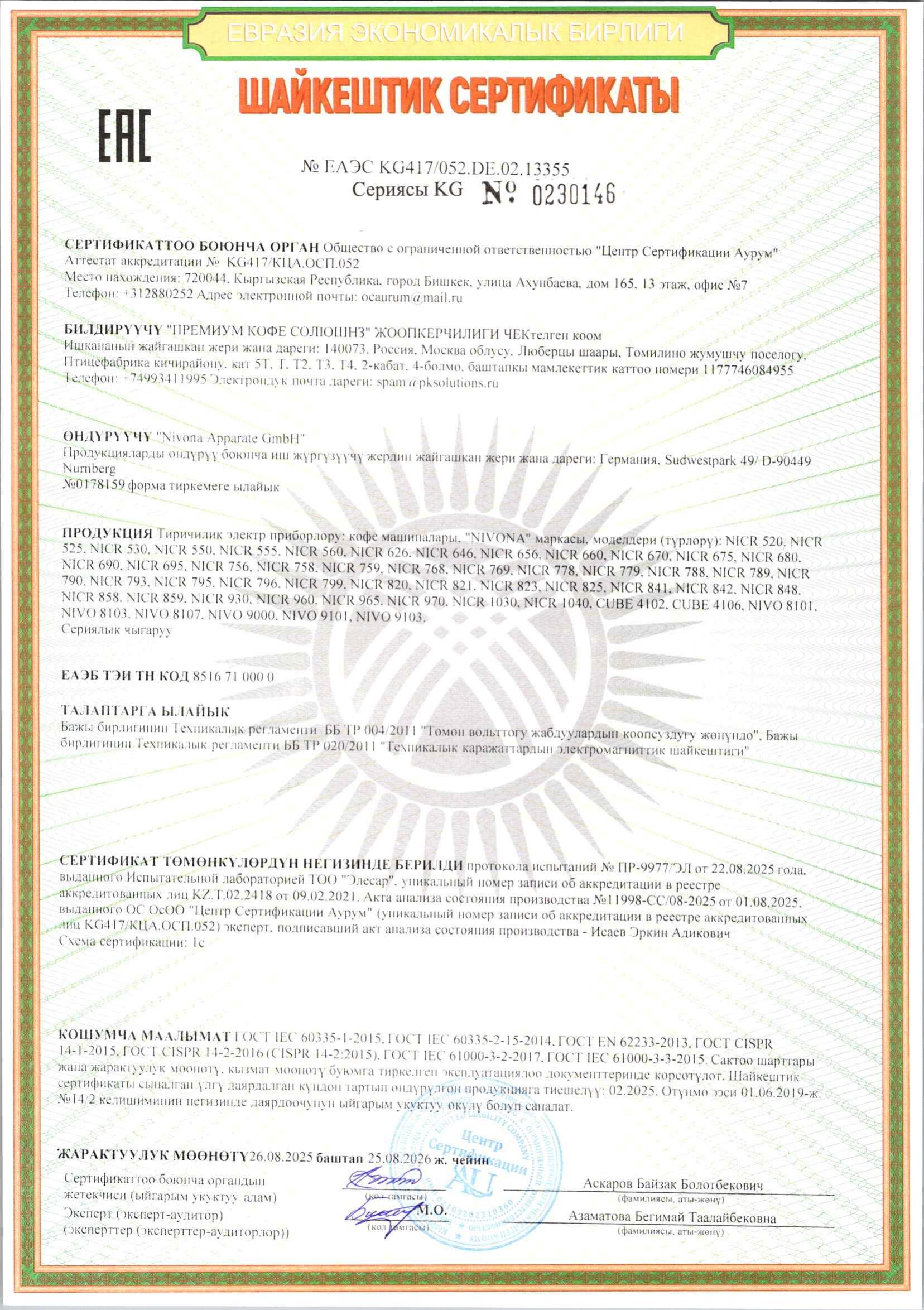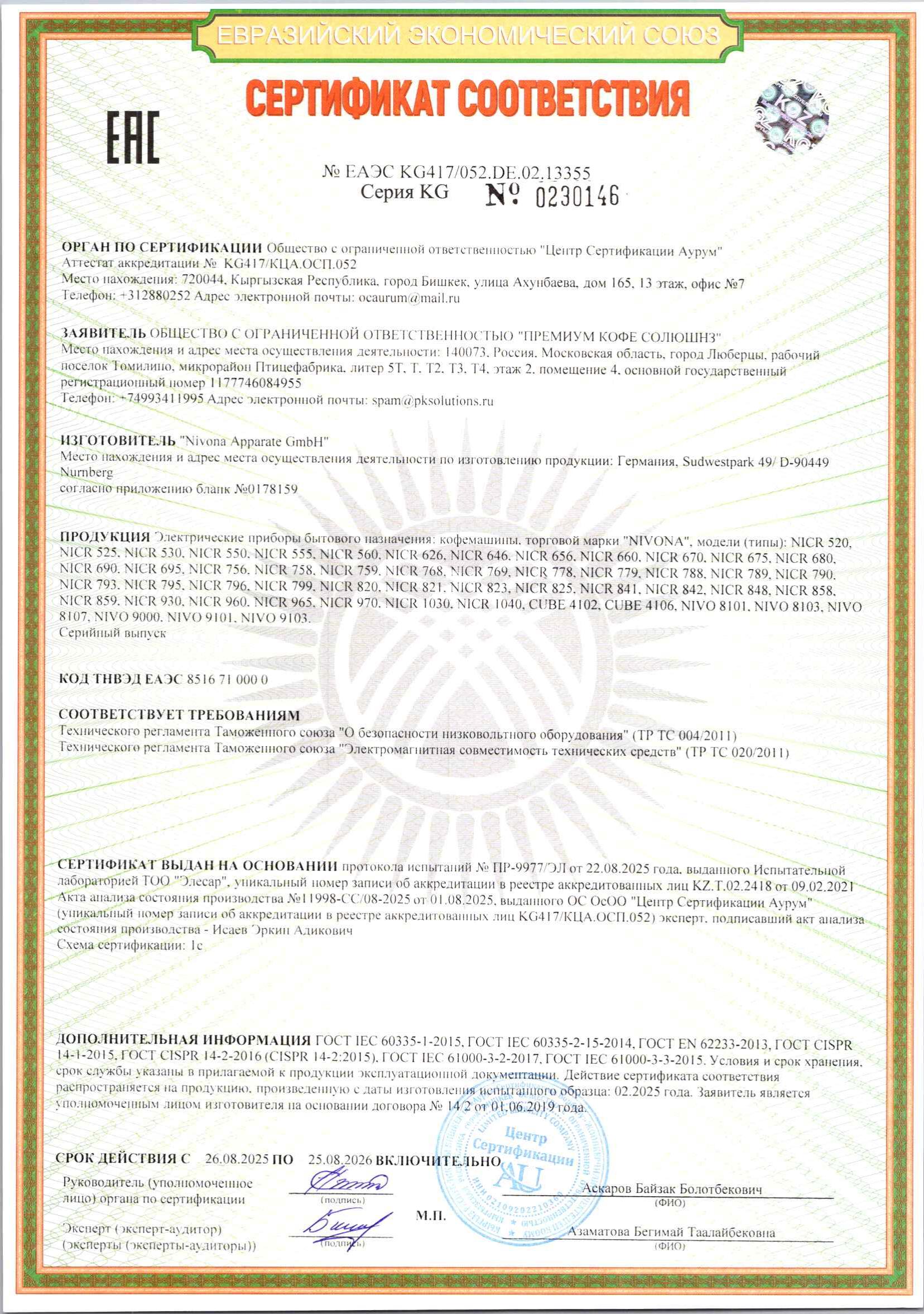 Кофемашина NIVONA CafeRomatica NICR690, 1455 Вт, объем 2,2 л, автокапучинатор, черная Код товара: 456538 79 476,96 ₽ Купить Производитель:NIVONA Кофемашина новой серии NICR690 с усовершенствованной системой подачи кофе и молока из одного сопла позволит вам познакомиться с миром кофе с совершенно новой стороны. Приготовление ароматного кофе еще никогда не было таким простым. Кофемашина Nivona CafeRomatica NICR 690 позволит быстро приготовить любимый напиток. Вы сможете приготовить превосходную молочную пенку с устройством EASY SPUMATOPRE и все это из одного носика. Для вашего удобства предусмотрен режим "Мой кофе", позволяющий сохранить до 5 индивидуальных и любимых рецептов напитков. Цветной TFT-дисплей поможет ориентироваться в настройках и оповестит о нехватке воды или кофе, заполнении отсека для отходов и необходимости очистки. Прибор управляется электронным способом, позволяя регулировать уровень крепости (пять ступеней), температуру напитка, объем порции (20–240 мл) и степень помола зерен. Модель дополнена технологией «Быстрый пар», благодаря которой мгновенно переключается с одного режима на другой. Прибор позволяет приготовить эспрессо, капучино, лунго, гран лунго и латте за счет встроенного автоматического капучинатора. Система сбалансированного аромата «Barista in a Box» - выбор одного из трёх уровней экстракции для великолепного вкуса кофе. Прибор автоматически выключается по завершении работы. Противокапельная система позволит сохранить рабочую зону чистой. Диспенсер регулируется по высоте, что дает возможность использовать емкости разного размера (до 14 см в высоту). Модель с функцией автоматической промывки проста в обслуживании. Кофемашина Nivona CafeRomatica NICR 690 оборудована фильтром, который снижает жесткость воды. Доступна опция подачи обычной горячей воды. Емкость, собирающая отходы, вмещает до 11 порций. Встроенная кофемолка измельчает до 250 г зерен за один раз. Вода заливается в резервуар объемом 2,2 л. Производитель оставляет за собой право без предварительного уведомления вносить изменения в технические характеристики, комплектацию и конструкцию, не ухудшающие эксплуатационные характеристики изделия.Производство: ПортугалияМощность: 1455 ВтДавление: 15 БарЕмкость резервуара для воды: 2.2 лЕмкость резервуара для зерен: 250 гИспользуемый кофе: зерновой, молотыйКапучинатор: полуавтоматическийТип нагревателя: термоблокАвтоматическая программа очистки от накипи: даАвтоматическая программа очистки от кофейного жира: даВстроенная кофемолка: жерноваяМатериал жерновов: нержавеющая стальСъемный лоток для сбора капель: даРегулируемый по высоте дозатор: даРегулировка степени помола: даРегулировка температуры кофе: даРегулировка крепости кофе: даПодача горячей воды (для чая): даОдновременное приготовление двух чашек: даЖК-дисплей: даКомплектация: инструкция, мерная ложка, трубка для молока, фильтр для воды, чистящие таблеткиМатериал корпуса: пластикЦвет корпуса: черныйШирина: 240 ммВысота: 460 ммГлубина: 340 ммВес: 8.4 кгСерия: NICR690Размер упаковки: 30 × 53.7 × 39.4 смОбъём: 0.0635 м3Промежуточная упаковка: 1 штТранспортная упаковка: 1 штШтрих-код: 4260083466902 Файлы Приложение-1.pdf Сертификат-1.jpg Сертификат-2.jpg Сертификат-3.jpg Сертификат-4.jpg Сертификат-5.jpg Сертификат-6.jpg Сертификат-7.jpg Сертификат-8.jpg