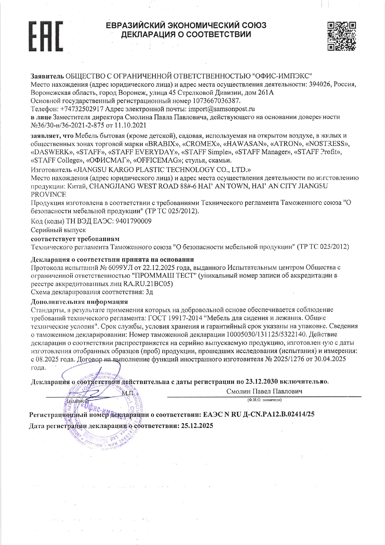 Стул складной NOSTRESS (НОСТРЕСС) "Country FC-003", усиленный каркас, НАГРУЗКА до 150 кг, пластик HDPE, белый Код товара: 680056 2 167 ₽ Купить Производитель:NOSTRESS Складной стул NOSTRESS "Country FC-003" – универсальное решение для дома, дачи, бизнеса и выездных мероприятий. Складной стул NOSTRESS "Country FC-003" отличается прочным стальным каркасом, износостойким сиденьем из HDPE-пластика и выдерживает нагрузку до 150 кг, оставаясь устойчивым и безопасным при ежедневном использовании. • Основные преимущества: - Размеры сиденья 390х390 мм и высота сиденья от пола 475 мм обеспечивают комфортную посадку для взрослых и подростков, что делает стул удобным для семейных мероприятий, пикников, ярмарок и мастер-классов. - HDPE-пластик устойчив к влаге и ультрафиолету, легко очищается и не требует специального ухода. • Удобство и мобильность: - Складная конструкция позволяет мгновенно разложить и убрать стул, экономя место в квартире, офисе, кафе или подсобном помещении. - В сложенном виде стул компактен и удобен для транспортировки благодаря встроенной ручке для переноски, что особенно актуально для кейтеринга, выездной торговли и мероприятий на природе. • Универсальность использования: - Подходит для использования в помещении и на улице: для дачных террас, веранд, пикников, выставок, ярмарок, праздников и рабочих зон. - Устойчивое основание выдерживает до 150 кг нагрузки, поэтому стул надёжен для длительного сидения. - Нейтральный дизайн белого сиденья легко сочетается с любыми столами и интерьером, что важно для кафе, банкетных залов и мероприятий.Производство: КитайТип товара: cтулСкладной: даКоличество в комплекте: 1 шт.Материал столешницы/сиденья: HDPE-пластикМатериал каркаса: стальЦвет столешницы/сиденья: белыйЦвет каркаса: серыйМатериал спинки: HDPE-пластикГабариты стола: - ммГабариты стула/скамьи: ш440 х г490 х в835 ммМаксимальная нагрузка на стол: 0 кгМаксимальная нагрузка на стул: 150 кгСерия: FC-003Вес: 3,96 кгРазмер упаковки: 4 × 97 × 44 смОбъём: 0.0244 м3Промежуточная упаковка: 6 штТранспортная упаковка: 6 штШтрих-код: 4606224477787 Сертификат-1.jpg Сертификат-2.jpg Сертификат-3.jpg