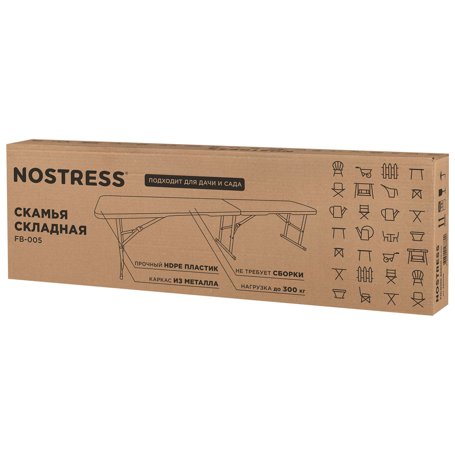 Скамья складная NOSTRESS (НОСТРЕСС) "Country FB-005" (1800х280х435 мм), пластик HDPE, белая Код товара: 680058 4 107 ₽ Купить Производитель:NOSTRESS Скамья складная NOSTRESS "Country FB-005" – универсальное решение для дома, дачи, бизнеса и выездных мероприятий. Скамья складная NOSTRESS "Country FB-005" – практичное и надёжное решение для дома, дачи, мероприятий и коммерческого использования. Конструкция выдерживает распределённую нагрузку до 300 кг, остаётся устойчивой и безопасной при интенсивной ежедневной эксплуатации. • Основные преимущества: - Прочная стальная рама с фиксирующими элементами предотвращает самопроизвольное складывание и обеспечивает стабильность даже при максимальной нагрузке. - Сиденье из ударопрочного HDPE-пластика устойчиво к влаге и ультрафиолету, легко очищается и не боится перепадов температуры. - Оптимальная длина скамьи позволяет комфортно разместить несколько человек, что удобно для праздников, пикников, очередей, зон ожидания и выездного обслуживания. • Удобство и мобильность: - Складная конструкция позволяет быстро разложить и убрать скамью, экономя место в кладовой, гараже, подсобке или багажнике автомобиля. - В сложенном виде скамья компактна (900х280 мм) и удобна для транспортировки, идеально подходит для кейтеринга, выездной торговли, спортивных и городских мероприятий. • Универсальность использования: - Подходит для эксплуатации как в помещении, так и на улице: для дачных участков, террас, веранд, залов ожидания, ярмарок, фестивалей и корпоративных мероприятий. - Ровное, устойчивое сиденье выдерживает до 300 кг распределённой нагрузки, поэтому на скамью можно безопасно усаживать несколько человек или временно ставить инвентарь и оборудование. - Лаконичный дизайн и нейтральный цвет легко вписываются в любой интерьер и сочетаются со складными столами из HDPE и другой мобильной мебелью.Производство: КитайТип товара: cкамьяСкладной: даКоличество в комплекте: 1 шт.Материал столешницы/сиденья: HDPE-пластикМатериал каркаса: стальЦвет столешницы/сиденья: белыйЦвет каркаса: серыйГабариты стола: - ммГабариты стула/скамьи: ш1800 х г280 х в435 ммМаксимальная нагрузка на стул: 300 кгСерия: FB-005Вес: 7,75 кгРазмер упаковки: 9.9 × 100 × 32.5 смОбъём: 0.0322 м3Промежуточная упаковка: 1 штТранспортная упаковка: 1 штШтрих-код: 4606224477800 Файлы Сертификат-1.jpg Сертификат-2.jpg Сертификат-3.jpg