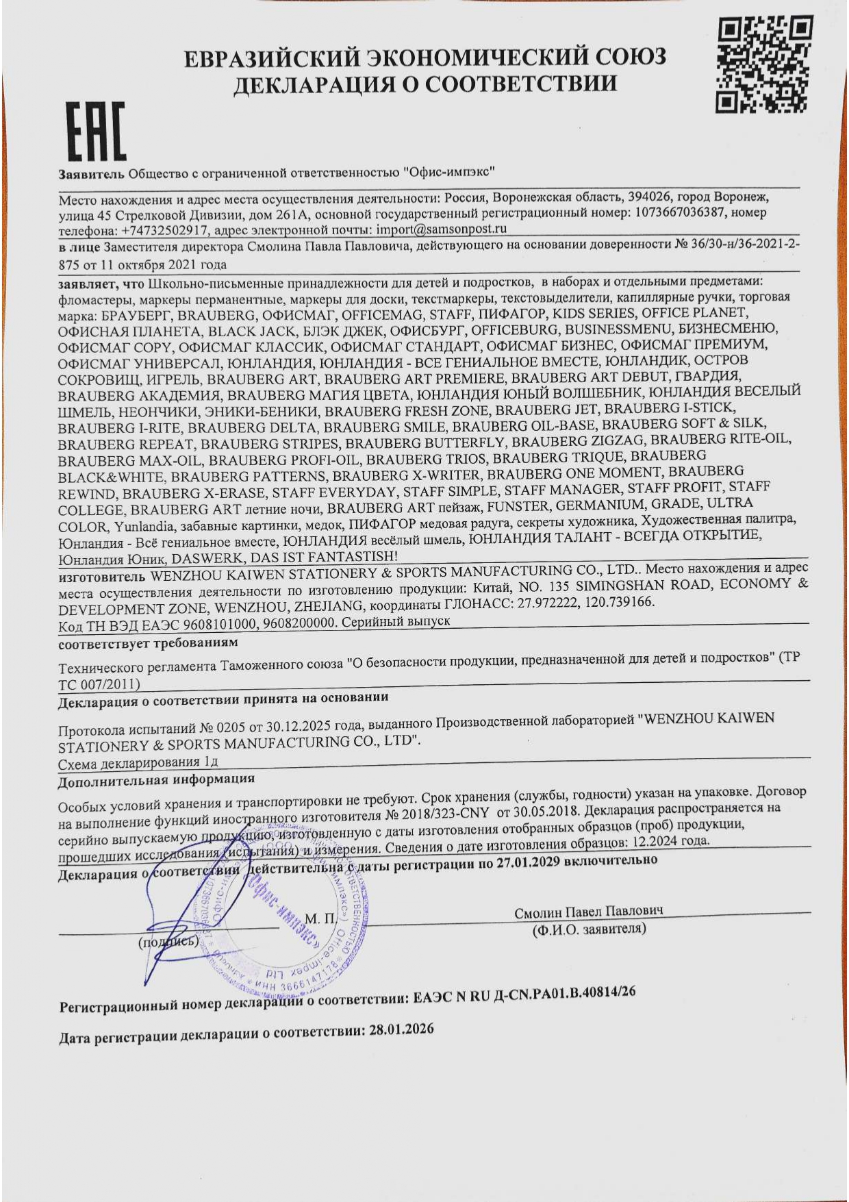 Маркер стираемый для белой доски СИНИЙ, ОФИСМАГ, круглый наконечник, 3 мм Код товара: 152219 52,77 ₽ Купить Производитель:ОФИСМАГ Маркер стираемый для белой доски ОФИСМАГ предназначен для использования на изделиях с магнитно-маркерной поверхностью. Идеально подходит для рисования, учебы, совещаний, проведения планерок. Маркер для доски синего цвета имеет круглый пластиковый корпус диаметром 17 мм. Наконечник круглой формы обеспечивает толщину линии письма 3 мм, что позволяет писать крупным шрифтом, который будет хорошо виден. Основа чернил - спиртовая. Чернила быстро высыхают и легко стираются сухой губкой, не оставляя разводов. Изделие не перезаправляется. Цвет колпачка с клипом соответствует цвету чернил.Производство: КитайЦвет: синийСерия: ОФИСМАГТолщина линии письма: 1, 1,5, 2, 2,5, 3Наконечник: круглыйКоличество в комплекте: 1 шт.Основа чернил: спиртоваяЧернила стираются сухой губкой: даНе протекает при перепаде давления: даНаличие клипа на колпачке: даМатериал корпуса: пластикСрок годности: 60 месВес: 19 грРазмер упаковки: 1.7 × 13.9 × 2 смОбъём: 0.0001 м3Промежуточная упаковка: 12 штТранспортная упаковка: 864 штШтрих-код: 4606224338194 Сертификат-1.jpg Сертификат-2.jpg Сертификат-3.jpg