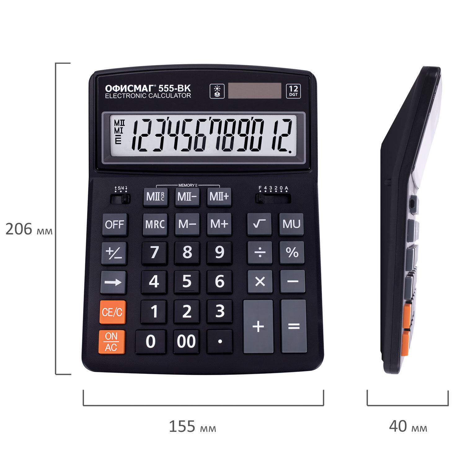 Калькулятор настольный ОФИСМАГ 555-BK (206x155 мм), 12 разрядов, двойное питание, ЧЕРНЫЙ Код товара: 271729 799,37 ₽ Купить Производитель:ОФИСМАГ Настольный калькулятор ОФИСМАГ 555-12-BK – идеальный выбор для офисных и банковских сотрудников, бухгалтеров, а также продающего персонала. Большой дисплей с увеличенным углом обзора, устойчивый корпус для эффективной работы. Калькулятор производит все основные арифметические действия: возведение в степень, вычисления с процентами, извлечение квадратного корня. Незаменим для бухгалтеров благодаря наличию клавиш двойной памяти, «00» и MU для расчетов налогов и торговой наценки. Переключатели округления и положения десятичного знака позволяют производить нужные настройки. Большой двенадцатиразрядный дисплей отображает большие значения с высокой точностью округления. Встроенный аккумулятор и солнечная батарея позволяют калькулятору работать при любом освещении, а клавиша выключения OFF и функция автоматического отключения (через 8-10 минут бездействия) позволяют максимально продлить срок его службы без замены батареи. Размер – 206x155 мм.Производство: КитайРазрядность дисплея: 12Серия: 555Тип размера: полноразмерныйТип применения: для бухгалтеровСтиль: классическийФункционал: вычисление наценки (MU)Исполнение: настольныйЧисло строк дисплея: 1Материал кнопок: пластикТип питания: 1 батарейка LR44 (LR1154/AG13), солнечный элементЦвет панели: черныйДлина корпуса: 206 ммШирина корпуса: 155 ммВысота корпуса: 40 ммВес: 356 грРазмер упаковки: 3.9 × 24.5 × 16.1 смОбъём: 0.0019 м3Промежуточная упаковка: 20 штТранспортная упаковка: 40 штШтрих-код: 4606224399171 Сертификат-1.jpg Сертификат-2.jpg Сертификат-3.jpg