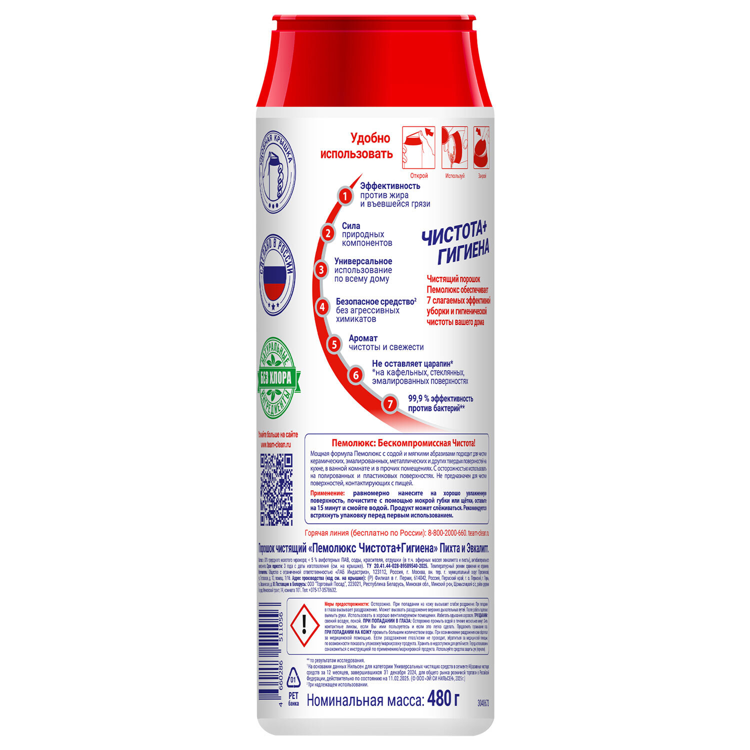 Чистящее средство 480 г, ПЕМОЛЮКС, чистота и гигиена, "Пихта и эвкалипт", порошок Код товара: 601895 111,77 ₽ Купить Производитель:ПЕМОЛЮКС ПЕМОЛЮКС эффективно удаляет жир и въевшуюся грязь. Мощная формула не содержит опасных химикатов и подходит для чистки керамических, эмалированных, металлических и других твердых поверхностей на кухне, в ванной комнате и в других помещениях. Чистящий порошок ПЕМОЛЮКС – универсальное средство для уборки дома. Порошок ПЕМОЛЮКС – это 7 преимуществ быстрой и эффективной уборки. - Пемолюкс не оставляет царапин*. - Средство эффективно борется с въевшейся грязью и жиром на любых поверхностях. - Формула порошка ПЕМОЛЮКС имеет натуральную основу. - Средство поможет навести чистоту во всех бытовых помещениях. - Порошок не содержит агрессивных химикатов, безопасен для посуды и кожи человека. - Средство ПЕМОЛЮКС дарит дому приятный аромат чистоты и свежести. - Перерабатываемая упаковка. *При надлежащем использовании. Применение: нанесите на влажную поверхность, почистите и смойте водой. Продукт может слеживаться. Встряхните упаковку перед первым использованием. Мощная формула ПЕМОЛЮКС с содой и мягким абразивом подходит для чистки керамических, эмалированных, металлических и других твердых поверхностей на кухне, в ванной комнате и прочих помещениях. С осторожностью использовать на полированных и пластиковых поверхностях. Не предназначен для чистки поверхностей, контактирующих с пищей. Состав: больше или равно 30% природного молотого мрамора; более 5% амфотерных ПАВ, соды, сульфата натрия, красителя, отдушки (в том числе лимонена, цитраля). Условия хранения: хранить в сухом месте. Температурный режим хранения не ограничен. Возможно поступление товара как в старом дизайне ПЕМОЛЮКС СОДА-7 "Ослепительно Белый", так и в новом ПЕМОЛЮКС "Чистота + Гигиена".Производство: РоссияФорма выпуска: порошокСерия: порошокОбъем/вес: 480 мл/гЭффект от использования: отбеливание, очищение поверхности, удаление жира и въевшейся грязиПодходит для поверхностей: акрил, кафель, фаянс, хром, эмальОсобенности: универсальноеОтдушка: СвежестьДозатор: классическийУпаковка: банкаСрок годности: 36 месВес: 523 грРазмер упаковки: 6.7 × 19.6 × 6.7 смОбъём: 0.0009 м3Промежуточная упаковка: 16 штТранспортная упаковка: 16 штШтрих-код: 4660286511056 Файлы Приложение-1.pdf Сертификат-1.jpg Сертификат-2.jpg Сертификат-3.jpg Сертификат-4.jpg Сертификат-5.jpg Сертификат-6.jpg Сертификат-7.jpg Сертификат-8.jpg Сертификат-9.jpg Сертификат-10.jpg Сертификат-11.jpg Сертификат-12.jpg Сертификат-13.jpg Сертификат-14.jpg Сертификат-15.jpg Сертификат-16.jpg Сертификат-17.jpg Сертификат-18.jpg Сертификат-19.jpg Сертификат-20.jpg Сертификат-21.jpg Сертификат-22.jpg Сертификат-23.jpg Сертификат-24.jpg