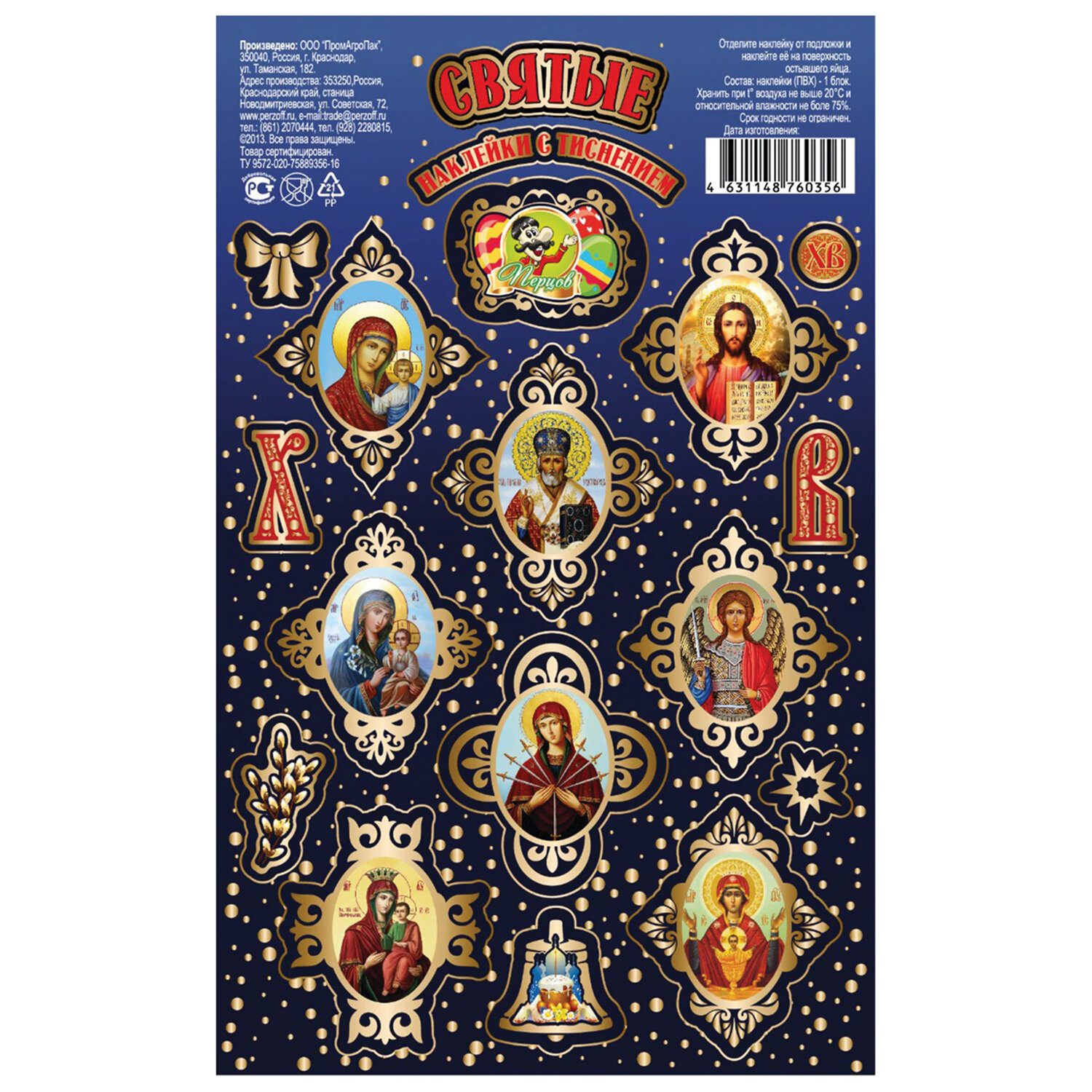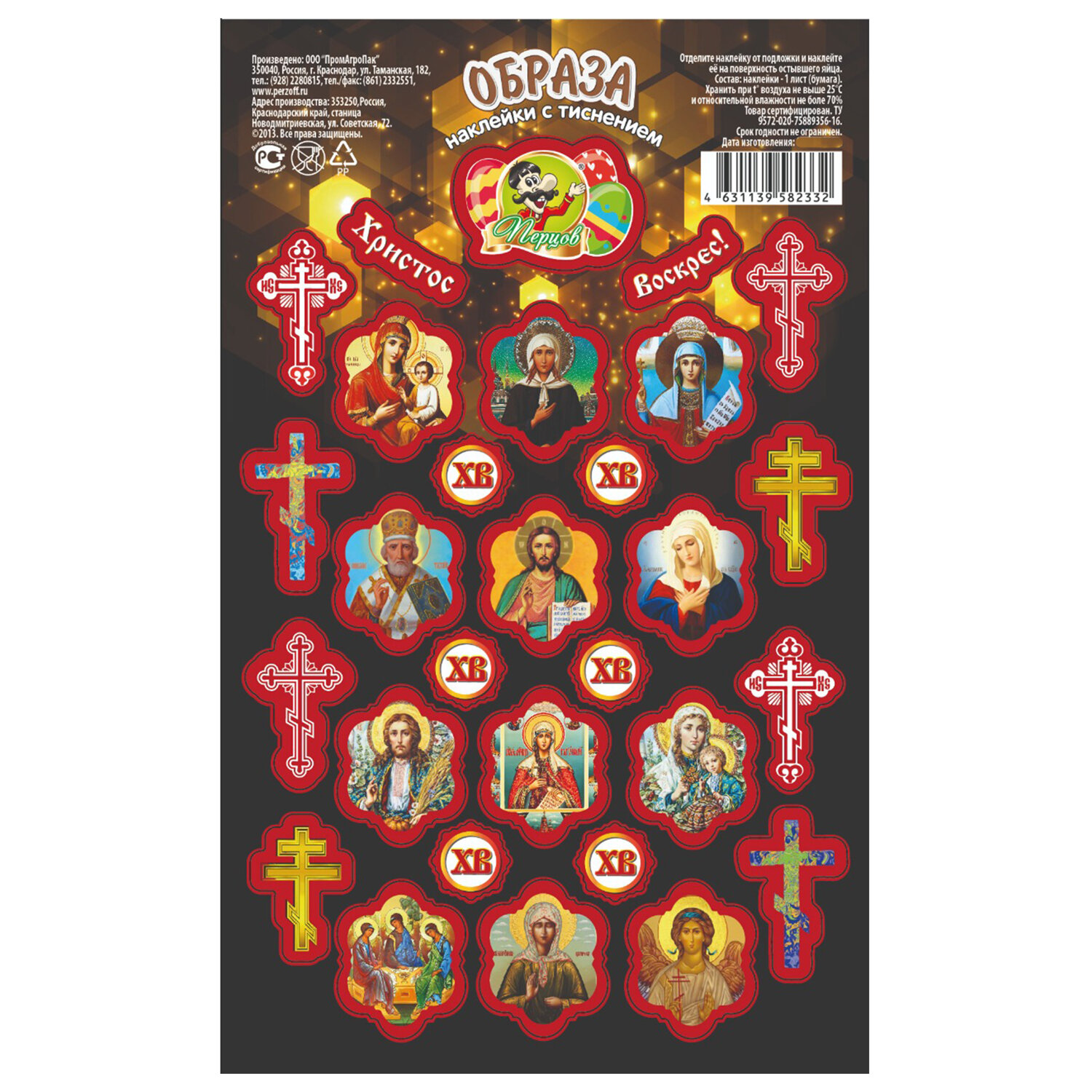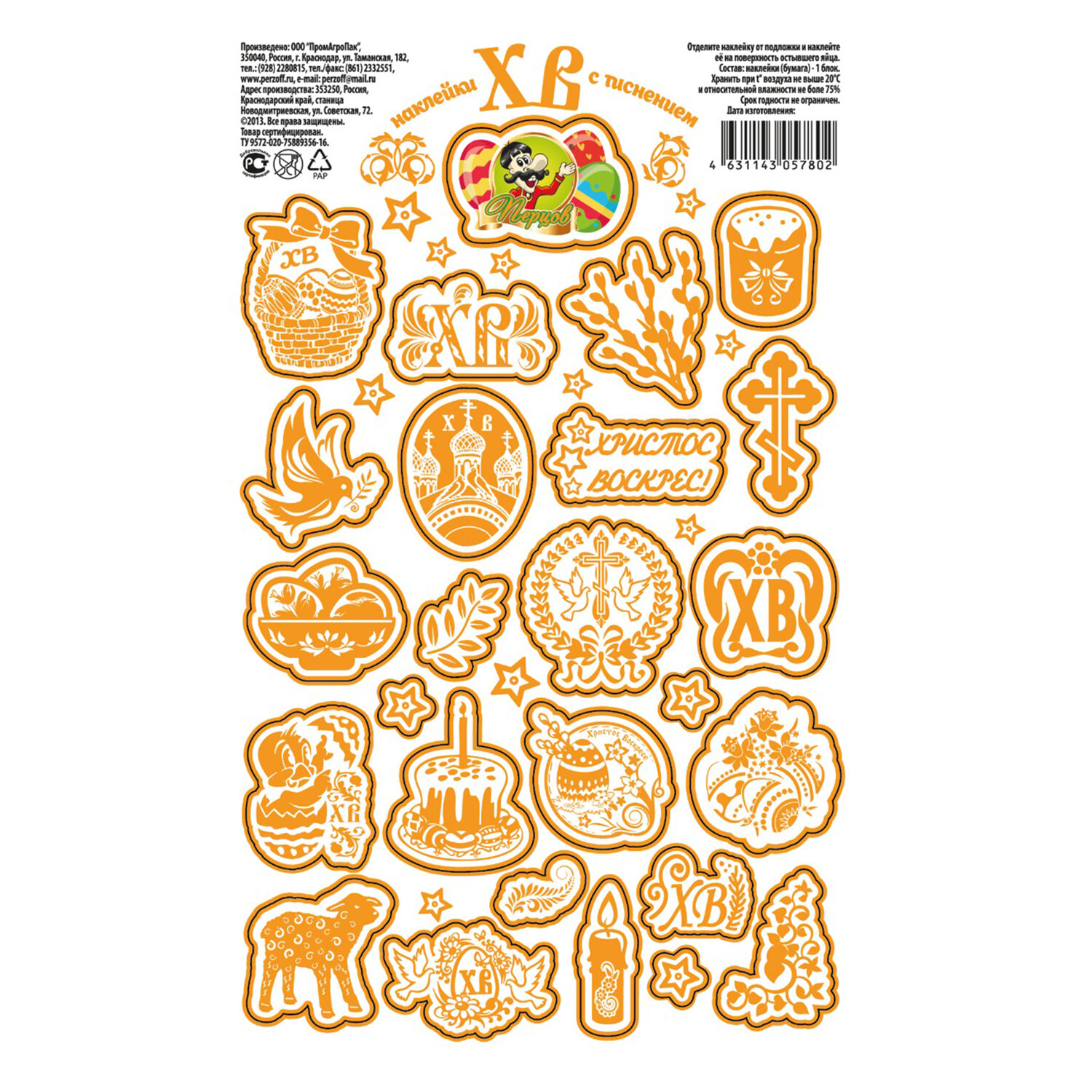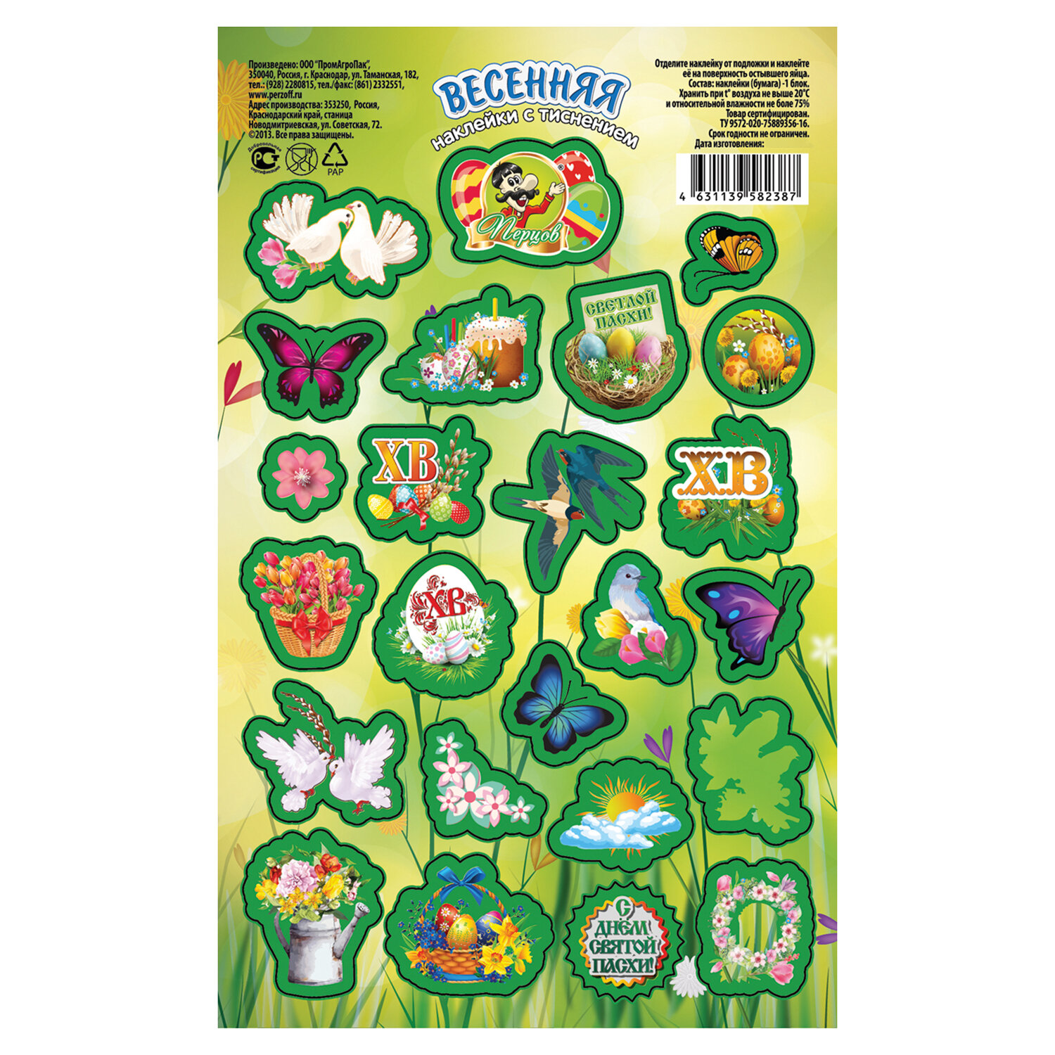 Наклейки пасхальные с тиснением "Пасхальные мотивы", дизайны ассорти, 0806, 0670, 0797, 0812, 0669 Код товара: 592666 40,68 ₽ Купить Производитель:ПЕРЦОВ Украсьте пасхальные яйца легко и красиво с набором наклеек пасхальных "Пасхальные мотивы"! На листе форматом 17х10,5 см расположены наклейки в традиционных пасхальных дизайнах (поставляются в 5 дизайнах ассорти, без возможности выбора). Яркие краски и праздничные мотивы мгновенно создадут атмосферу весны и радости. Наклейки выполнены на самоклеящейся бумаге с частичным покрытием глиттер – просто оторвите по контуру и приклейте! Идеально подходят не только для украшения пасхальных яиц, но и для множества других идей, таких как декор формы для кулича, оформление подарков, творчество с детьми, скрапбукинг и т.д.Производство: РоссияТип товара: наклейки пасхальныеМатериал: бумага, ПВХРазмер: 17х10,5 смКоличество в комплекте: 1 шт.Дизайн: Пасхальные мотивыВес: 3 грРазмер упаковки: 0.1 × 17.8 × 11.3 смПромежуточная упаковка: 25 штТранспортная упаковка: 400 штШтрих-код: 4631179156906 Сертификат-1.jpg Сертификат-2.jpg Сертификат-3.jpg