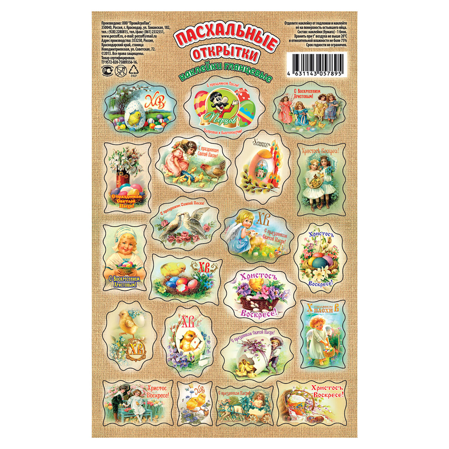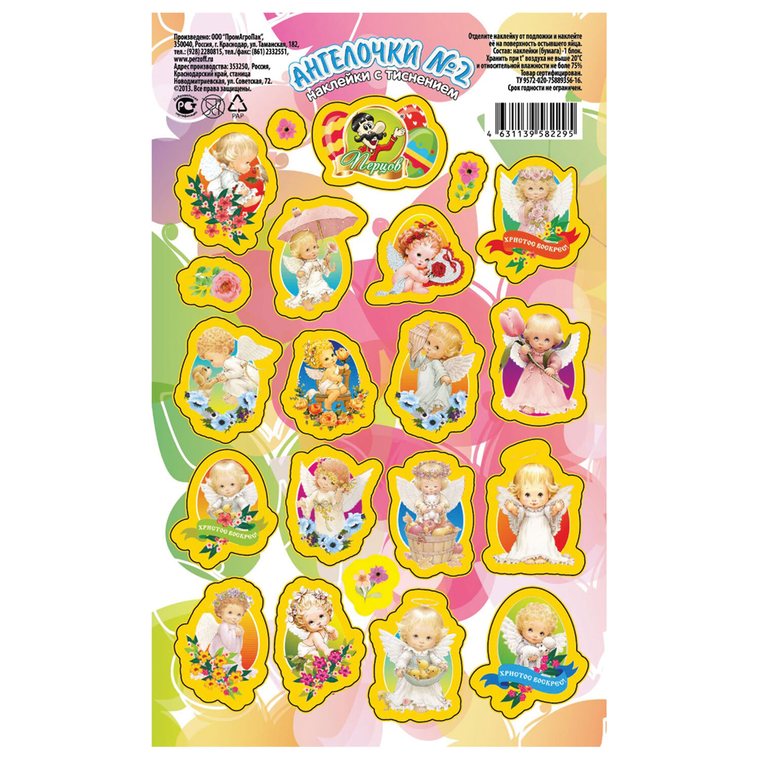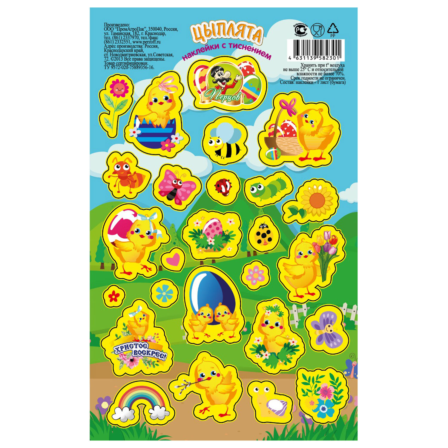 Наклейки пасхальные, "Весенние радости", дизайны ассорти, 0675, 0676, 0684, 0689, 0673 Код товара: 592667 40,68 ₽ Купить Производитель:ПЕРЦОВ Украсьте пасхальные яйца легко и красиво с набором наклеек пасхальных "Весенние радости"! На листе форматом 17х10,5 см расположены наклейки в традиционных пасхальных дизайнах (поставляются в 5 дизайнах ассорти, без возможности выбора). Яркие краски и праздничные мотивы мгновенно создадут атмосферу весны и радости. Наклейки выполнены на самоклеящейся бумаге с частичным покрытием глиттер – просто оторвите по контуру и приклейте! Идеально подходят не только для украшения пасхальных яиц, но и для множества других идей, таких как декор формы для кулича, оформление подарков, творчество с детьми, скрапбукинг и т.д.Производство: РоссияТип товара: наклейки пасхальныеМатериал: бумага, ПВХРазмер: 17х10,5 смКоличество в комплекте: 1 шт.Дизайн: Весенние радостиВес: 3 грРазмер упаковки: 0.1 × 17.4 × 10.6 смПромежуточная упаковка: 25 штТранспортная упаковка: 400 штШтрих-код: 4631139582301 Файлы Сертификат-1.jpg Сертификат-2.jpg Сертификат-3.jpg