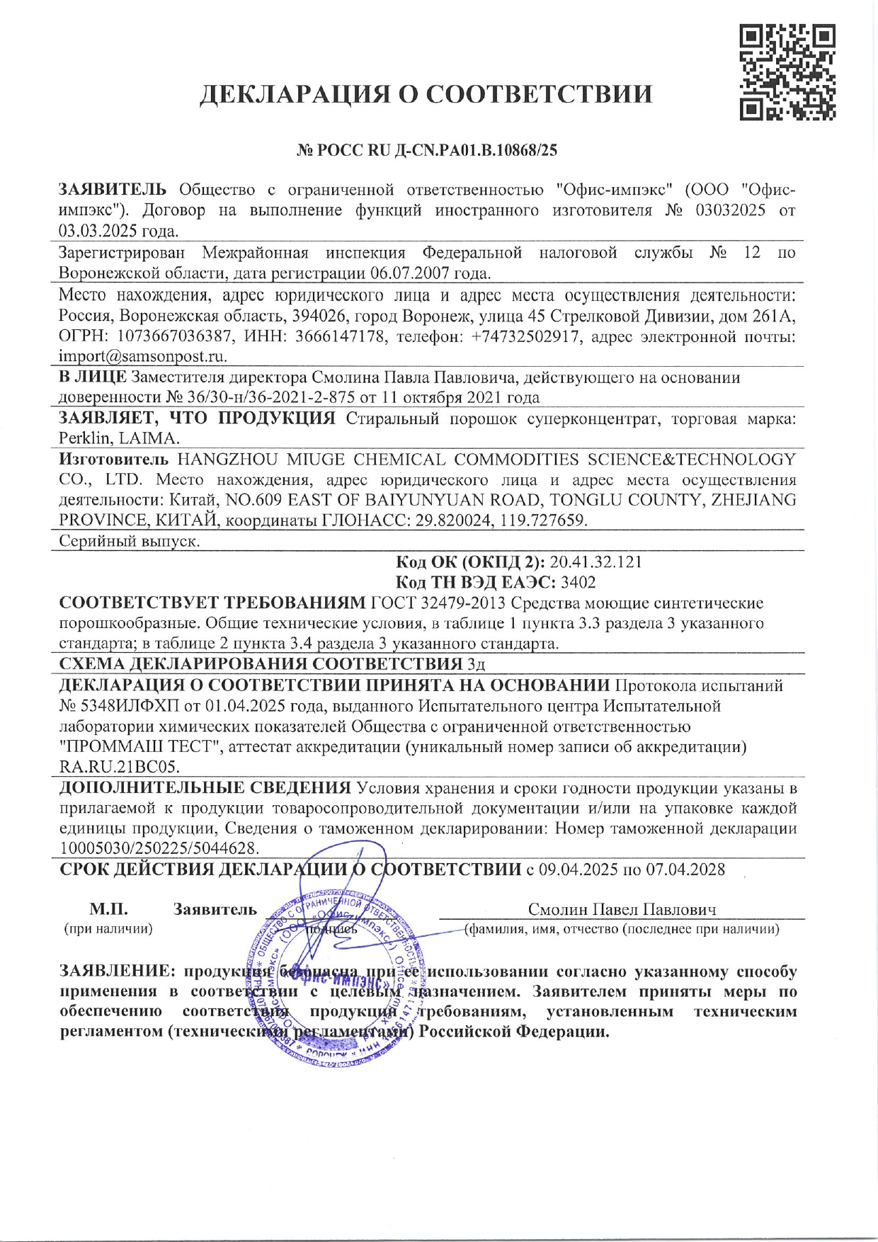 Стиральный порошок суперконцентрат 66 стирок, с пятновыводителем, 1 кг, PERKLIN (ПЕРКЛИН) SUPER, мерная ложка, 609773 Код товара: 609773 379,26 ₽ Купить Производитель:PERKLIN Стиральный порошок-суперконцентрат PERKLIN SUPER – это инновационное средство для стирки белого, черного и цветного белья из хлопчатобумажных, льняных, синтетических тканей, а также тканей из смешанных волокон. Благодаря высокой концентрации активных компонентов вам потребуется в 10 раз меньше средства на стирку по сравнению с обычным стиральным порошком. Маленькие измельченные крупинки порошка полностью растворяются в воде всего за 2 минуты, обеспечивая быстрый и эффективный процесс стирки. За счет удобной ложки в комплекте одной упаковки стирального порошка суперконцентрата PERKLIN SUPER хватит до 66 стирок в стиральной машине, что делает его экономичным выбором для длительного использования. Состав: менее 30% сульфат натрия, 5-15% анионного поверхностно-активного вещества, 5-15% карбонат натрия, 5-15% силикат натрия.Производство: КитайТип: универсальныйВес/Объем: 1000 г/млВид средства: порошокНазначение: для стирки цветных и белых изделий из любых видов ткани (кроме шерсти и шёлка)Отдушка: без отдушкиСерия: SUPERpH: 10.5Вид упаковки: ведроСрок годности: 60 месВес: 1,15 кгРазмер упаковки: 11.2 × 15.5 × 11.1 смОбъём: 0.0026 м3Промежуточная упаковка: 12 штТранспортная упаковка: 12 штШтрих-код: 4606224456911 Сертификат-1.jpg Сертификат-2.jpg