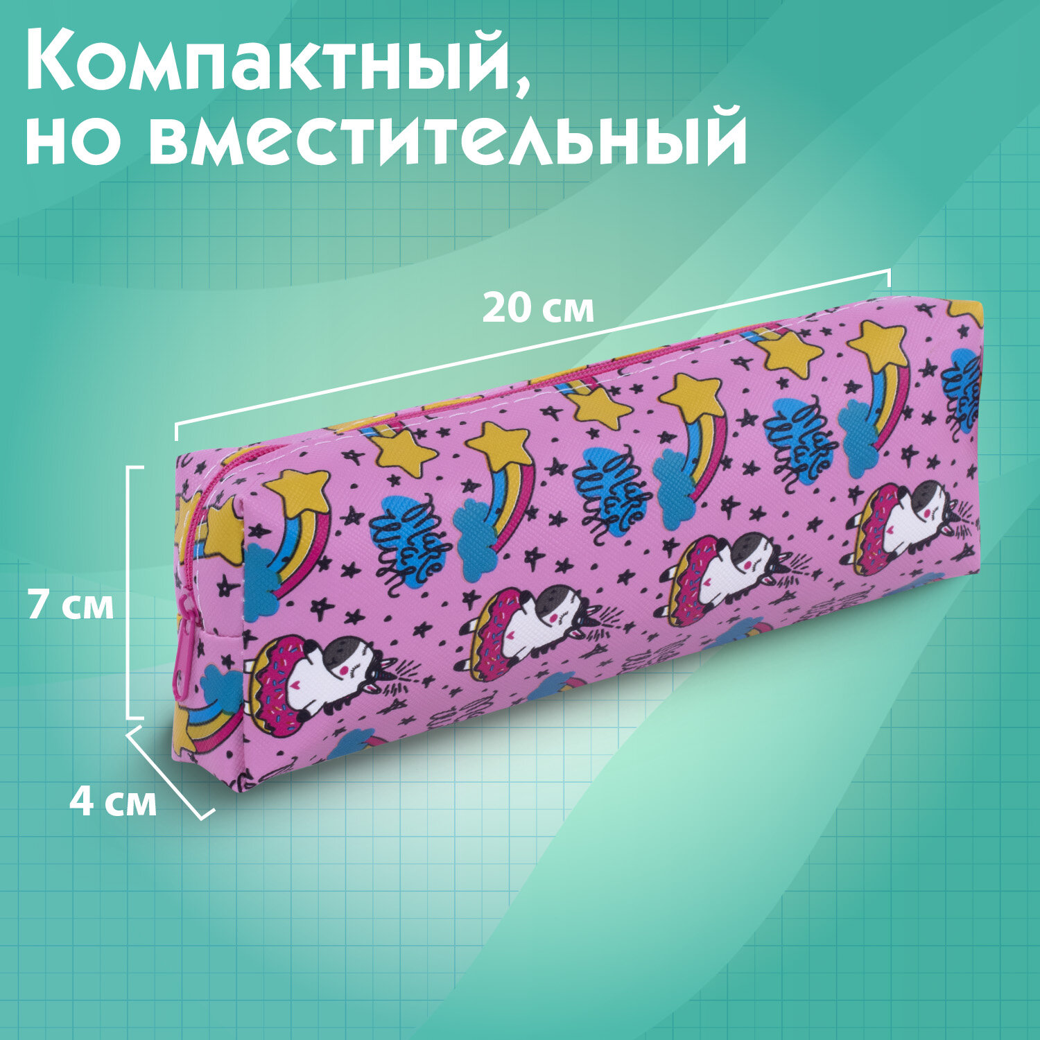 Пенал-косметичка ПИФАГОР, мягкий, "UNICORN", прямоугольный, 20х7х4 см Код товара: 229265 138,72 ₽ Купить Производитель:ПИФАГОР Пенал-косметичка ПИФАГОР выполнен из прочного мягкого материала. Вмещает до 40 канцелярских принадлежностей стандартных размеров. Надежная молния оснащена удобным металлическим бегунком. Материал пенала - ПВХ с цветной печатью и ярким дизайном. Пенал имеет оптимальный размер для размещения в нем не только письменных принадлежностей, но и повседневных мелочей, косметики, аксессуаров, таким образом может выполнять роль универсальной сумочки-косметички, которую можно всегда взять с собой. Удобно открывать и закрывать, держась за металлический бегунок. Упакован в ПЭТ пакет с европодвесом, который сохранит качество и товарный вид при хранении и транспортировке.Производство: КитайТип товара: пенал-косметичкаЗастежка: молнияНазначение: для девочекКоличество отделений: 1Материал: ПВХСерия: DELIGHTДизайн: ЕдинорогБазовый цвет: розовыйДлина: 20 смШирина: 7 смУпаковка: индивидуальная с европодвесомВес: 29 грРазмер упаковки: 2.5 × 20.5 × 10.3 смОбъём: 0.0005 м3Промежуточная упаковка: 24 штТранспортная упаковка: 144 штШтрих-код: 4606224265285 Сертификат-1.jpg Сертификат-2.jpg Сертификат-3.jpg
