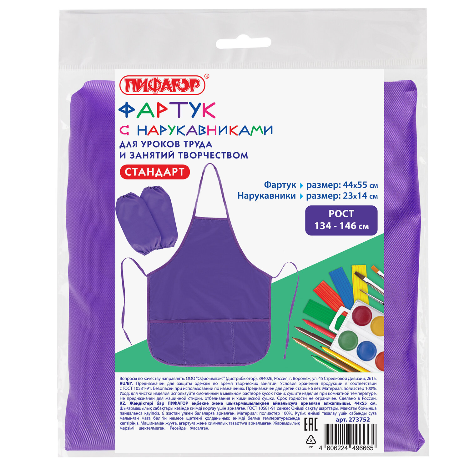 Фартук с нарукавниками для уроков труда ПИФАГОР, 3 кармана, стандартный размер, 44x55 см, фиолетовый Код товара: 273752 194,01 ₽ Купить Производитель:ПИФАГОР Фартук с нарукавниками для уроков труда ПИФАГОР – незаменимая вещь для защиты одежды во время уроков труда и занятий творчеством в школе, детском саду и дома. Предусмотрен для многоразового использования. Фартук и нарукавники изготовлены из водоотталкивающего полиэстера. Стандартный размер фартука – 55х44 см, размер нарукавников – 23х14 см. Крепление фартука на завязках. Кроме того, фартук оснащен 3 карманами для канцелярии и прочих принадлежностей, которые всегда должны быть под рукой во время уроков труда и занятий творчеством. Нарукавники оснащены резинкой с обеих сторон. Фартук и нарукавники помогают защитить одежду ребенка от загрязнений во время занятий трудом и творчеством. Набор упакован в прозрачный пакет с европодвесом в сложенном виде. Заметная яркая этикетка с основной информацией о товаре выделяет его в магазине.Производство: РоссияПредназначение: универсальныйКоличество карманов: 3 шт.Комплектуется нарукавниками: даШирина: 44 смВысота: 55 смВодоотталкивающая пропитка: даСерия: STANDARDВозрастная группа: 7-10 летДизайн: MEDIUMЦвет: фиолетовыйМатериал: полиэстерУпаковка: прозрачный пакет с европодвесомВес: 57 грРазмер упаковки: 1.5 × 16.4 × 18.1 смОбъём: 0.0005 м3Промежуточная упаковка: 30 штТранспортная упаковка: 30 штШтрих-код: 4606224496665 Сертификат-1.jpg Сертификат-2.jpg Сертификат-3.jpg