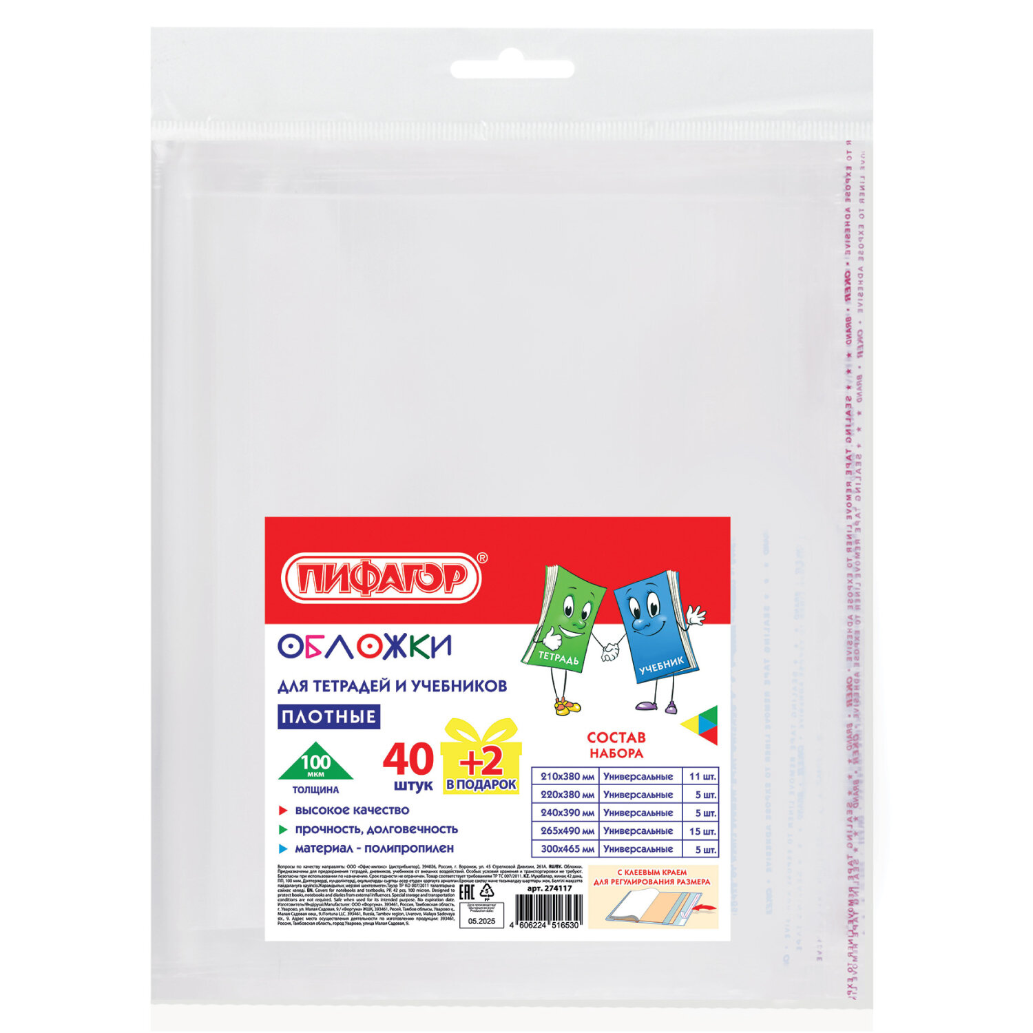 Обложки ПП для тетрадей и учебников, КЛЕЙКИЙ КРАЙ, НАБОР 40+2 шт. в ПОДАРОК, ПЛОТНЫЕ, 100 мкм, ПИФАГОР Код товара: 274117 525,81 ₽ Купить Производитель:ПИФАГОР Прозрачные обложки ПИФАГОР отлично предохраняют тетради и учебники от внешних воздействий, тем самым увеличивая срок их службы и сохраняя прекрасный внешний вид. Предназначены для тетрадей и учебников. Прозрачные плотные обложки ПИФАГОР для тетрадей и учебников изготовлены из полипропилена (ПП), толщиной 100 мкм. Благодаря КЛЕЙКОМУ КРАЮ обложка легко регулируется по ширине. В наборе следующие обложки: • 300x465 мм – 5 шт., • 265х490 мм – 15 шт., • 240х390 мм – 5 шт., • 220х380 мм – 5 шт., • 210х380 мм – 12 шт.Производство: РоссияПредназначены для: дневников, прописей, рабочих тетрадей, тетрадей, тетрадей А4, учебниковРазмер: 210x380 ммКоличество в комплекте: 42 шт.Регулировка ширины: даМатериал: ППТолщина: 100 мкмТип обложки: глянцеваяНаличие клеевого края: даЦвет: прозрачныйНаличие штрихкода на ед. товара: даВес: 490 грРазмер упаковки: 2.1 × 29.2 × 24.5 смОбъём: 0.0011 м3Промежуточная упаковка: 20 штТранспортная упаковка: 20 штШтрих-код: 4606224516530 Сертификат-1.jpg Сертификат-2.jpg